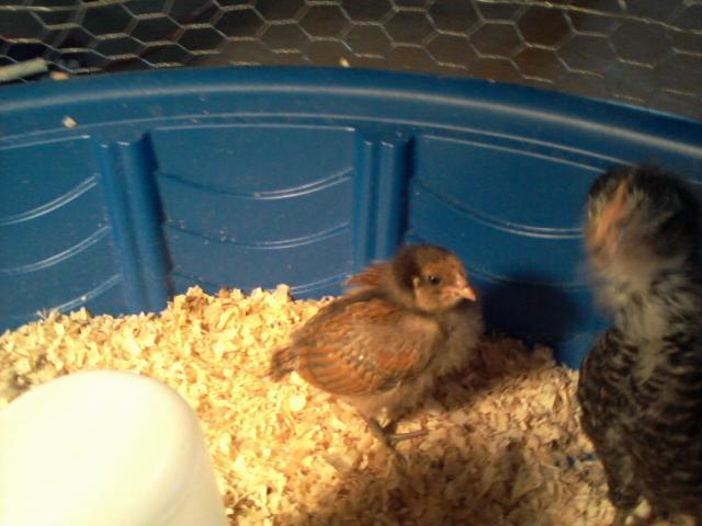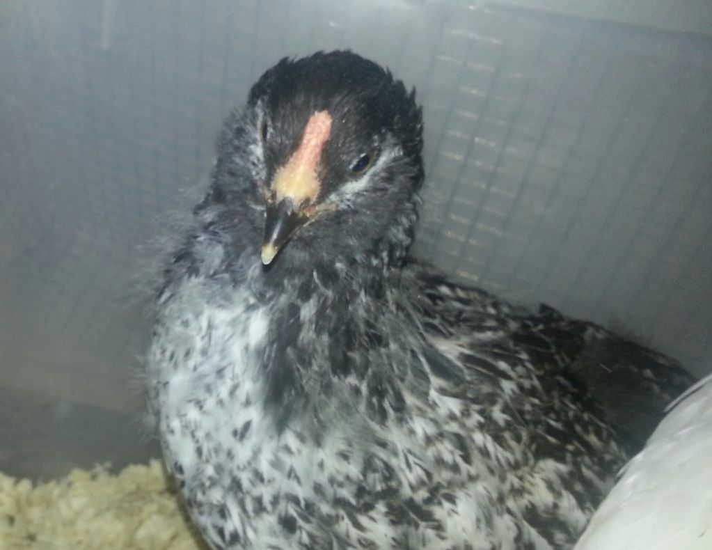 This is him (?) today. In comparing with the black one I have this looks total rooster to me. The legs are thicker too. The black one barely has a comb and it is flesh colored. The flash drowned out the color in this one a little bit in the second picture. I see no red at all on him. Both parents were Ameraucana but he has all the colors together so I would say they are Easter Eggers. Anybody else agree with cockerel or is it too early.