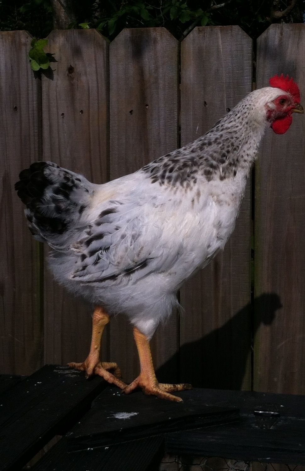 I wonder too. Both birds are from the same place, sold as... you guessed it... white Ameraucanas. Nice ranch, nice people but you aren't allowed to see the adult breeding flock. Most likely due to bio-security issues. The second bird had really thick legs and a taller stance as a little chick. Now they look about even in that regard. I haven't seen any roostering behaviors from either of them, but then a SLW that I got with them (same age) who is *definitely* a boy is probably already making his dominance known. He acts like a rooster!Lots of comb in that first picture, unlike the second bird. With that "down" tail and neck feathers, I wonder what the parents were of the second.
