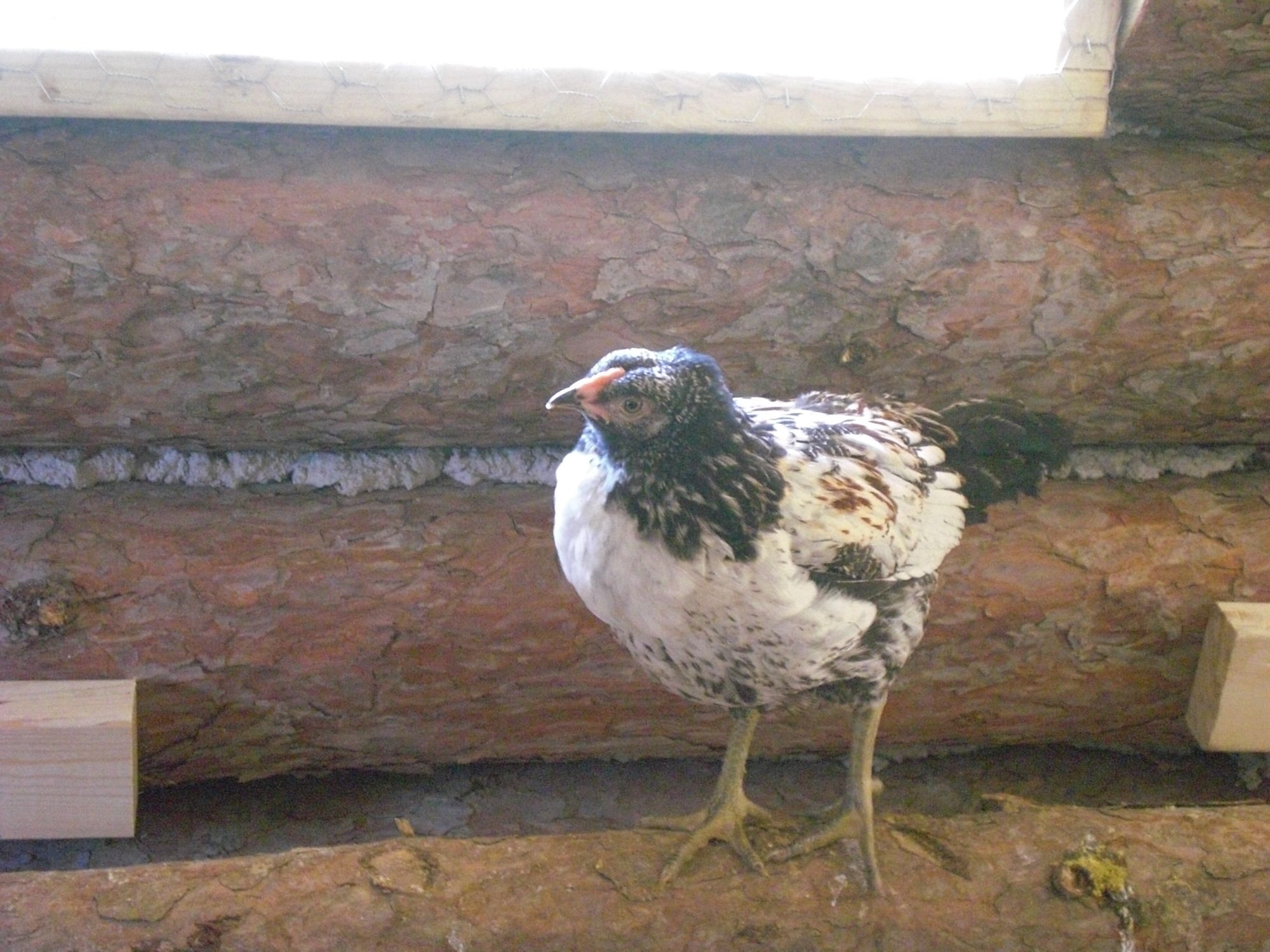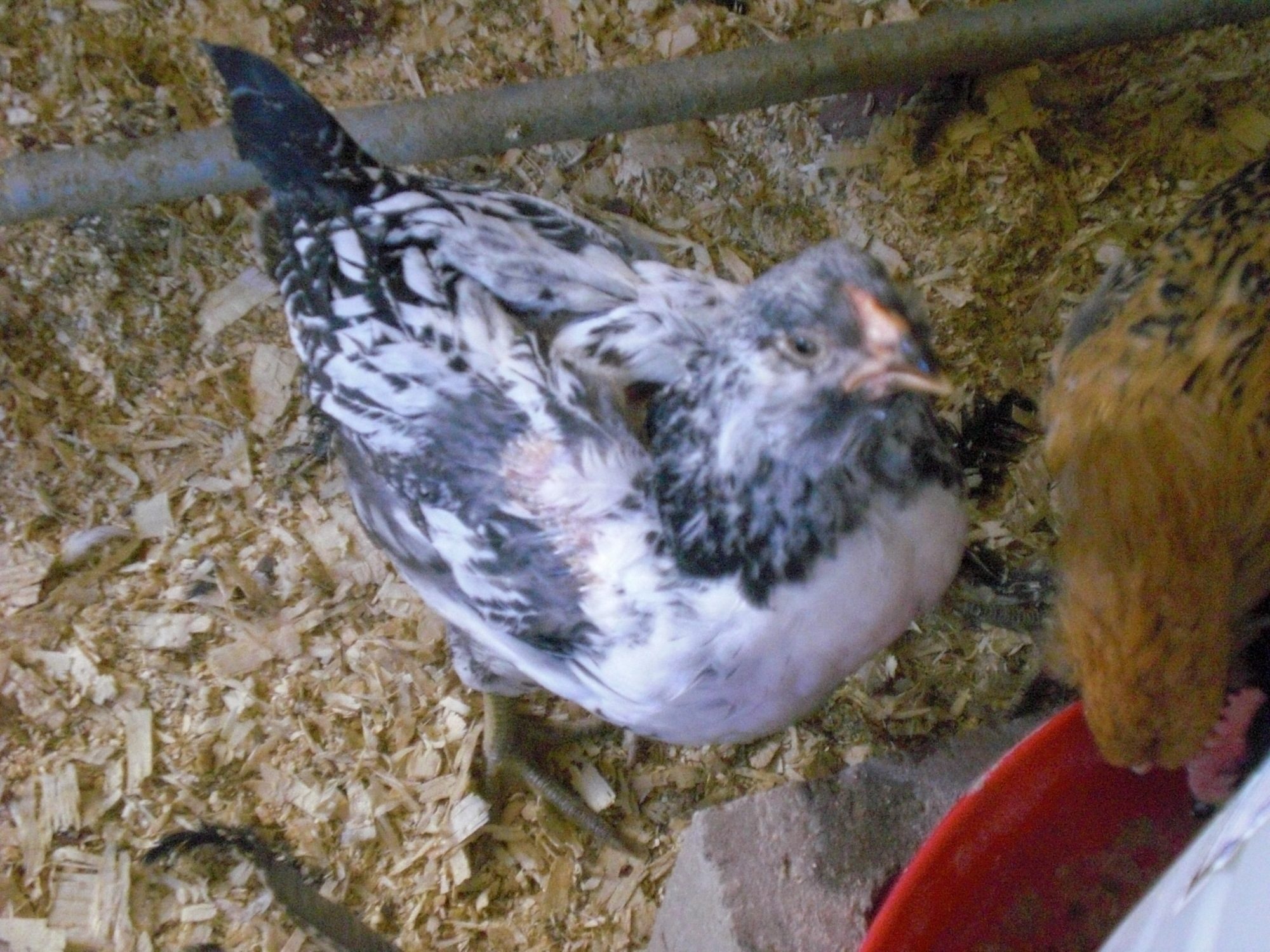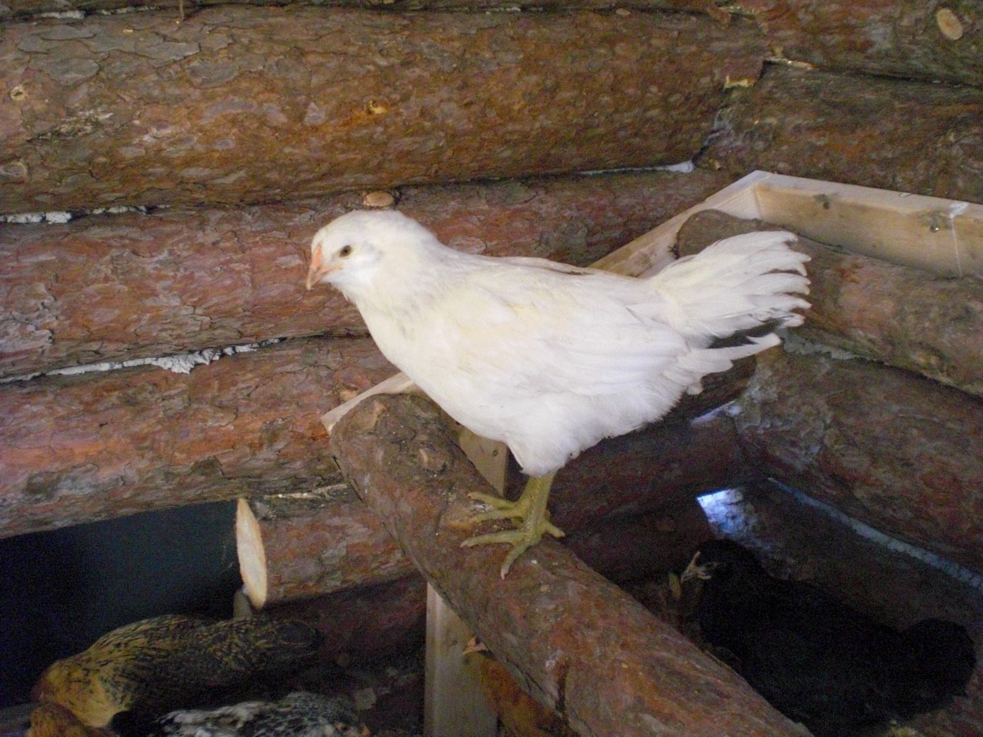 ^This is Snow White. She's all white except for that one black feather in her tail. No pink in her comb at all really, so I am thinking pullet. I tried to get a better shot, but she was really camera shy today.![]()