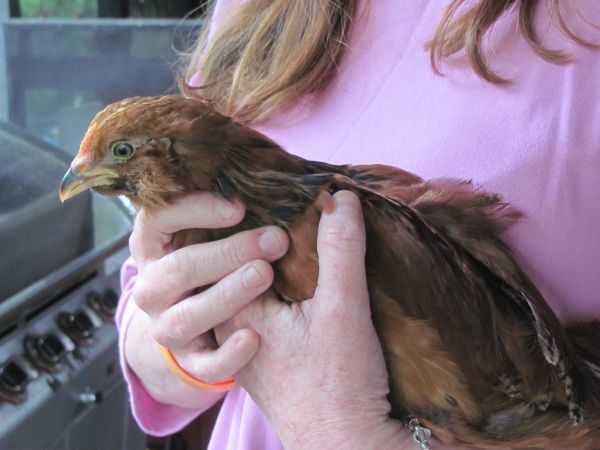 Have you found any pointed feathers in her neck area or her tail area? Her coloring over her body reminds me of Lotus as well- with the orange in the feathers- and that's partridge patterning right? I heard more patchy coloring is more male, and more patterned is female, as well as partridge patterns. How red is her comb in person, in comparison to the other girls?