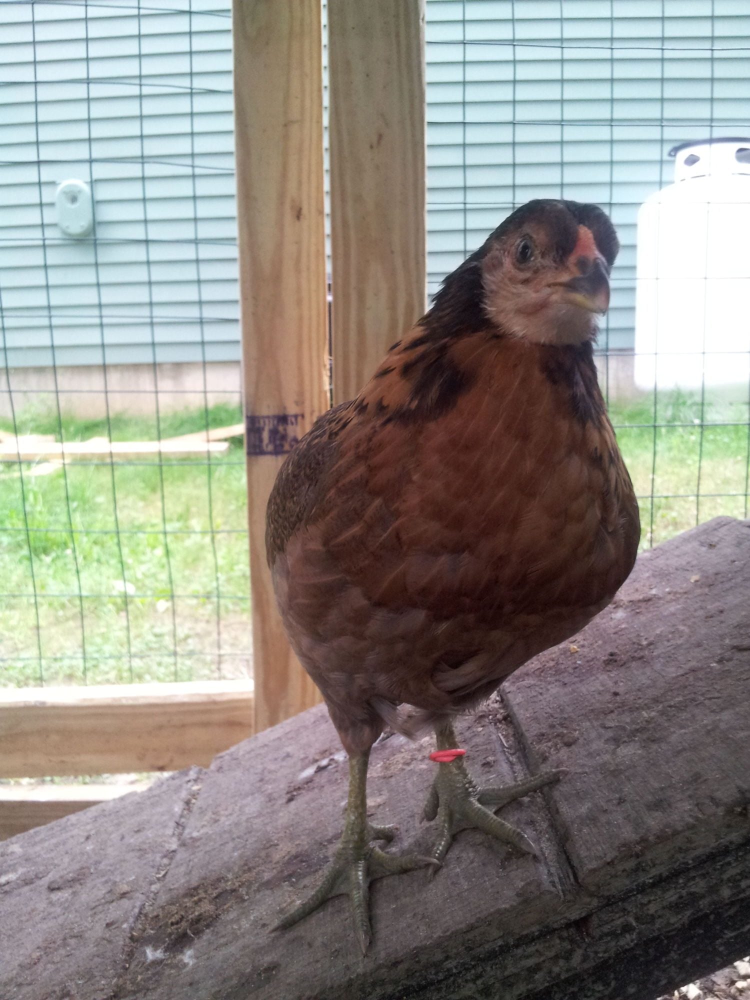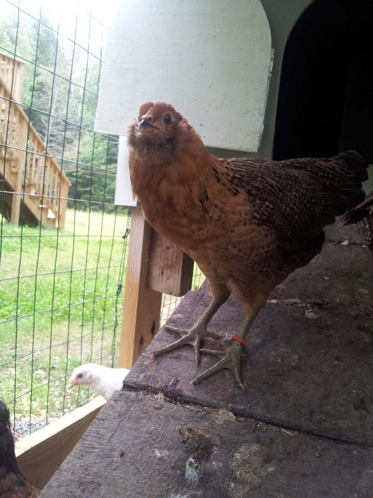 *LILY-A suspected roo-I think I see the "up" tail feathers people are talking about. Dominant but NOT aggressive. He/she was the first to step up when I introduced the girls to the several week older silkies and defend the flock by flapping wings and chasing.