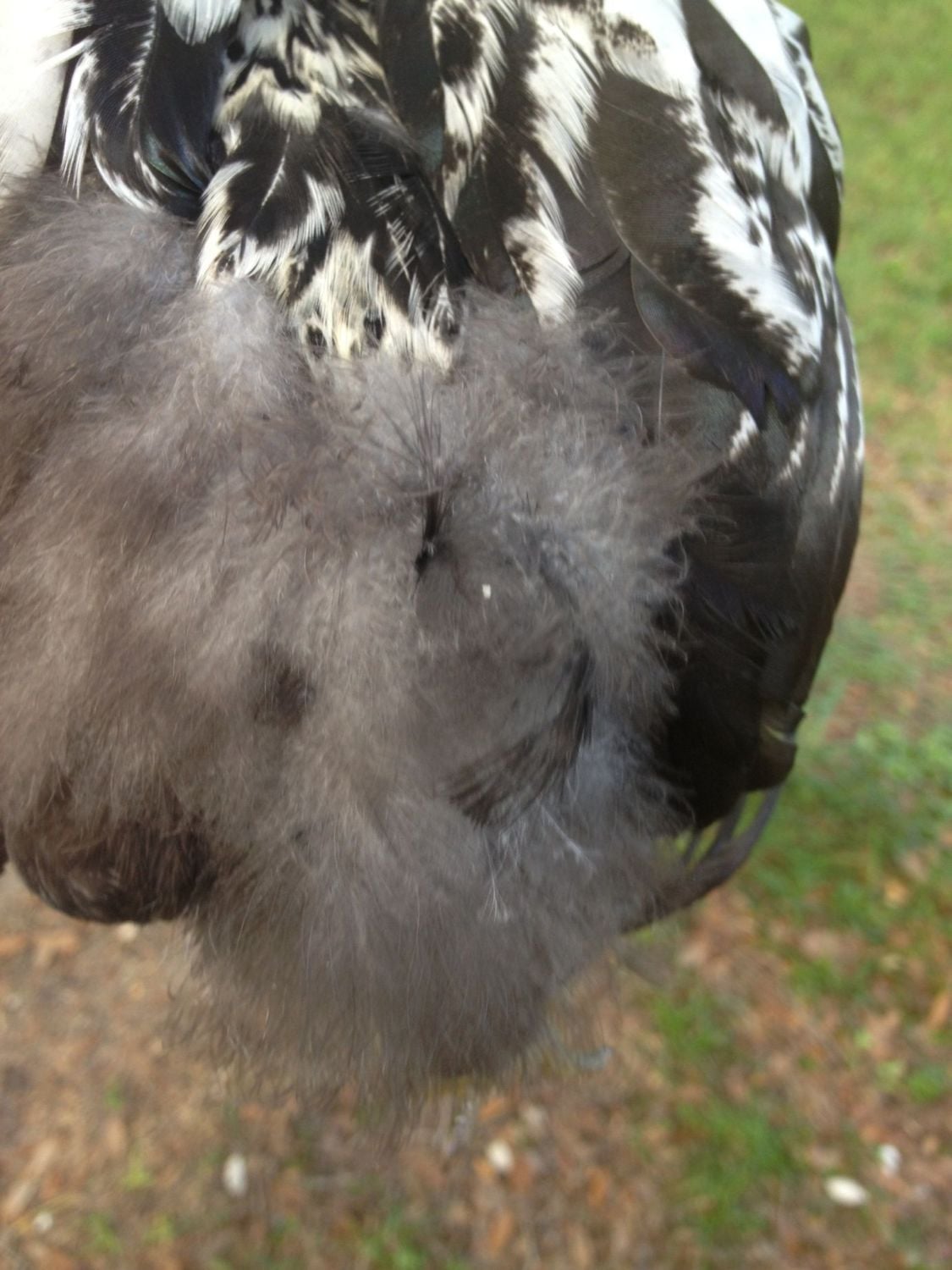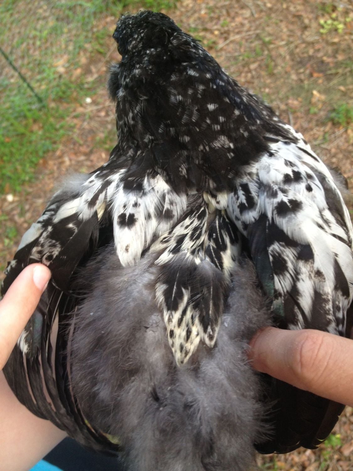 In this photo, my finger on the right side is holding back the feather tract that runs down the spine. My fingers on the left are holding back the wing and the side "pocket" feathers on the chick. These saddle feathers are not visible unless I spread his other feathers out!