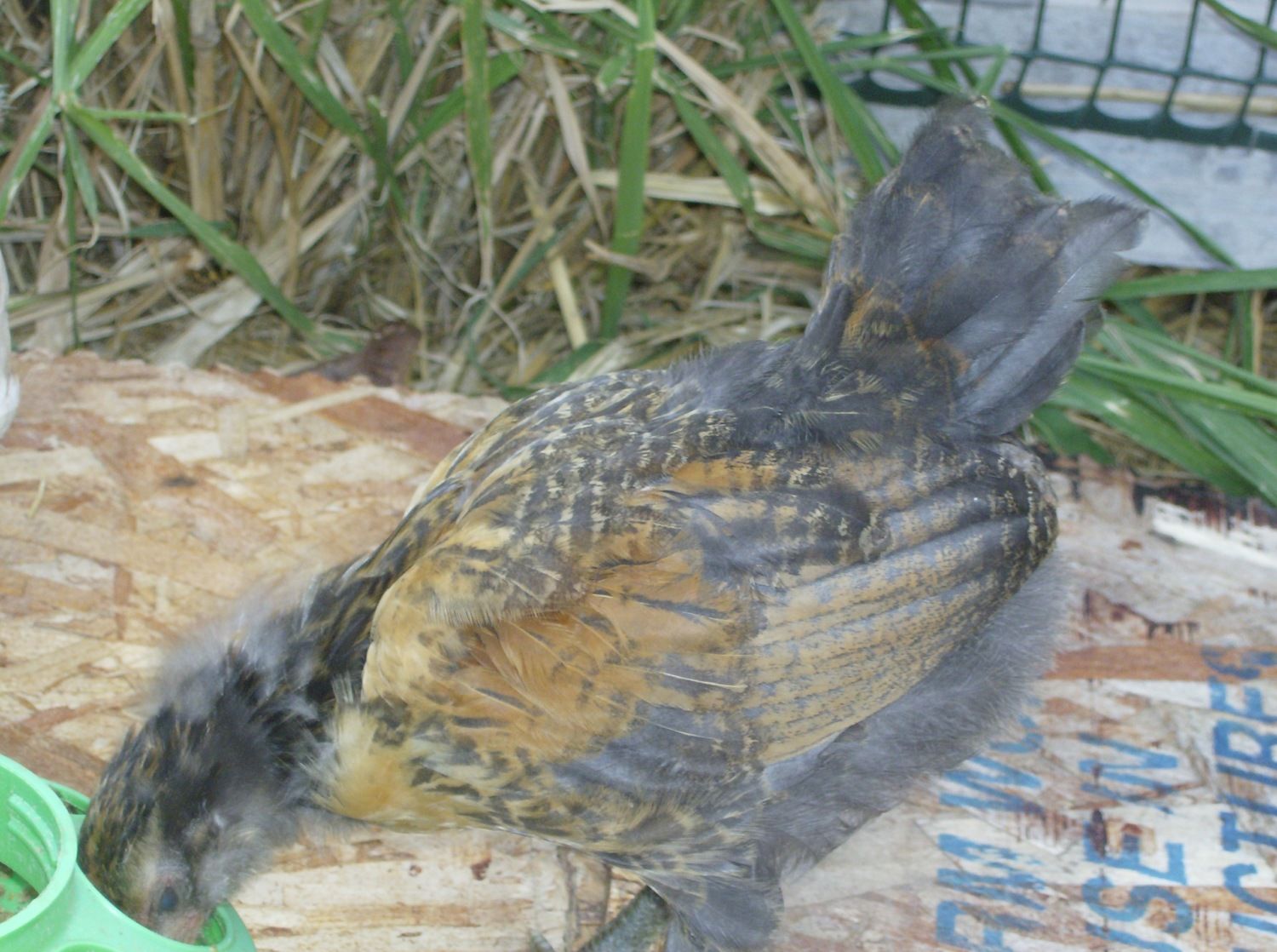I took a photo of the emerging saddle feathers. I could see these feathers developing as pinfeathers two full weeks ago-- so, I knew for sure (in case the crowing didn't give it away) that my chick was a cockerel by the time that he was 8 weeks old simply based on these feathers.