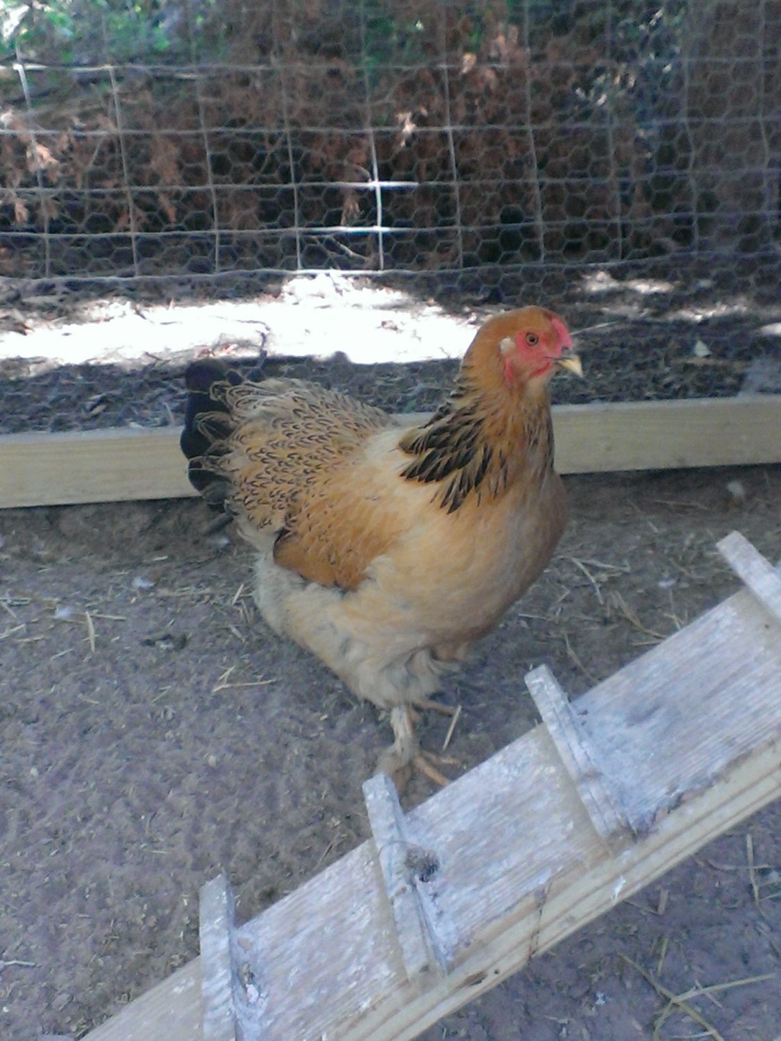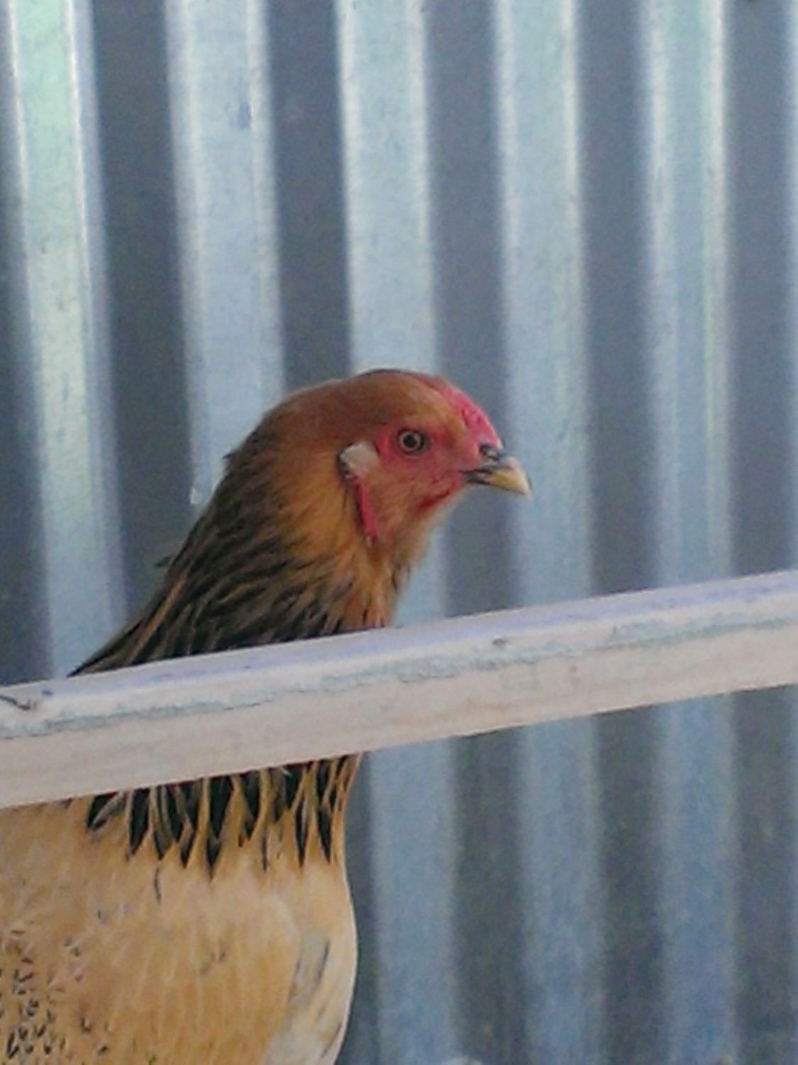 Hi, I have a hen I purchased that looks exactly like that one. no comb or wattles… I mean exactly.. only thing is she has feathers on her grey/blue legs too and while all the other red sex links are happily laying and friendly, she wont let me get NEAR her. What the heck is she?
