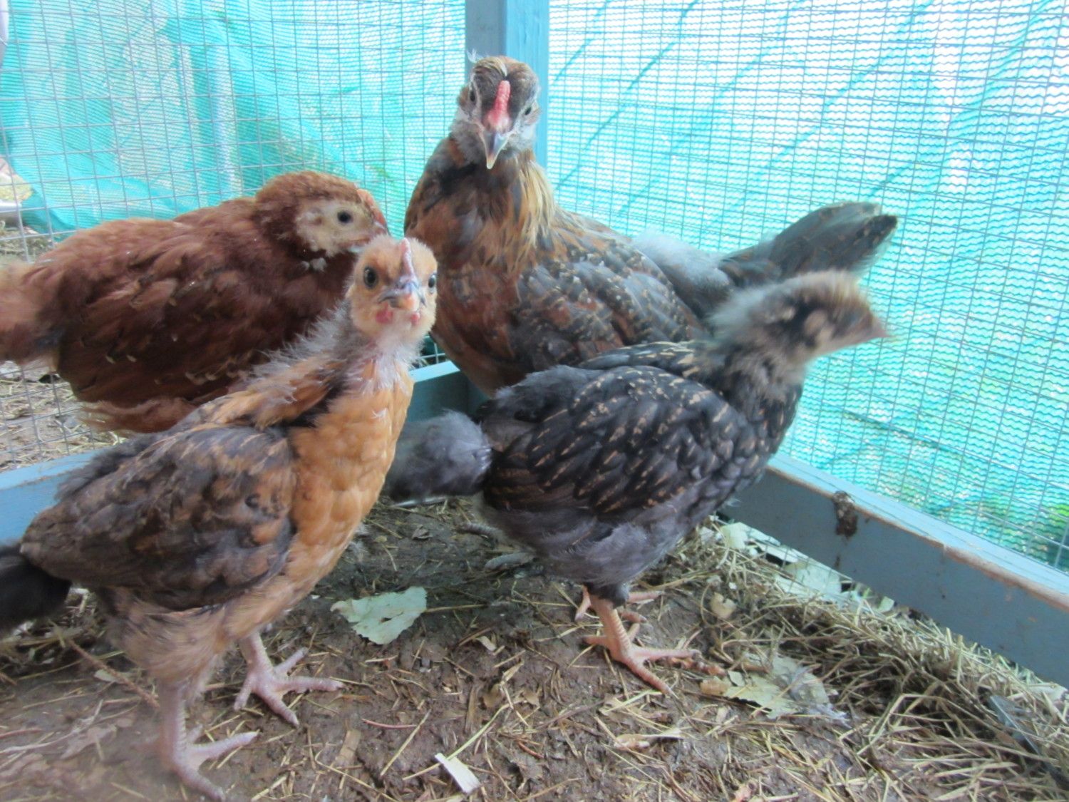 Here is another one of my EE boys - 6 weeks old - hanging with the meat kings and red sex links.