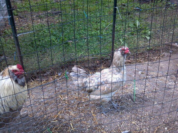 Here's my boys. First, the father, which is my 2+ year old EE from my first ever batch of chickens. He's Mr. Feathers. He's so funny when he walks - his spurs are almost 3 inches long, so he kinda waddles in order to not trip!!