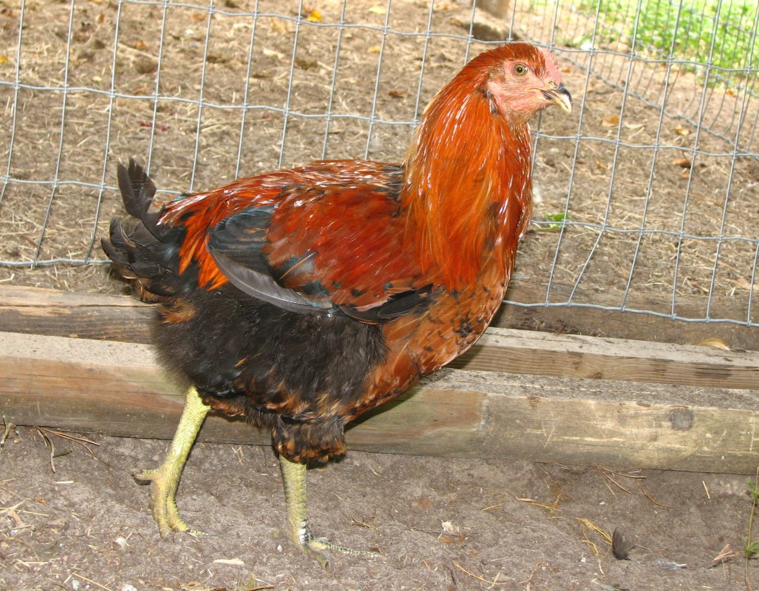 #2 the Red boy in front. Interesting red/black color pattern. (I love the Mr. Feathers/Australorp mix EE pullet behind him - solid black with beard). You can see my fave, the black beard on the ground in the back.