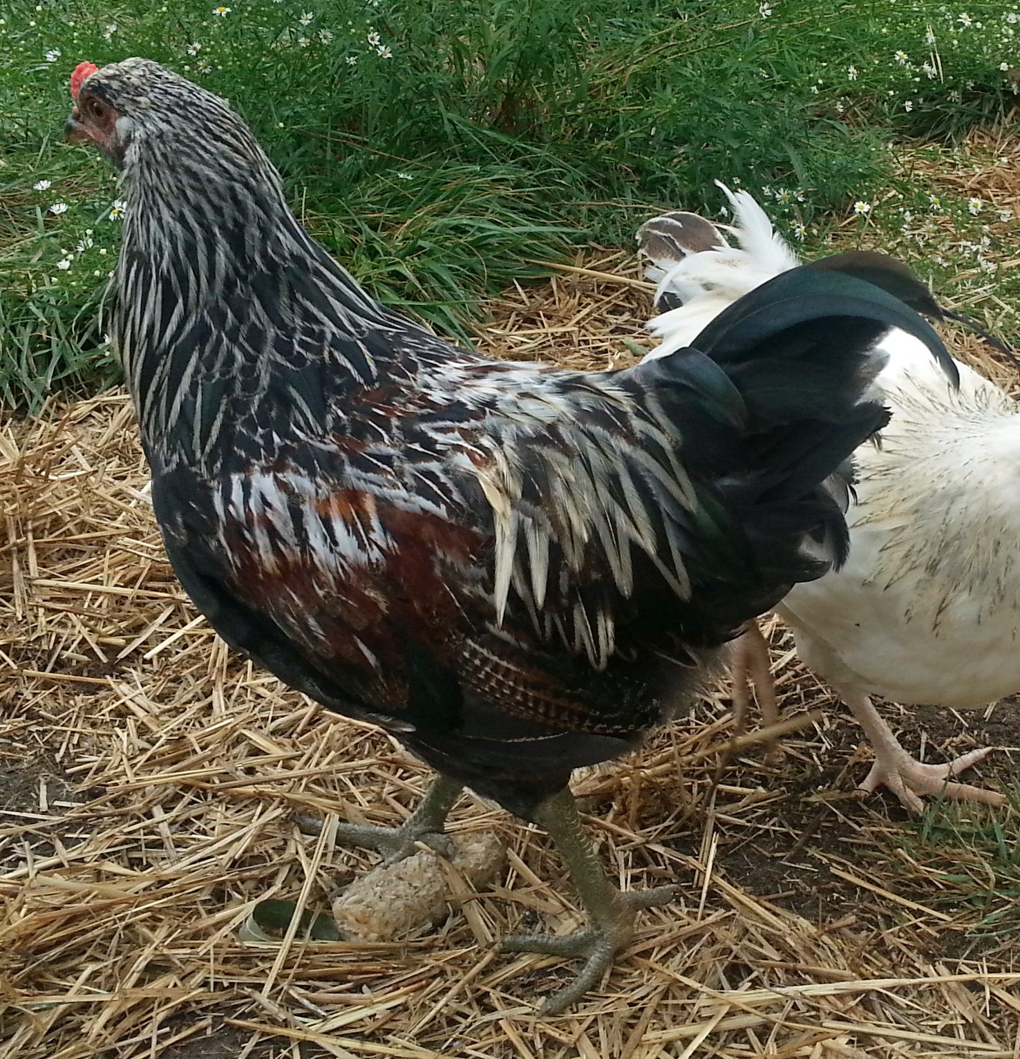 I'll wait it out until I see saddles or a roo crow and then I'll try to find them homes.very pretty boys!These are my EE boys: Elwood (white) and Jake (dark). Elwood's egg mother is a Buff Orpington, and Jake's is an EE. Elwood has the muffs and beard but white legs, and Jake has the green legs but no muffs or beards. Both have the right combs. They are 11 weeks old Thursday. Elwood was crowing in the brooder, but now that he is out with the big girls, he is shyer.This is a better picture of Jake's gorgeous feathering.