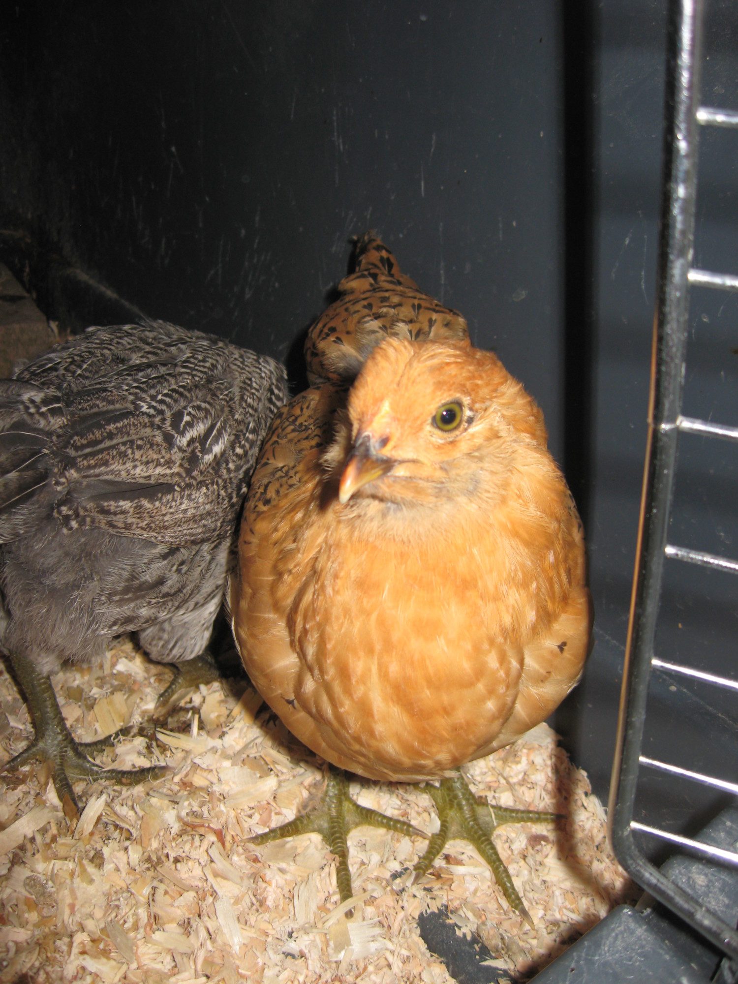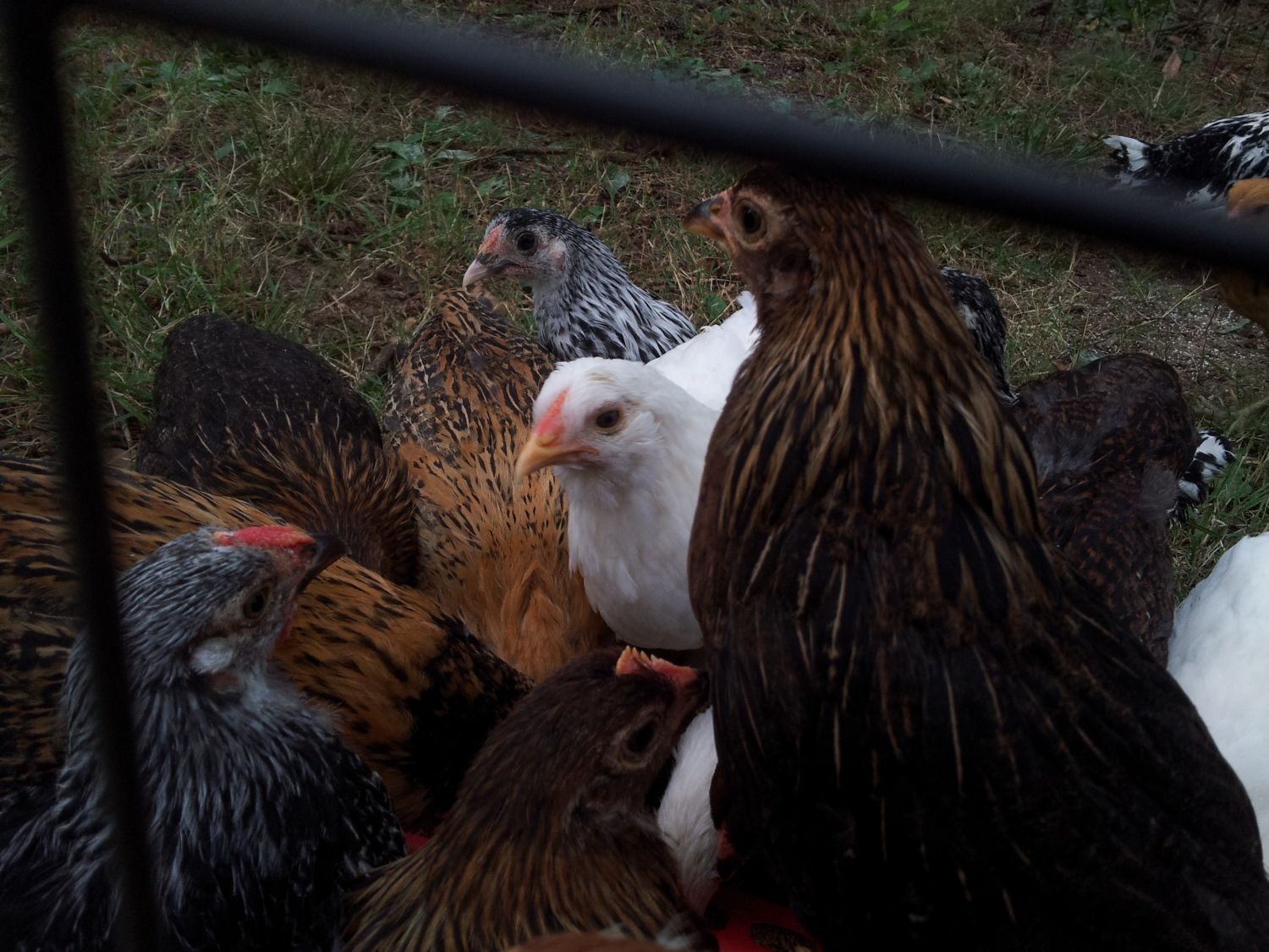 I sent pics of my little flock at 41/2 weeks. Here they are at 10wks. I hatched some chicks as part of our summer science camp in July & decided to keep the hens. I believe I have 3 hens, 2 roosters, and 1 ?? -I just don't know. I have no idea of the breeds - probably mutts - from a rainbow of eggs. (full size - not bantams) I think 3 are Easter-eggers because of the dark legs & coloration. Please let me know if my predictions are correct & if you know what breeds might be in the mix.