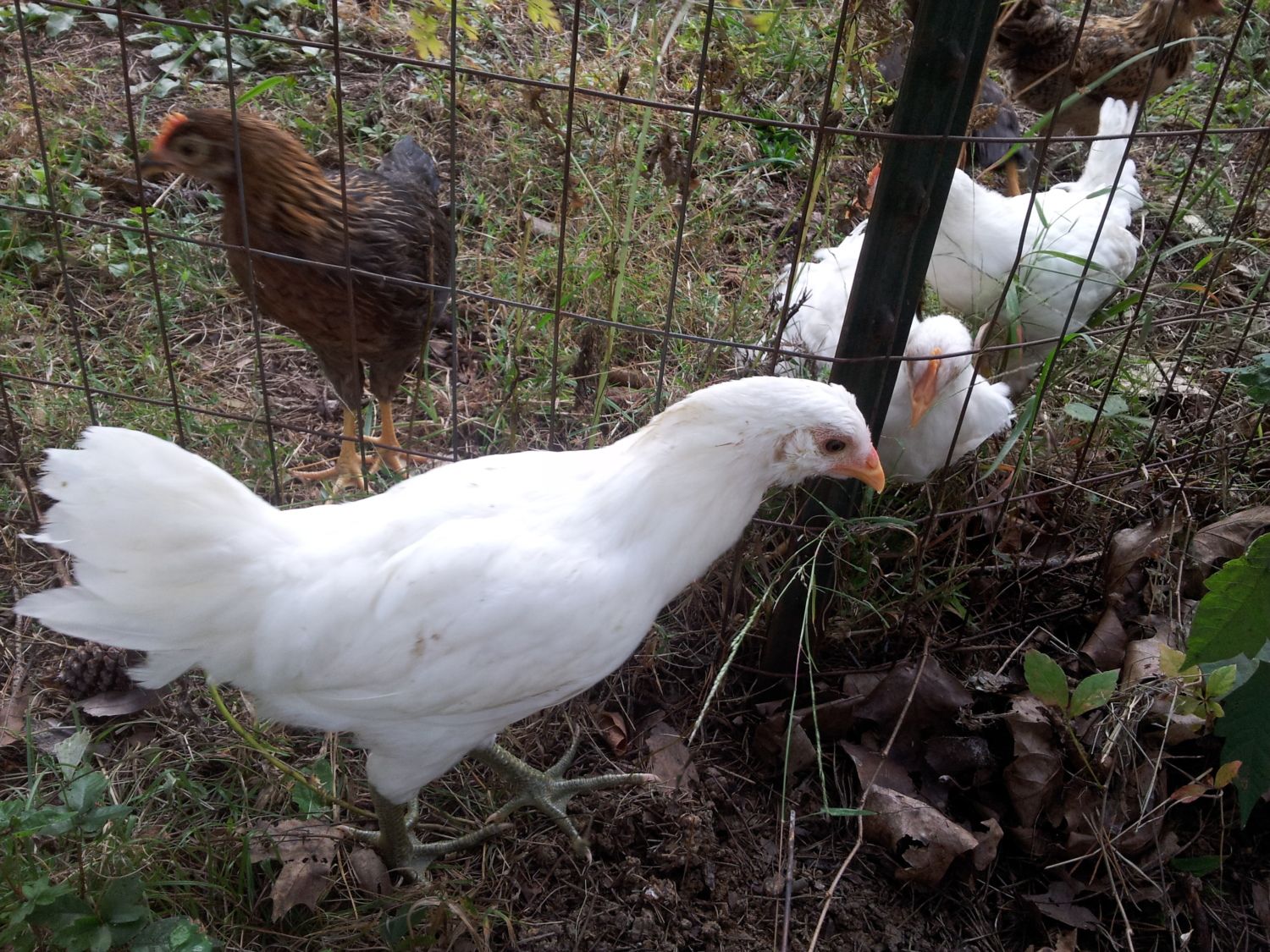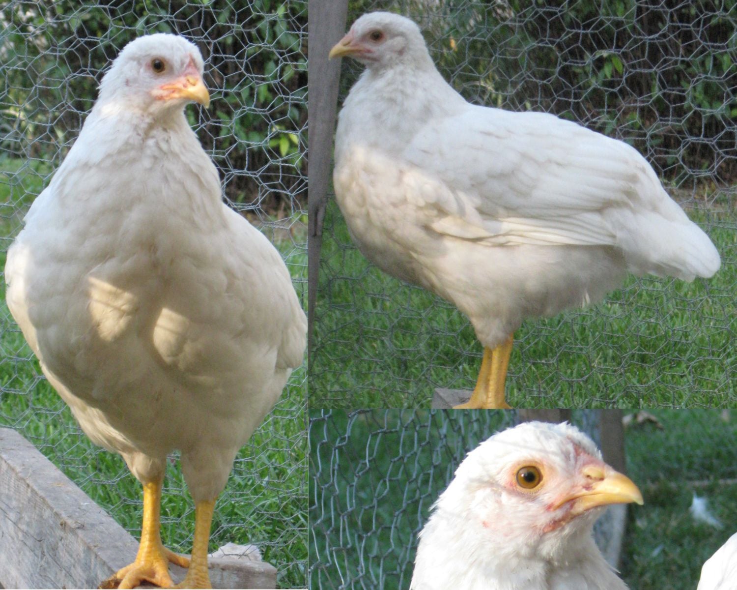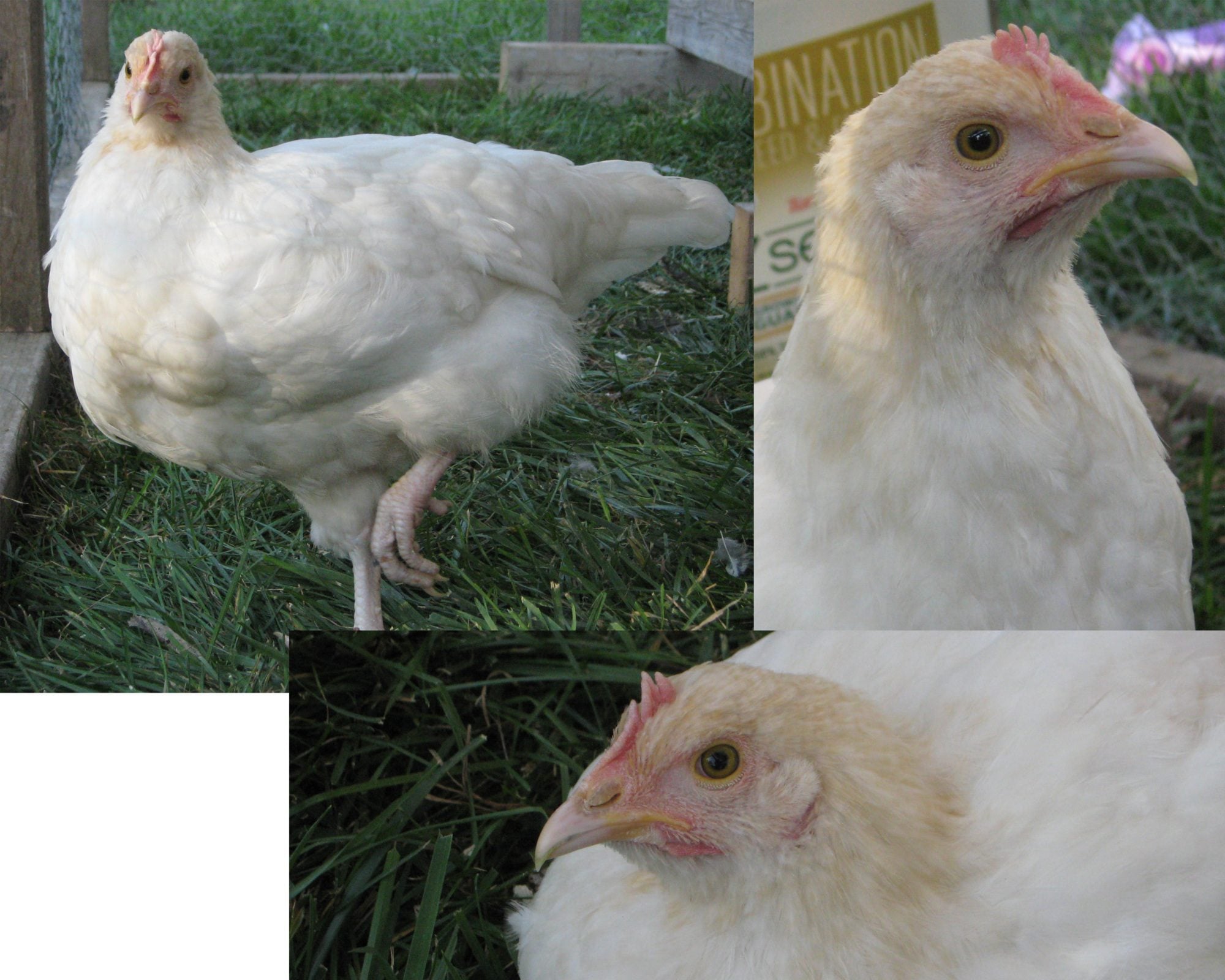 Hen. Large, A lot of "fluff" to her feathers. White with slight buff color on head. Pale legs, beak & comb. Timid around people
