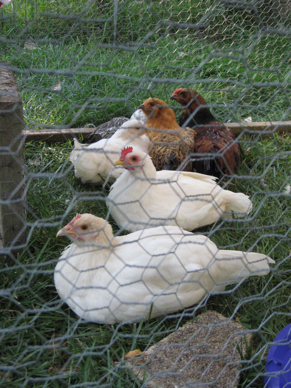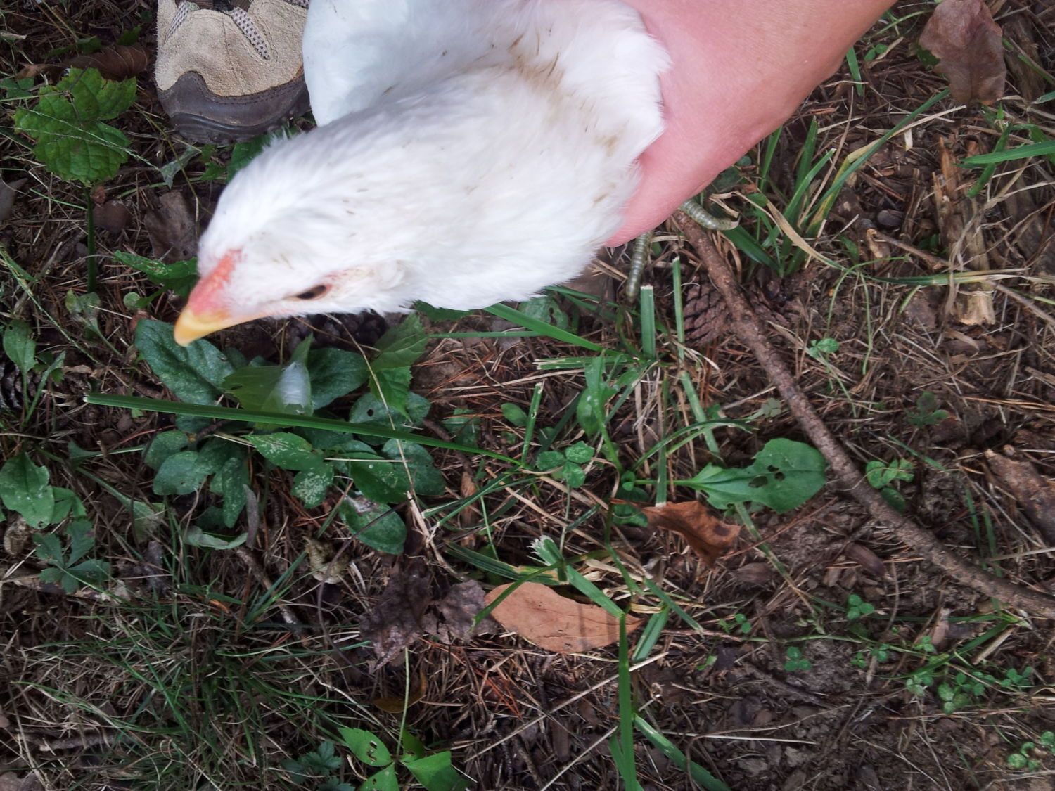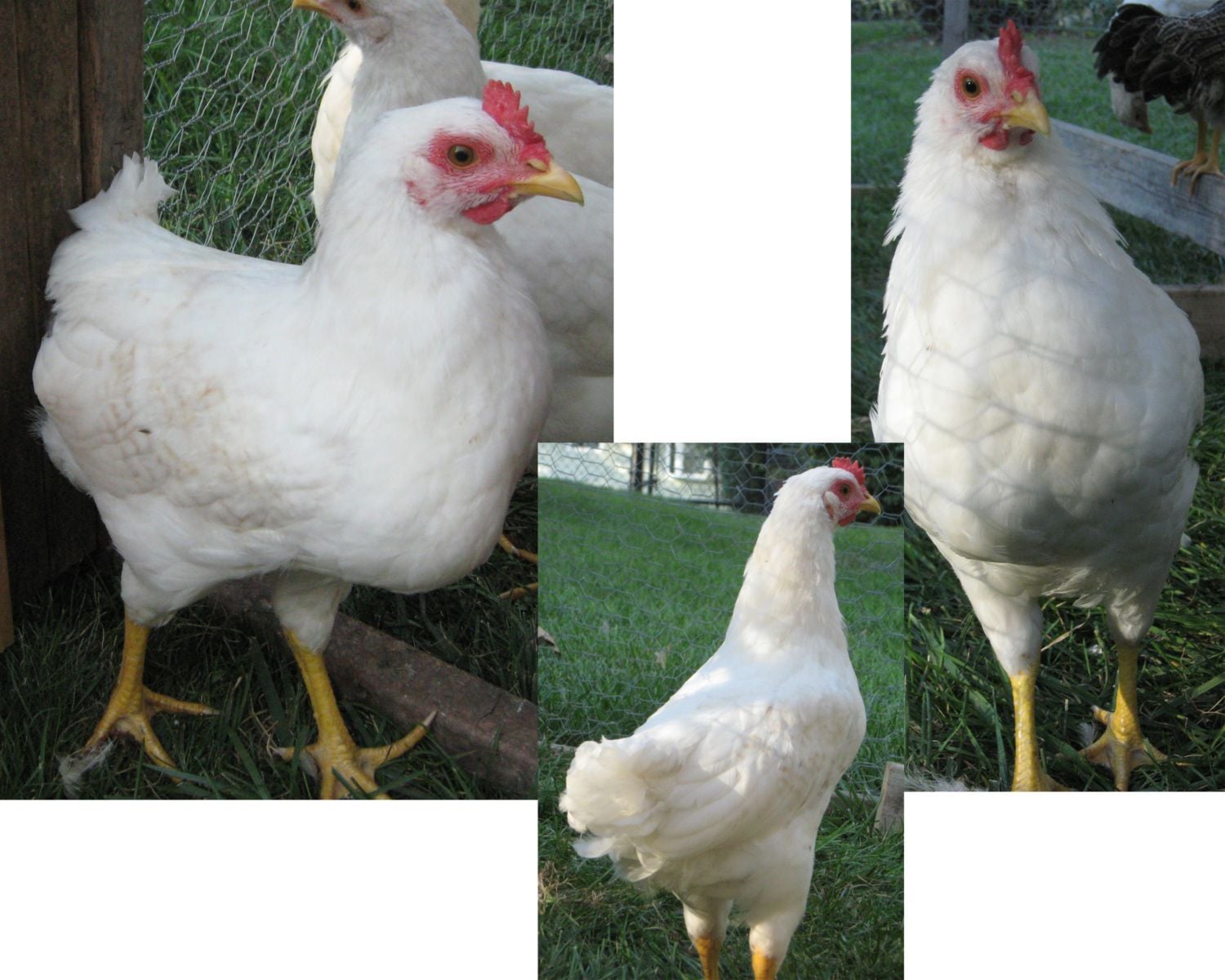 Hen. Large, A lot of "fluff" to her feathers. White with slight buff color on head. Pale legs, beak & comb. Timid around people