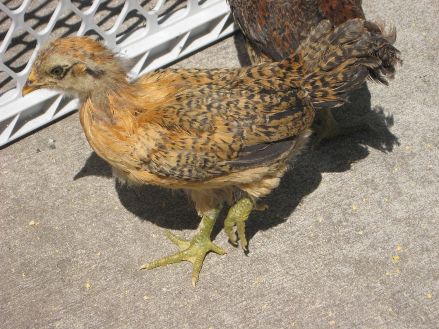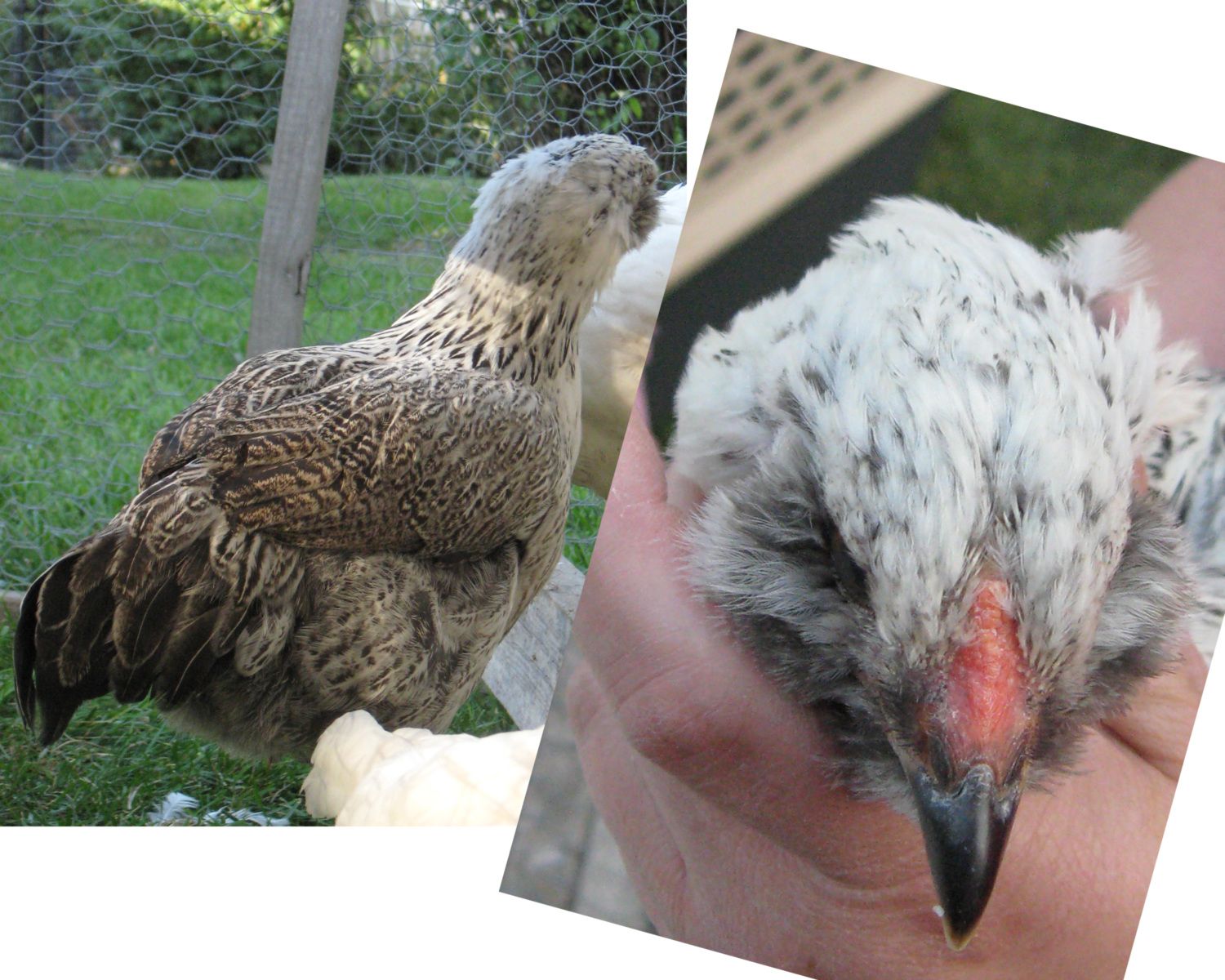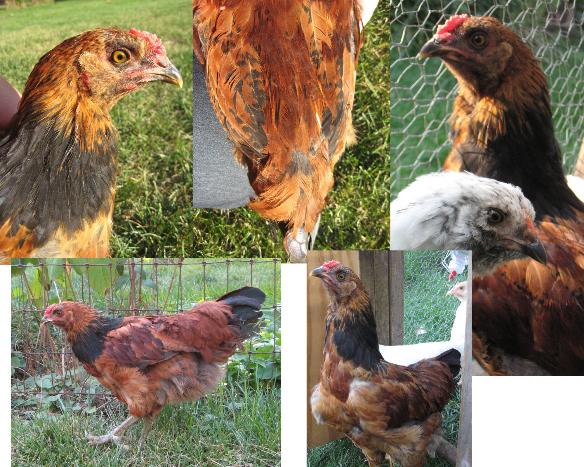 ???? The 2 photo collages above are all the same chicken. Grey (kind of thick for size) legs. Has always been the smallest, but is fearless & always busy. I've said rooster since the day it hatched, but at 9 1/2+ weeks, the comb is still small. Only now is the tiny comb getting a little color. Likes to raise & cock its head as you speak. The collar around the back of neck looks pointed, but the actual feather tips are more rounded. No wattles.