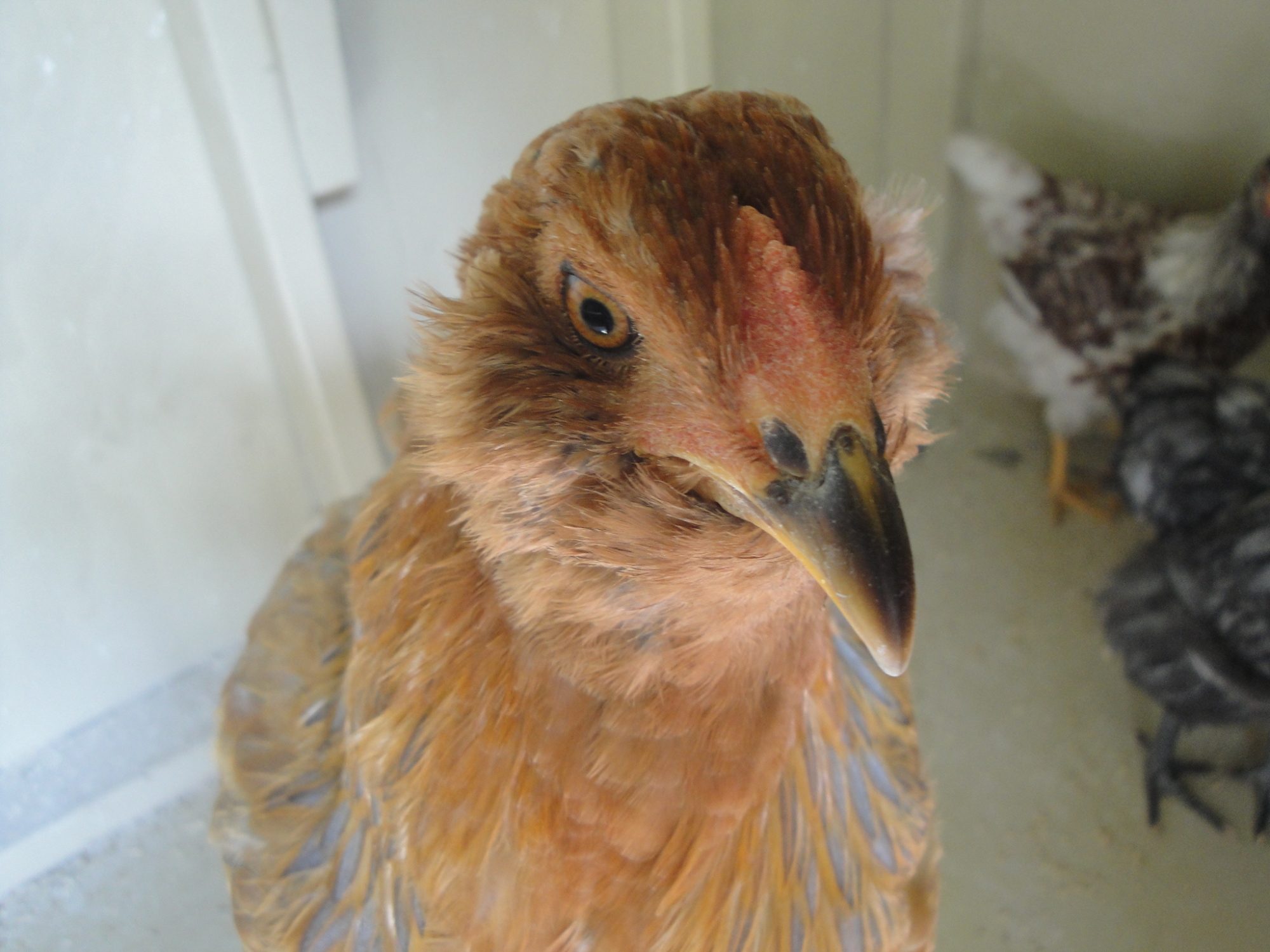 Rooster. Mostly white. Faint barring (buff color) on wings. Slightly smaller than the others. Comb turned pink at 4 weeks.