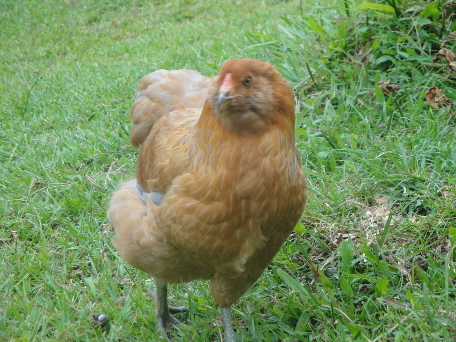 Hen. Maybe an Easter-egger? Greenish-grey legs with feather stubble