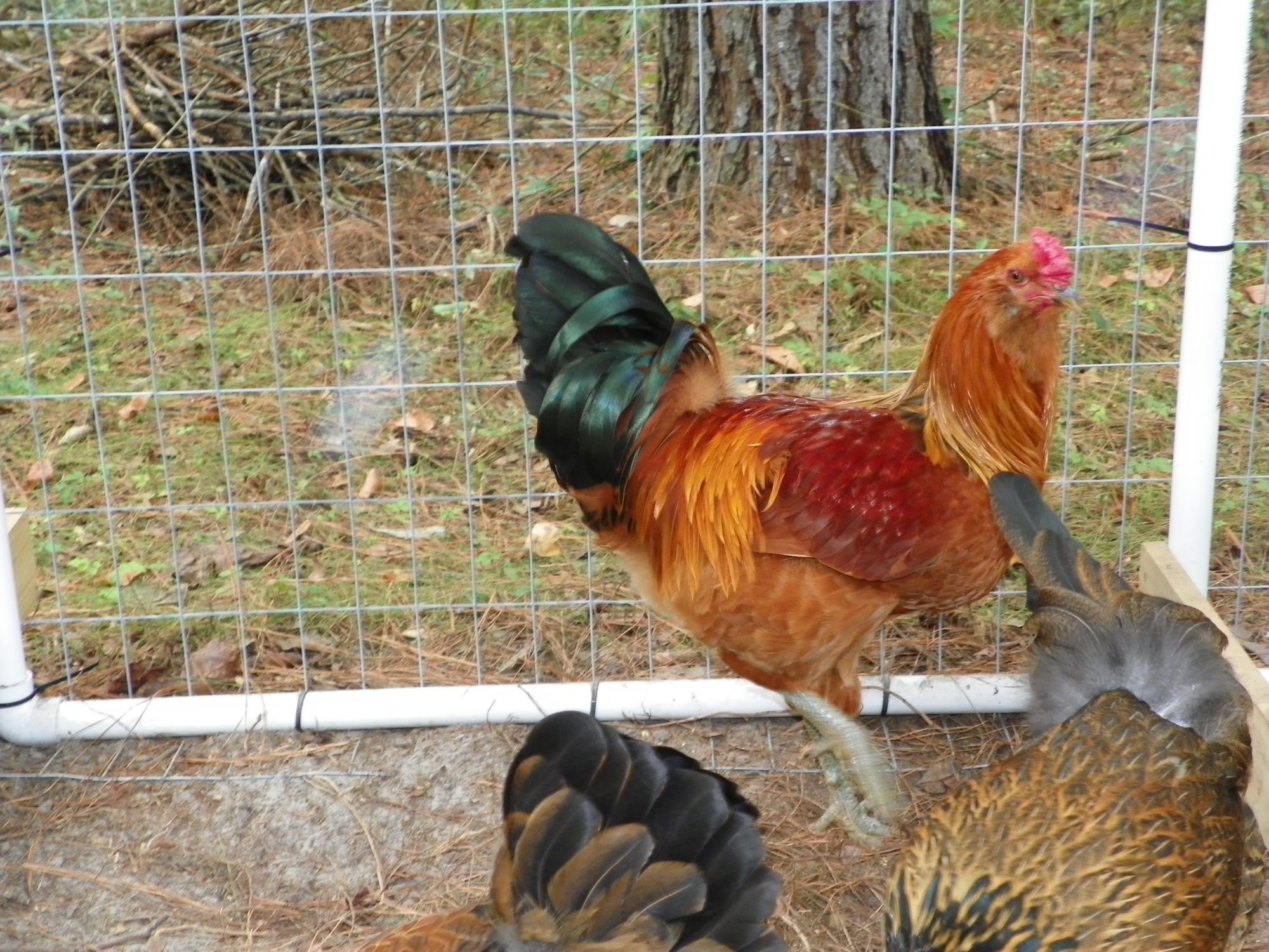 Rooster - Easter-egger. Largest & leader of flock. I hope someone will tell me I'm wrong. Comb turned pink at 5 weeks. No wattles even at 10 weeks. Personality says it all with this beauty. He is trained to come when called and goes into the coop when told. He even tolerates going to the park to ride the swings with the kids. I think I see some saddle feathers but no crowing or huge tail yet. I hope I can rehome him somewhere nice.