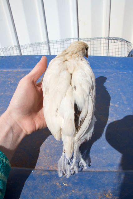 The first one is white with red on the chest and random black/brown feathers in the wings. It appears he is getting more of these random feathers and his comb is small but pinking up.