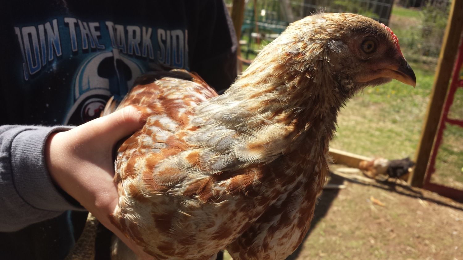 ) didn't have her long tail feathers pulled out....just every other feather they could reach. Poor baby looks a mess right now. She is super sweet though. Although I've seen the heifer pick a time or two since then! You would think she would knows very well how it feels!