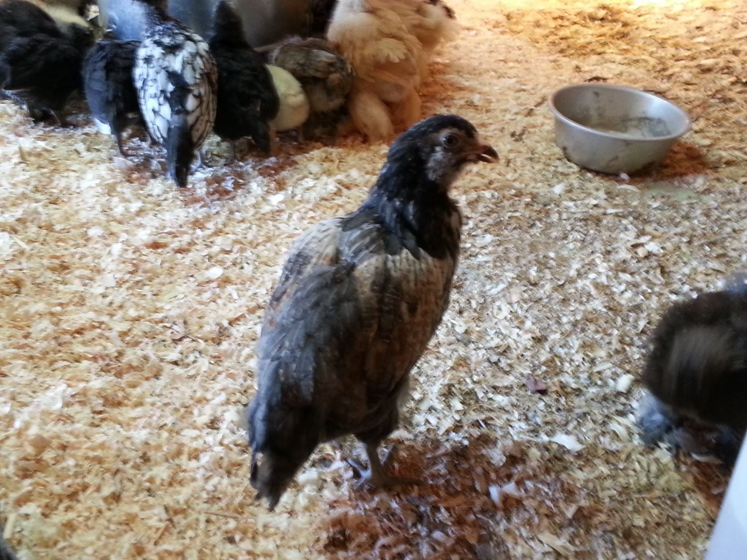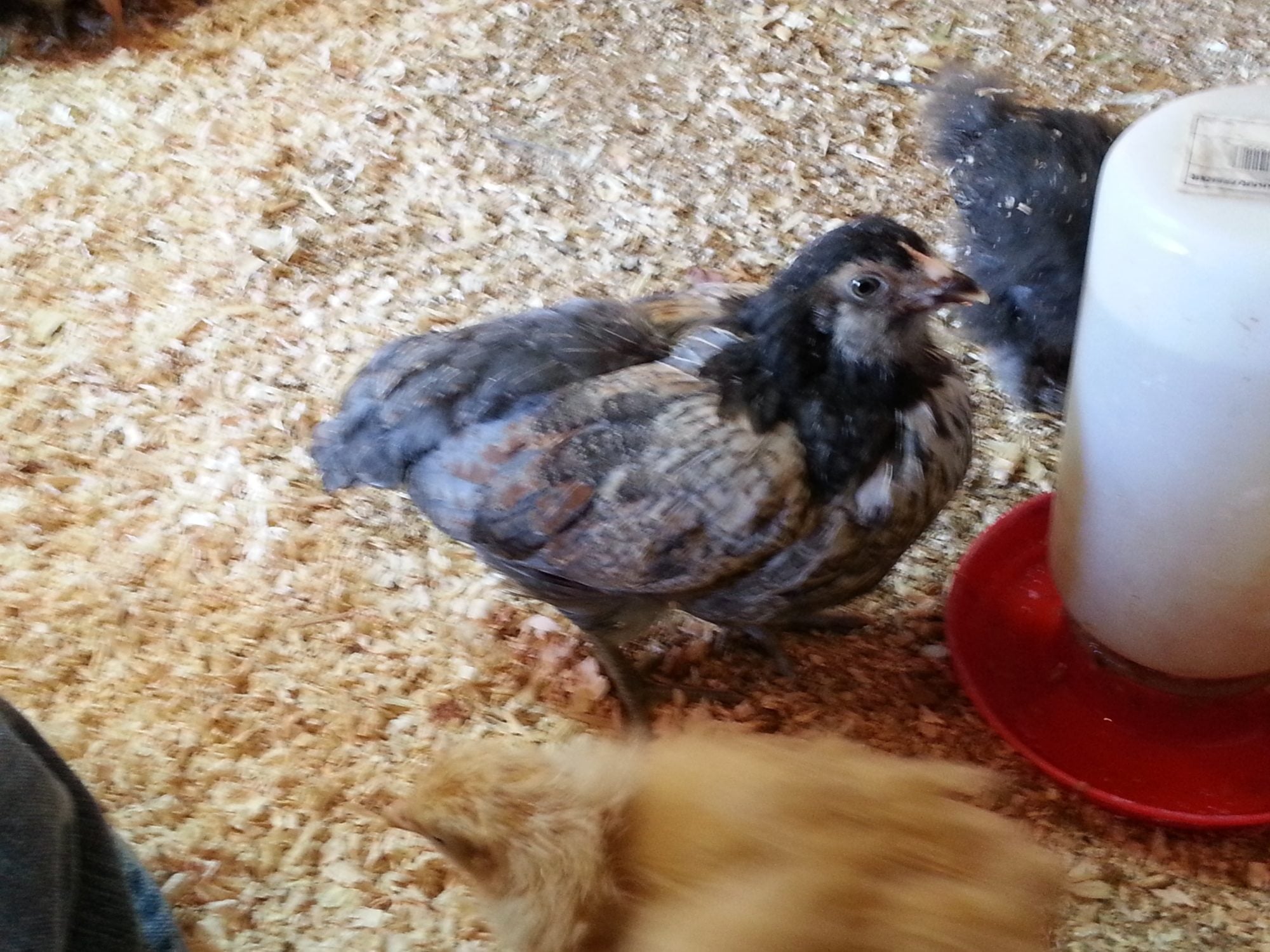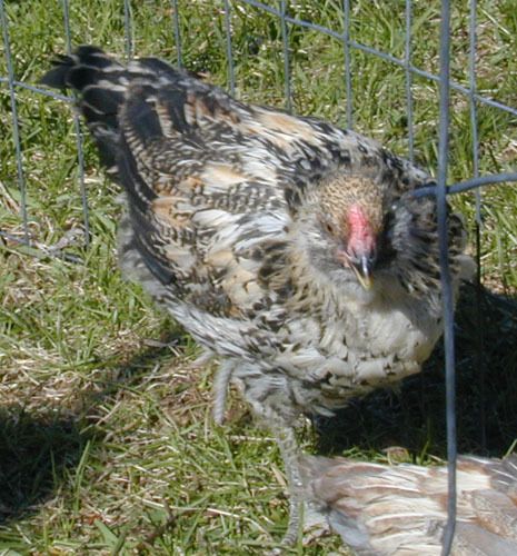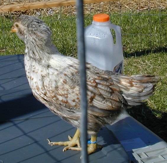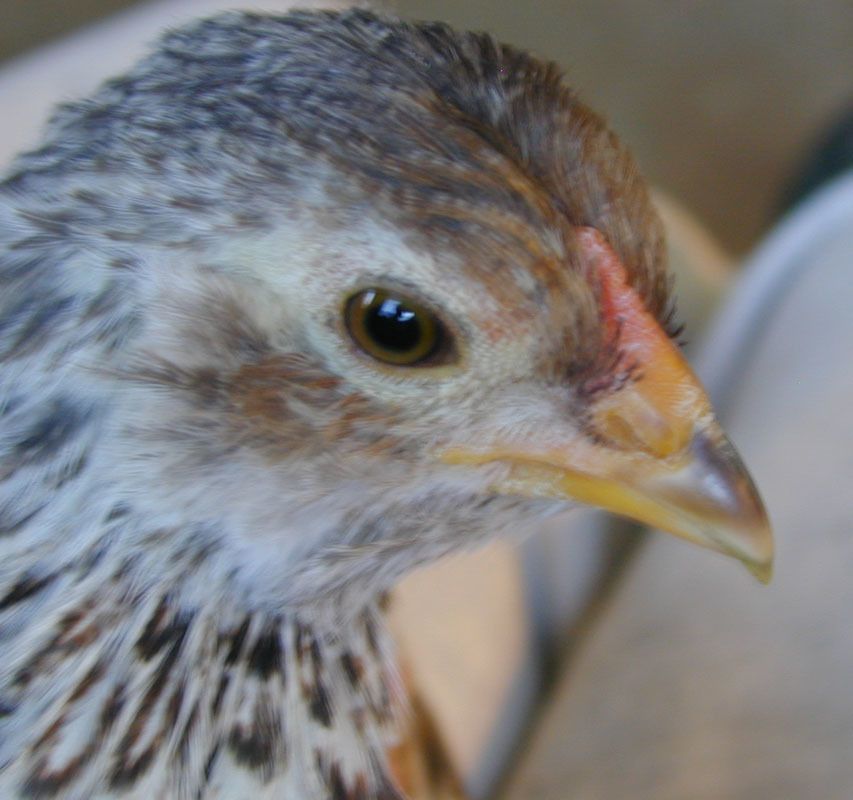 I already posted my four chicks, but I thought I'd add my black & white EE here. She (crosses fingers) is 3 1/2 weeks old. Her pattern is very similar to my brown, lighter on her head and chest, darker across her wings and back. The pattern is the same over her whole body (no splotchiness), but I know b&w EEs are usually male. No brown yet. What do you think?![]()