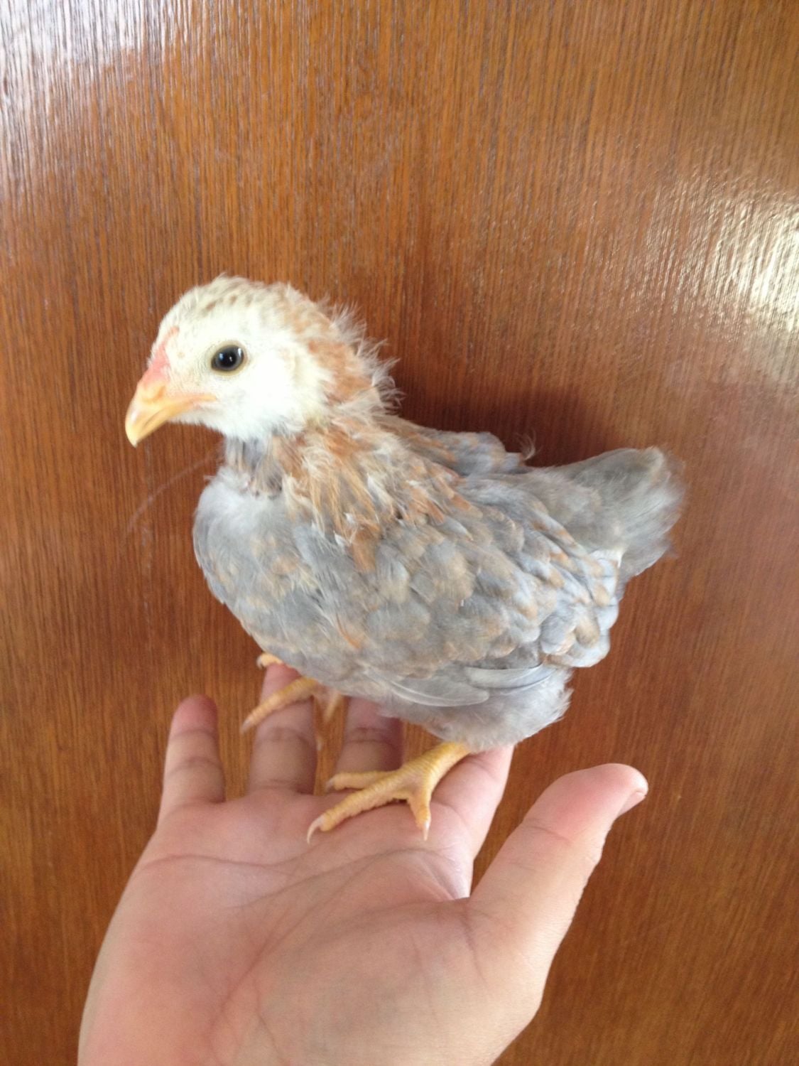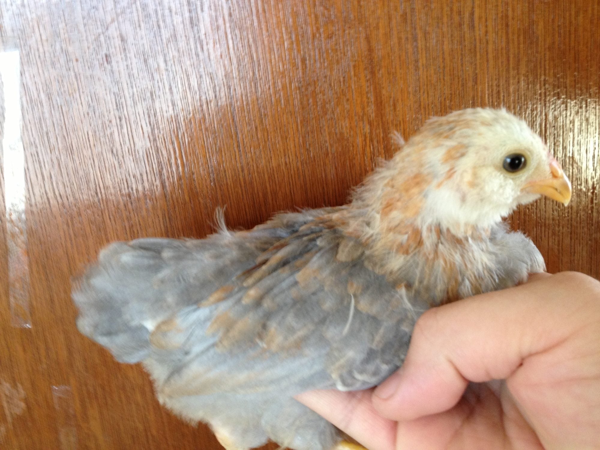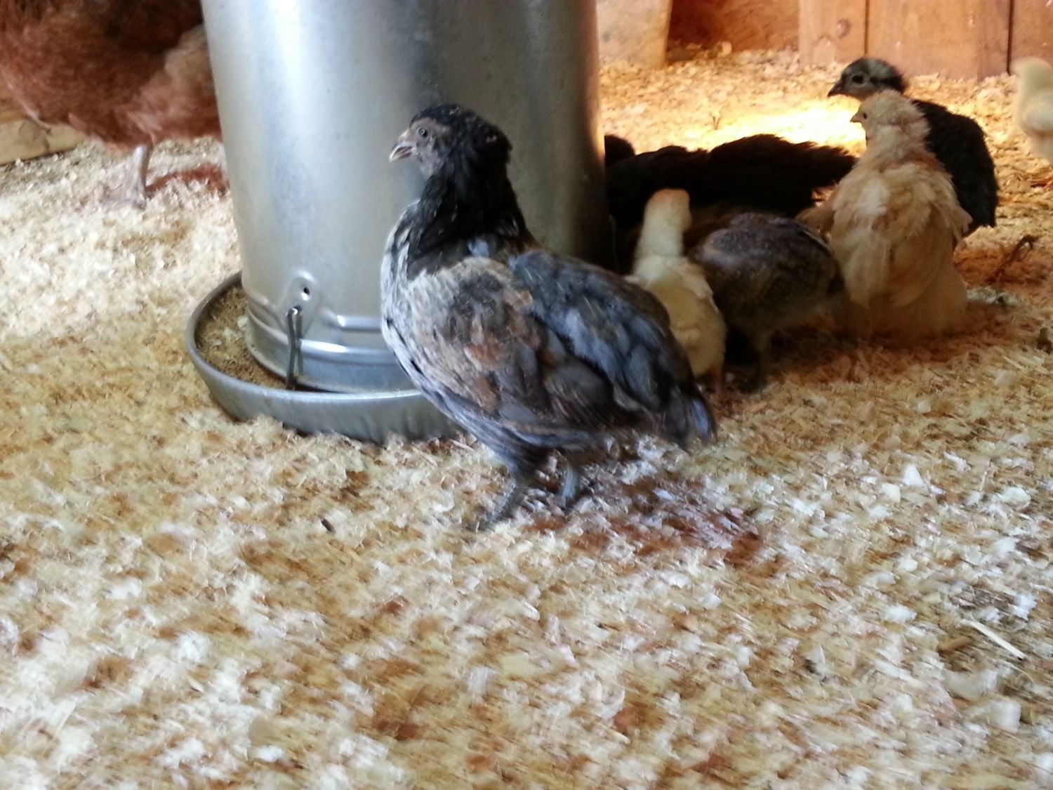 I already posted my four chicks, but I thought I'd add my black & white EE here. She (crosses fingers) is 3 1/2 weeks old. Her pattern is very similar to my brown, lighter on her head and chest, darker across her wings and back. The pattern is the same over her whole body (no splotchiness), but I know b&w EEs are usually male. No brown yet. What do you think?![]()