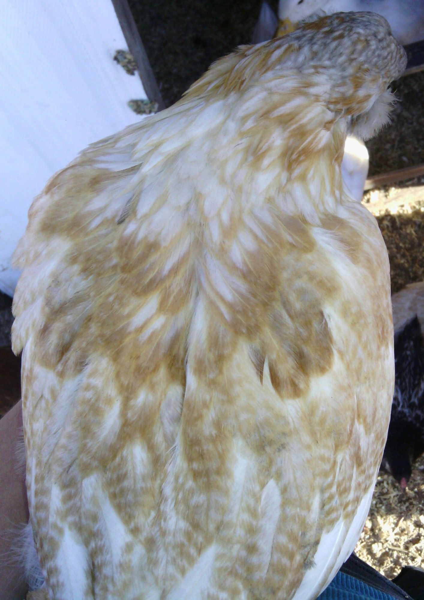 Yea she does. Snowflake is more white thought, but I just love their color with the white and buff! I hope next year when I hatch some eggs out from her, that I get some right like her. This is snowflake and the roo I will put her with. Do you think I will get chicks of her color, since they are both white with some buff in them?