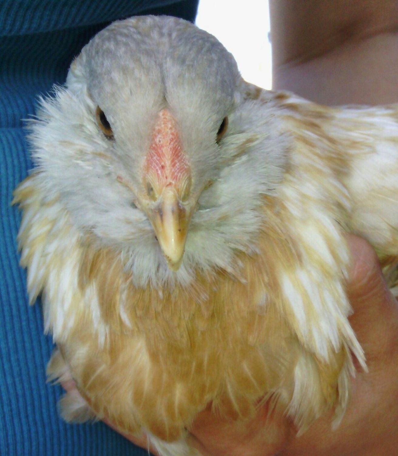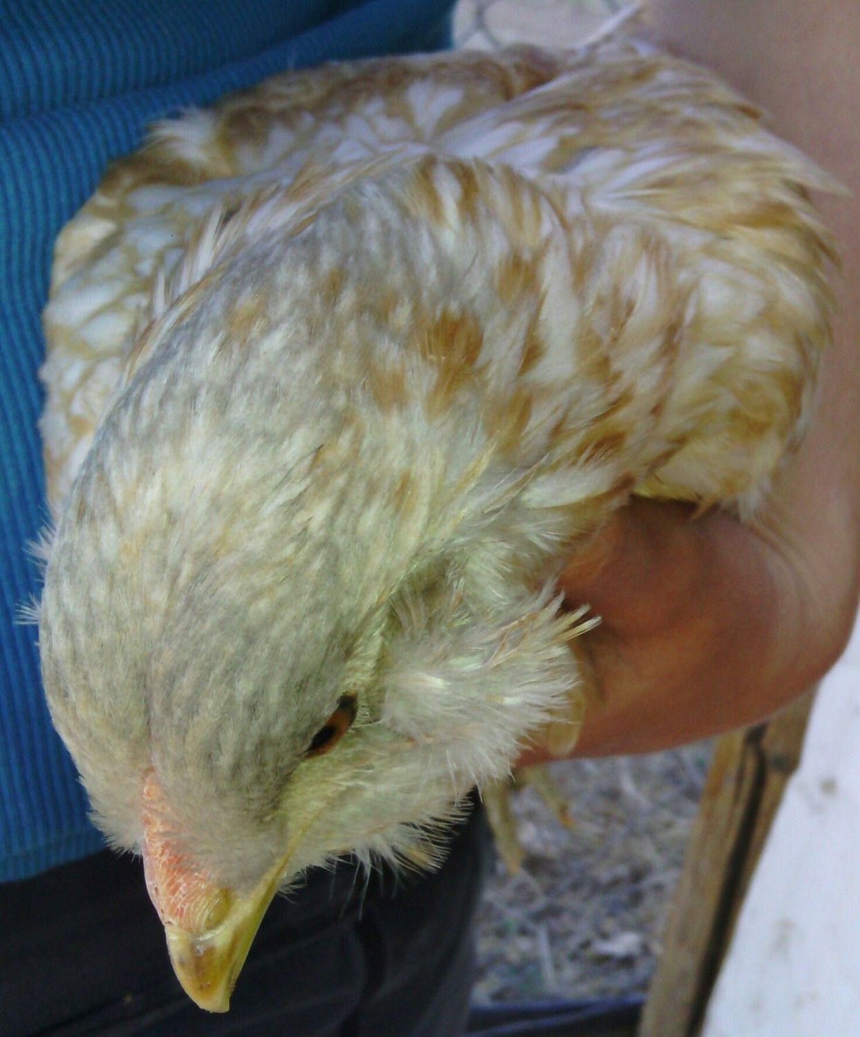 Mine did have a light grey color on her head and neck, but mostly white. Do you have any pics of her when she was little? It's hard to tell with the red bulb, but it is the only pic that I have on here.Yup, I got her from Cackle too. She wasn't white though, she was more of a smokey grey. Her first feathers were white, then she started getting the buff ones.