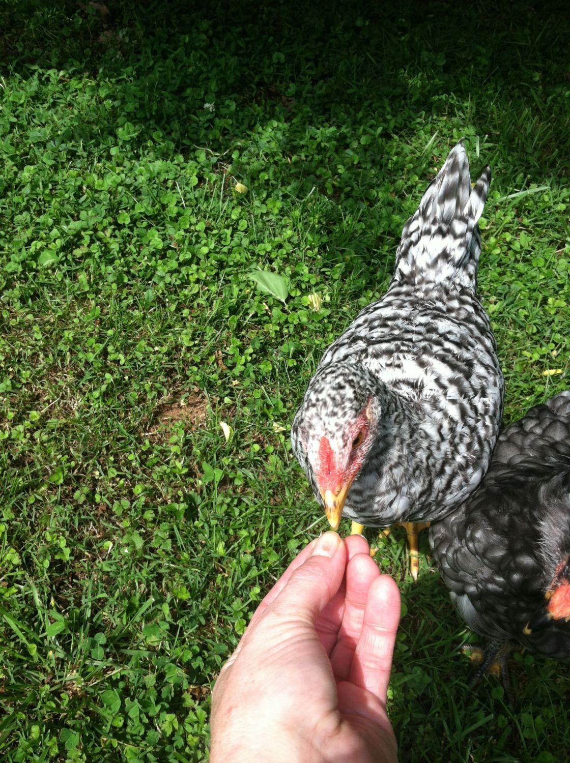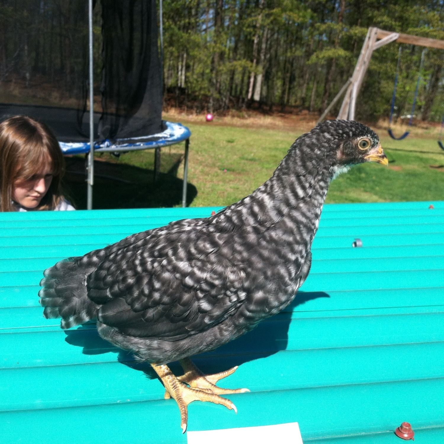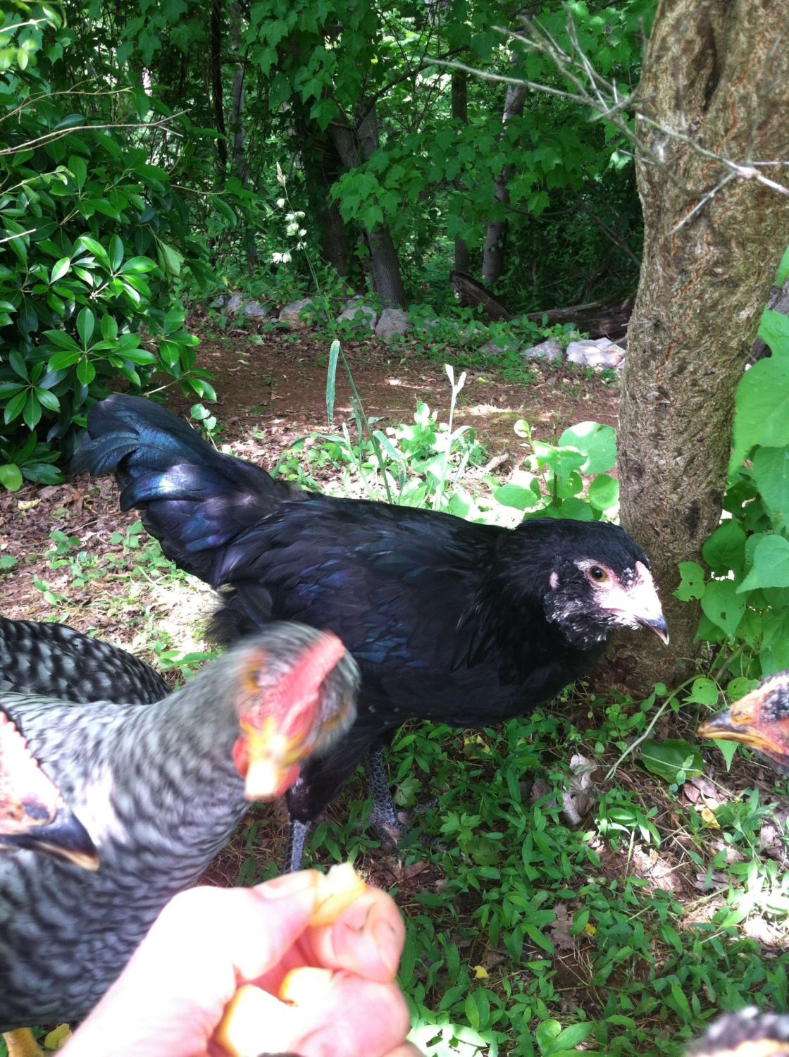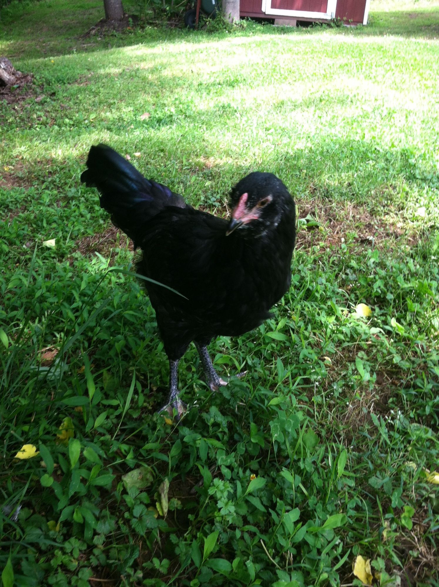 #4-This bird is beautiful. Mostly black with green streaking through the body and tail. He? has one white feather on the left side. I wish I'd gotten a better pic of the comb. Camera shy...
