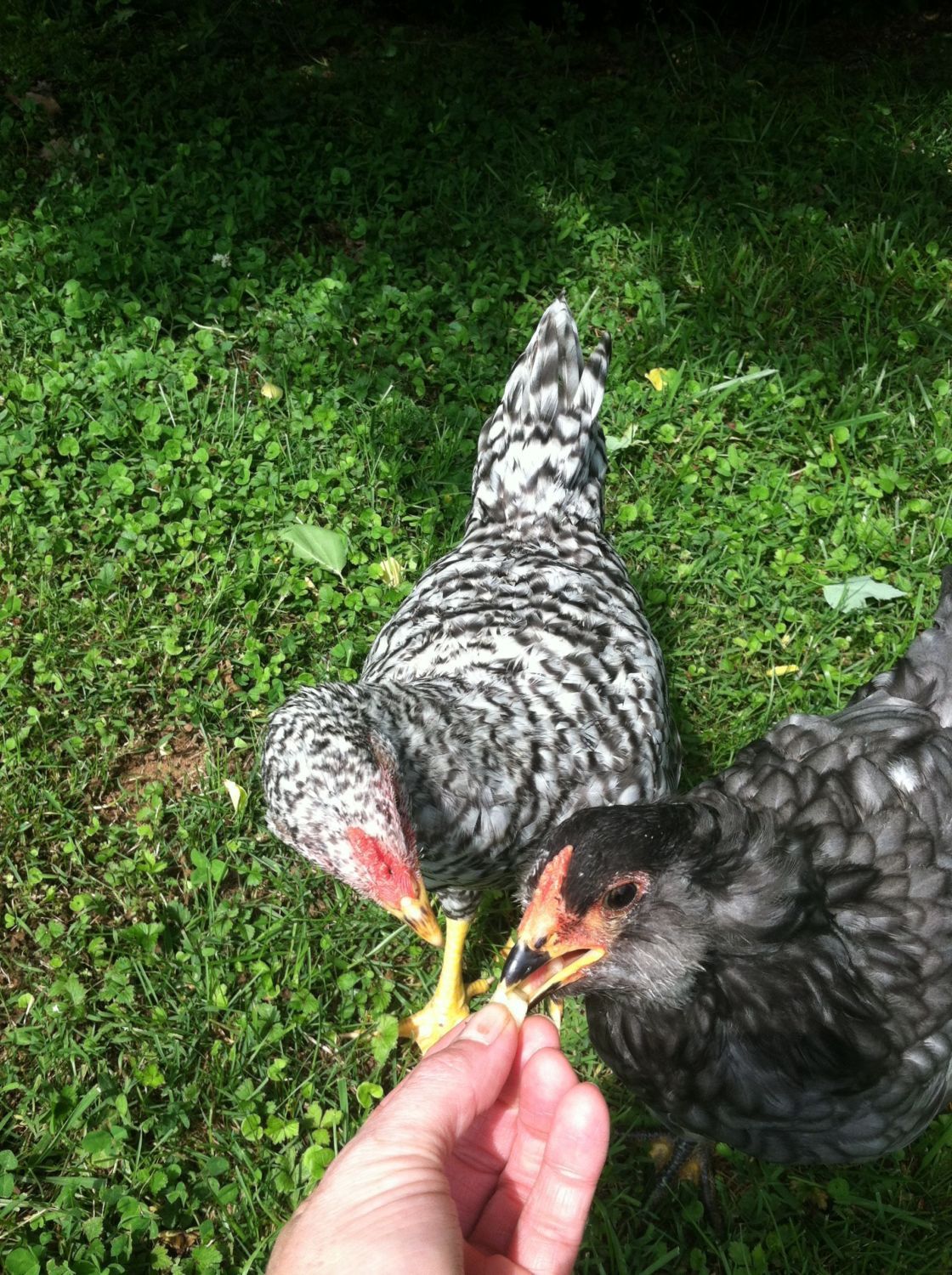 Here's a few shots of the pullets. They were taken a few weeks back, but they look pretty much the same today, just a bit more round. They are sweet birds. Climb up on my back if I sit with them. All of them have the same markings and combs.