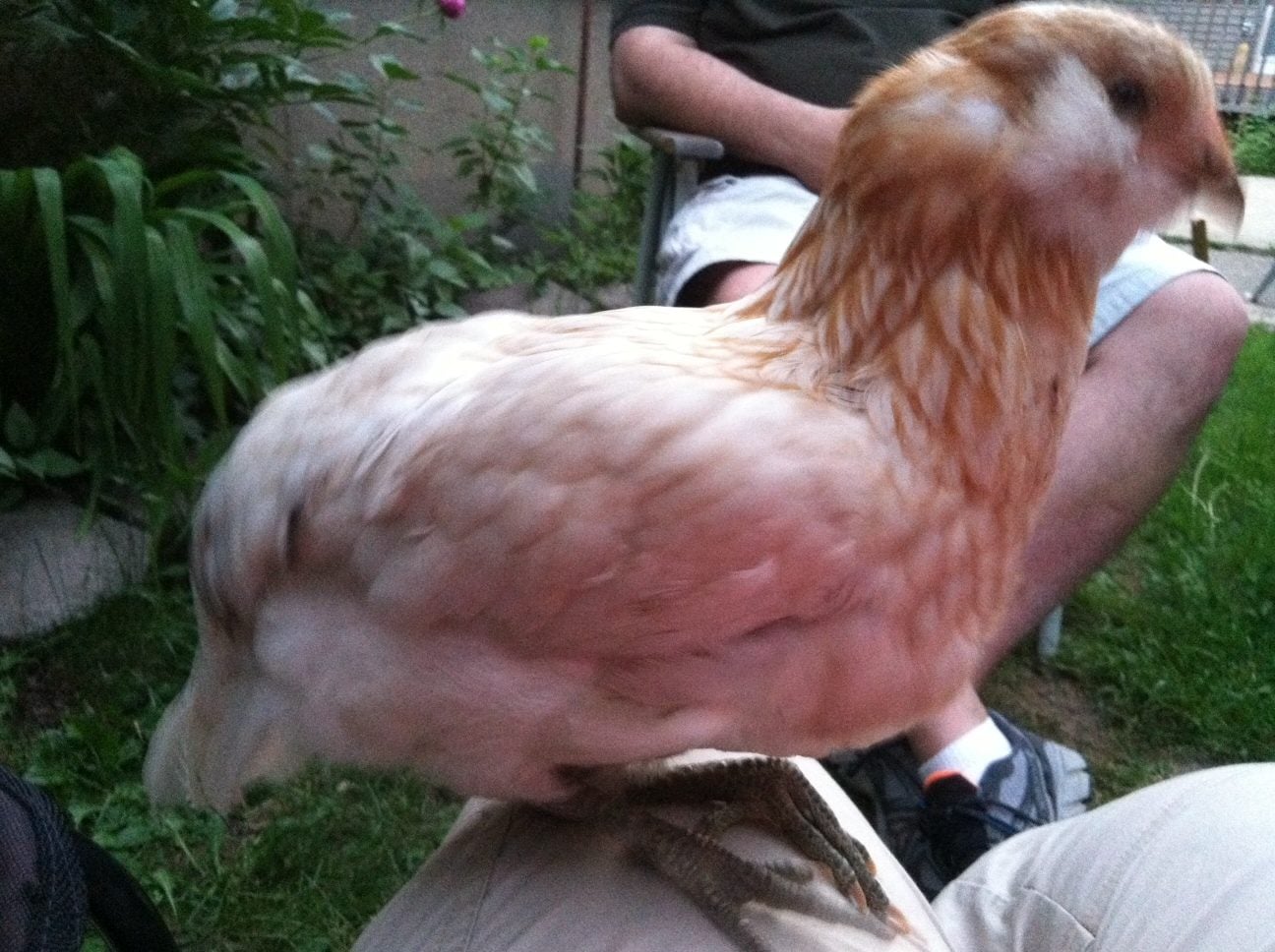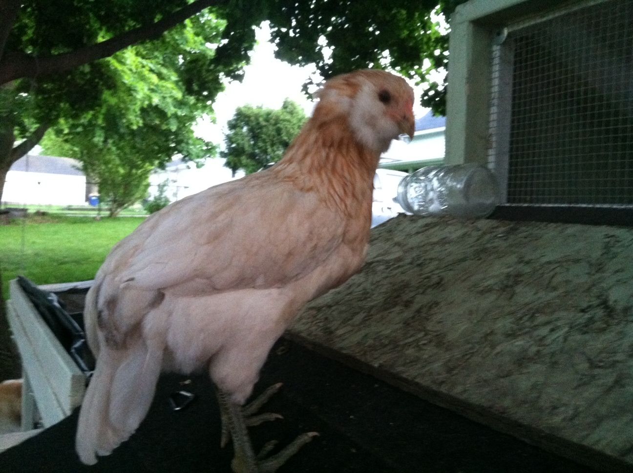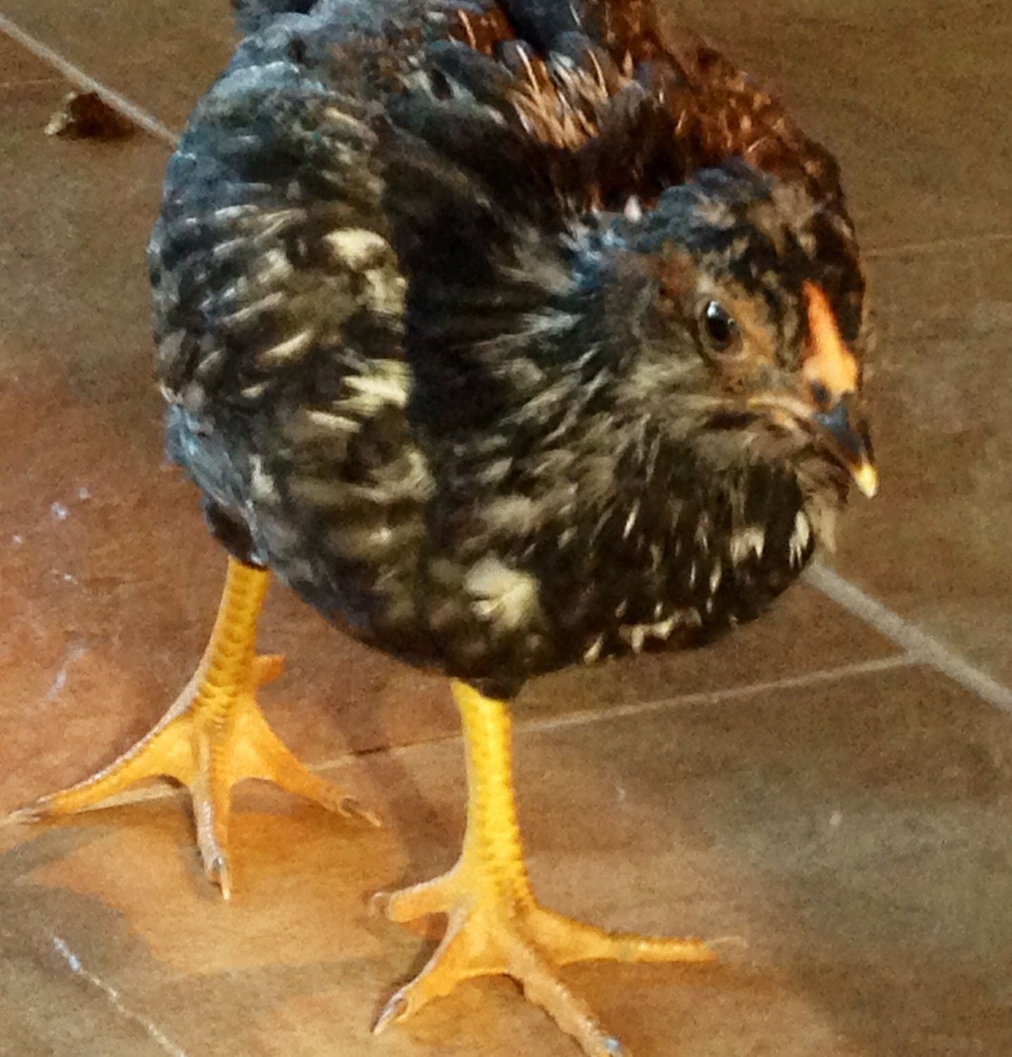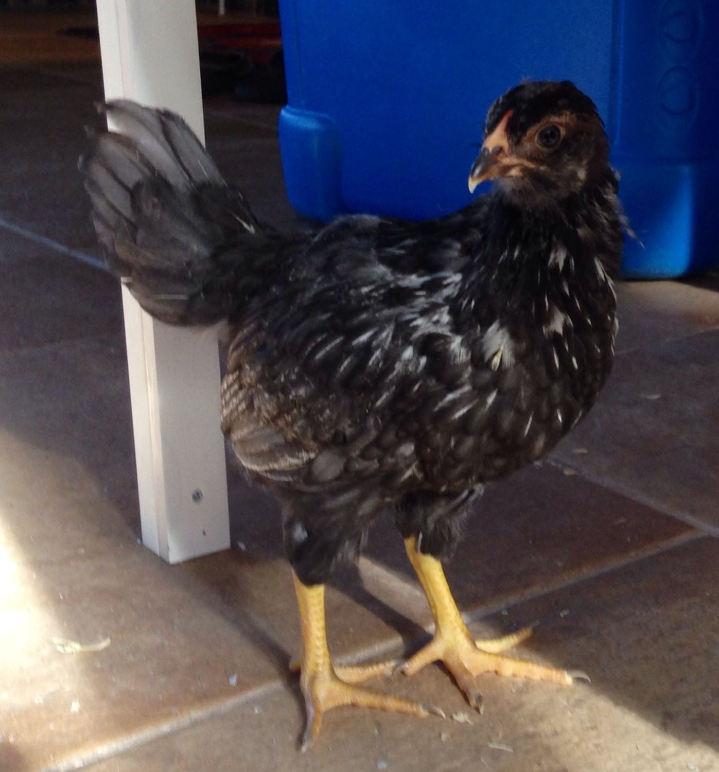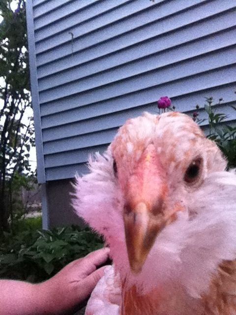 Kinda that way all over, funny thing is he was solid brown?? you can see what is left of the baby brown feathers around the face.see the splotchy white chest?I think cockerel.