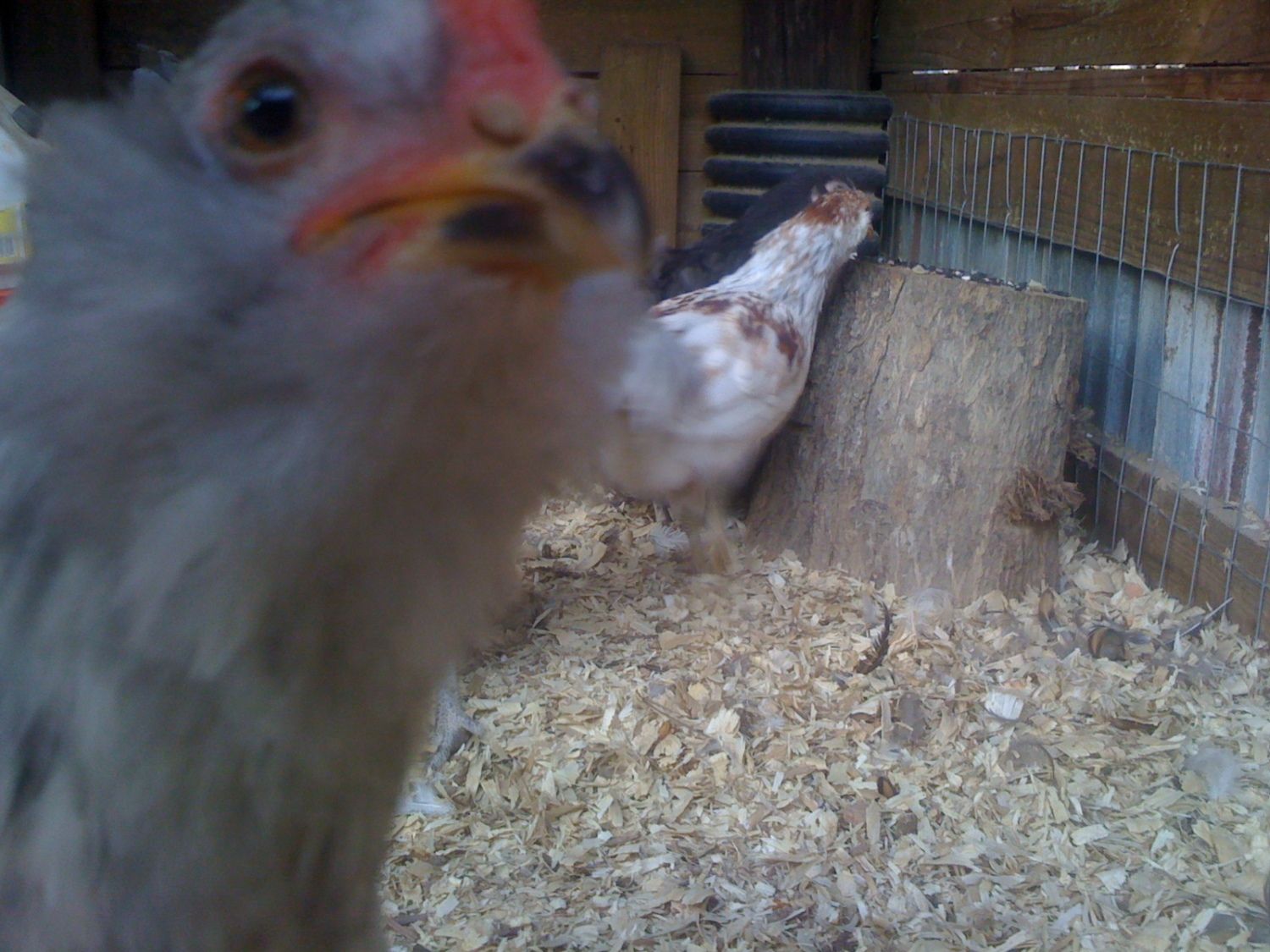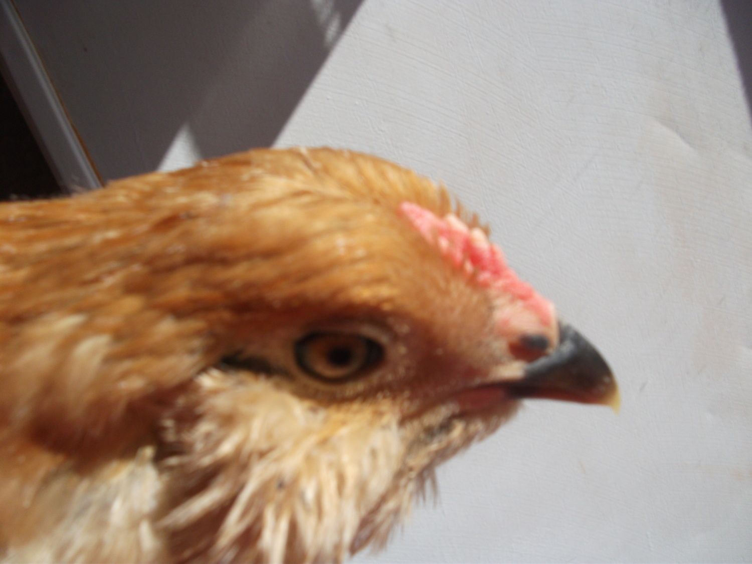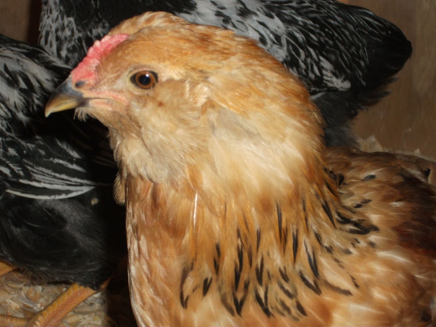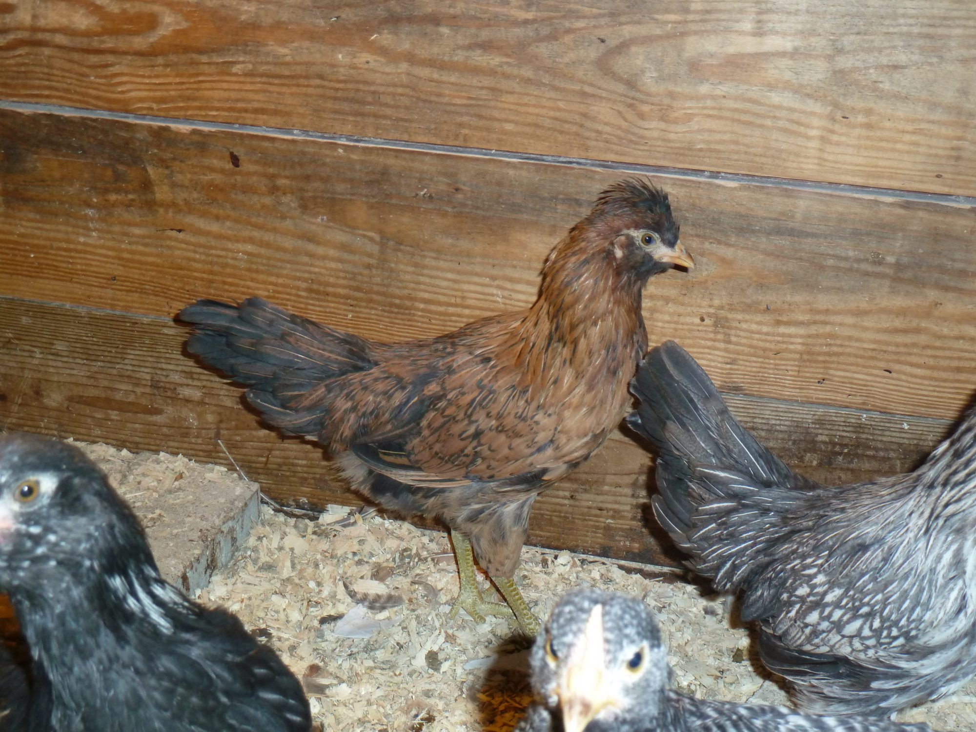 These are all NYD chicks, so around nine weeks old. This first one.. No comb to speak of, but a little red showing.. Enough red to say this could be a roo or could this be a girl? (black one showing on the right is a boy LOL).