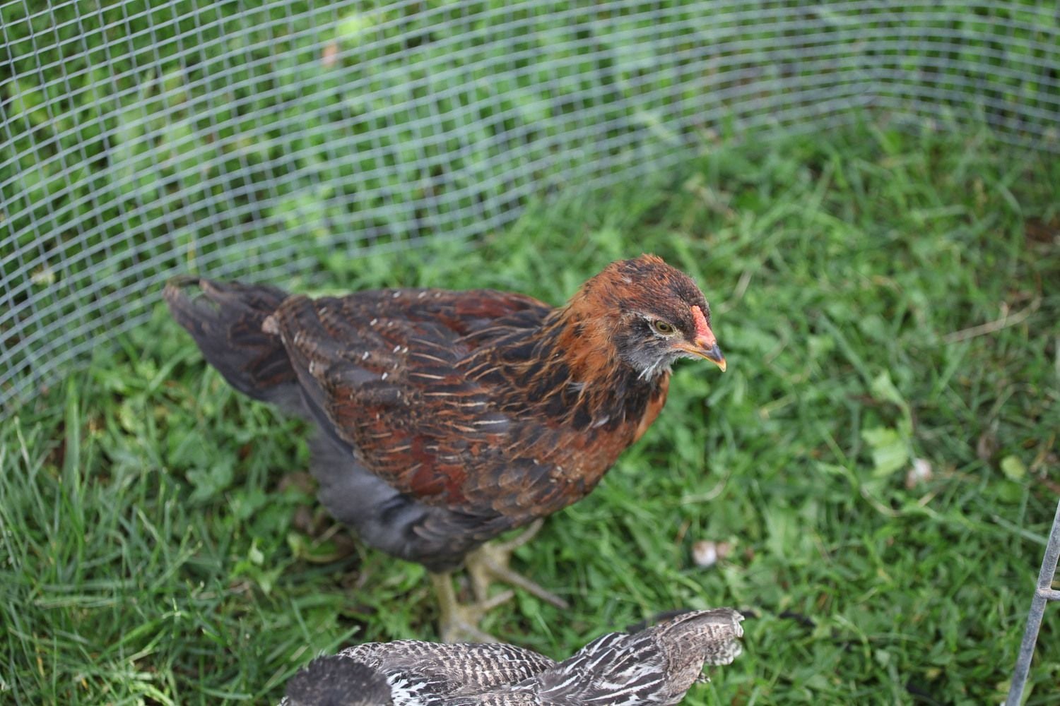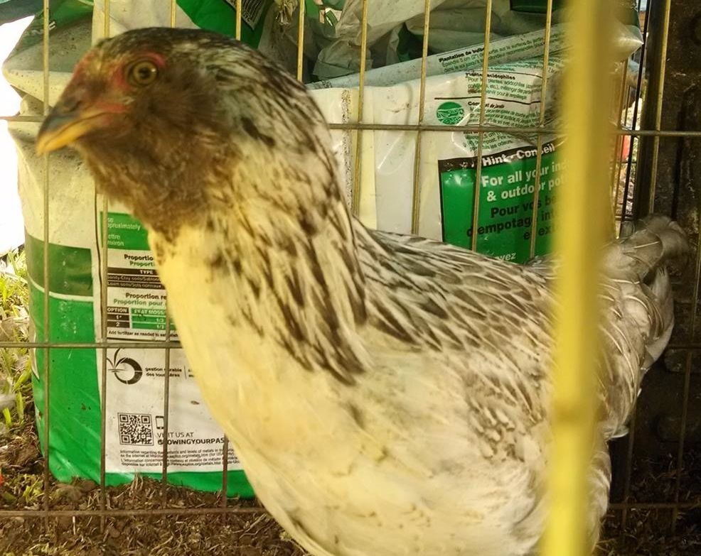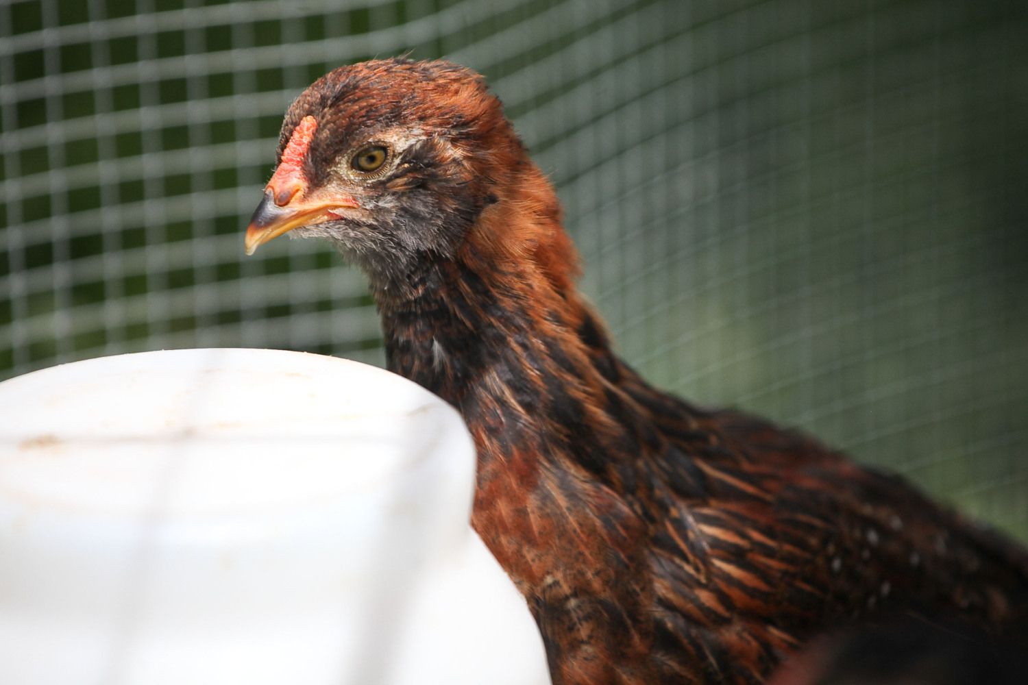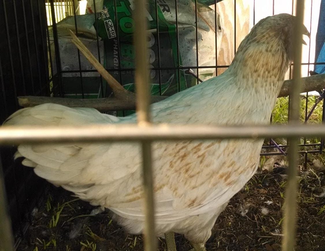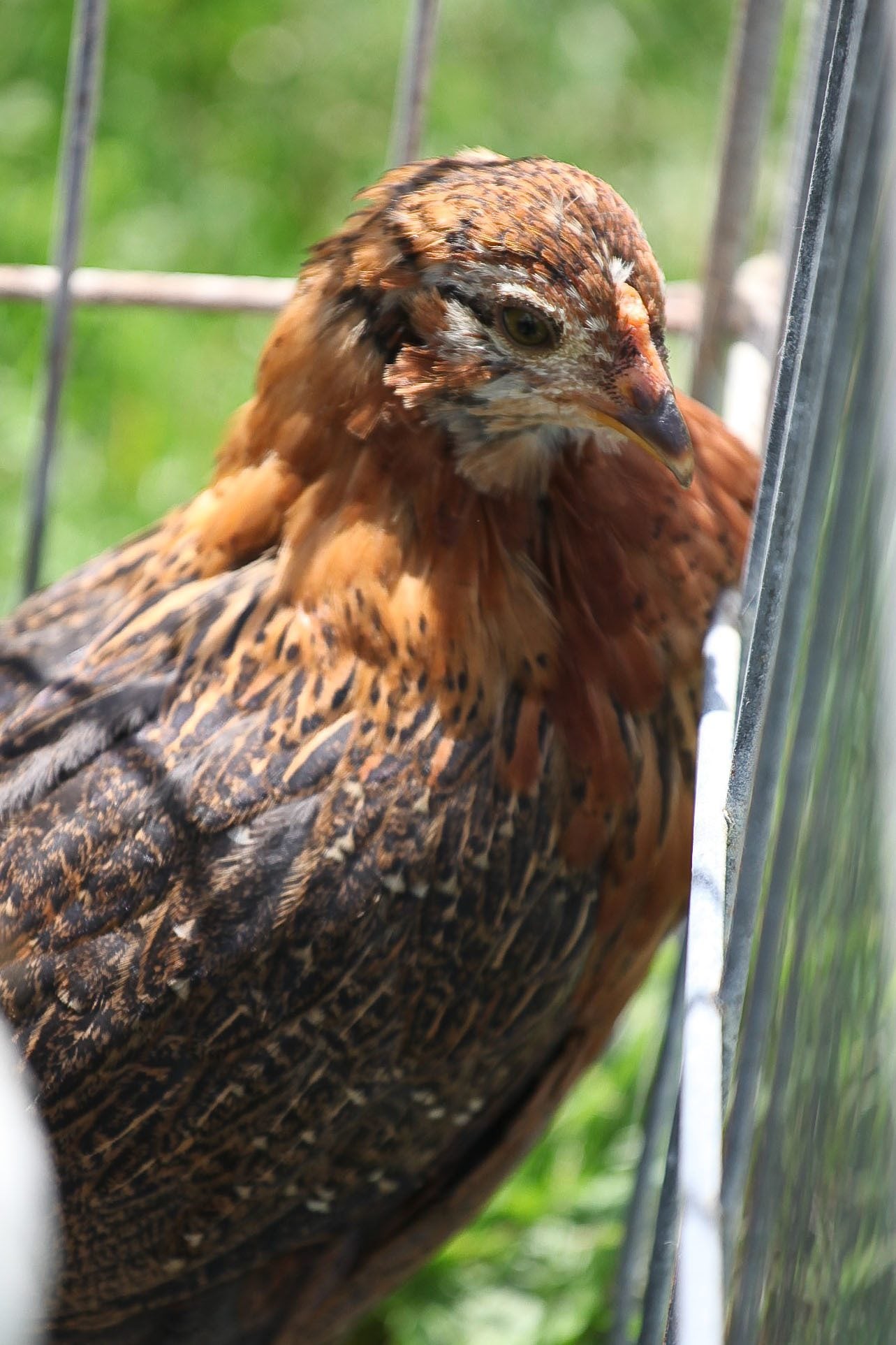 This one has been segregated due to being rather aggressive...solitary confinement! The others still try to look over the "wall" that I have set up..maybe another week and I'll put him/her back. Had been told this was a pullet...can't get a great pict but has the beige feathers on the chest.