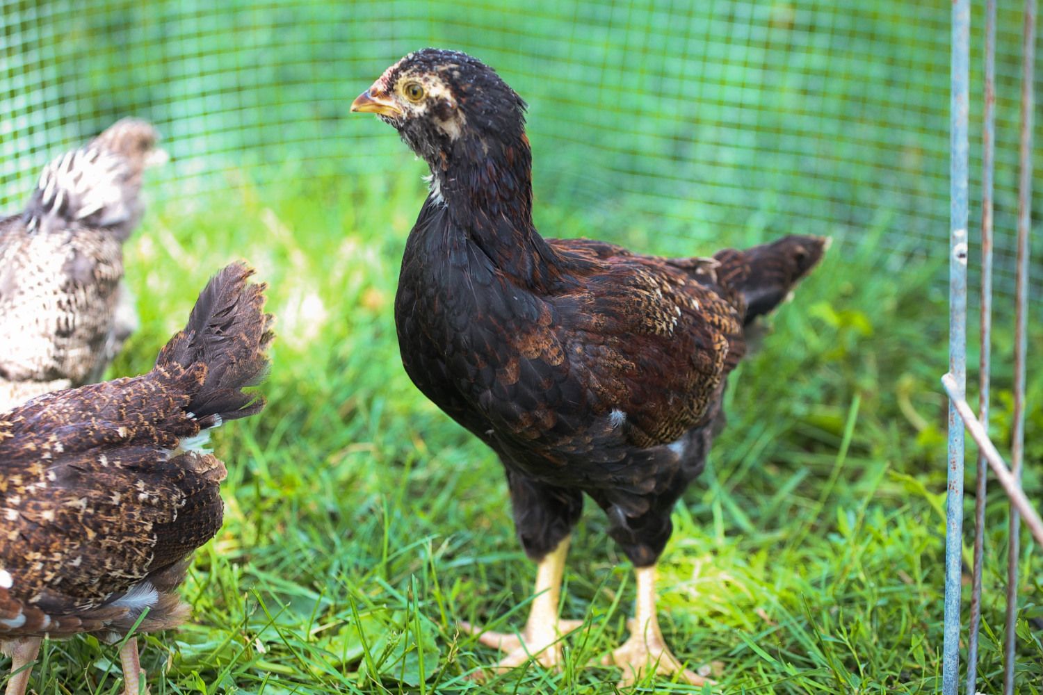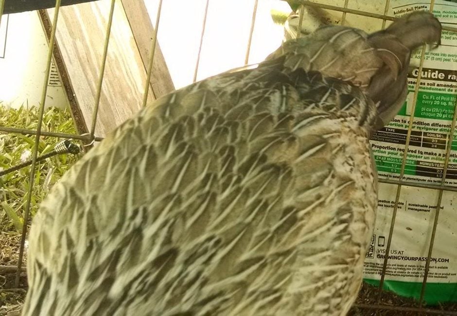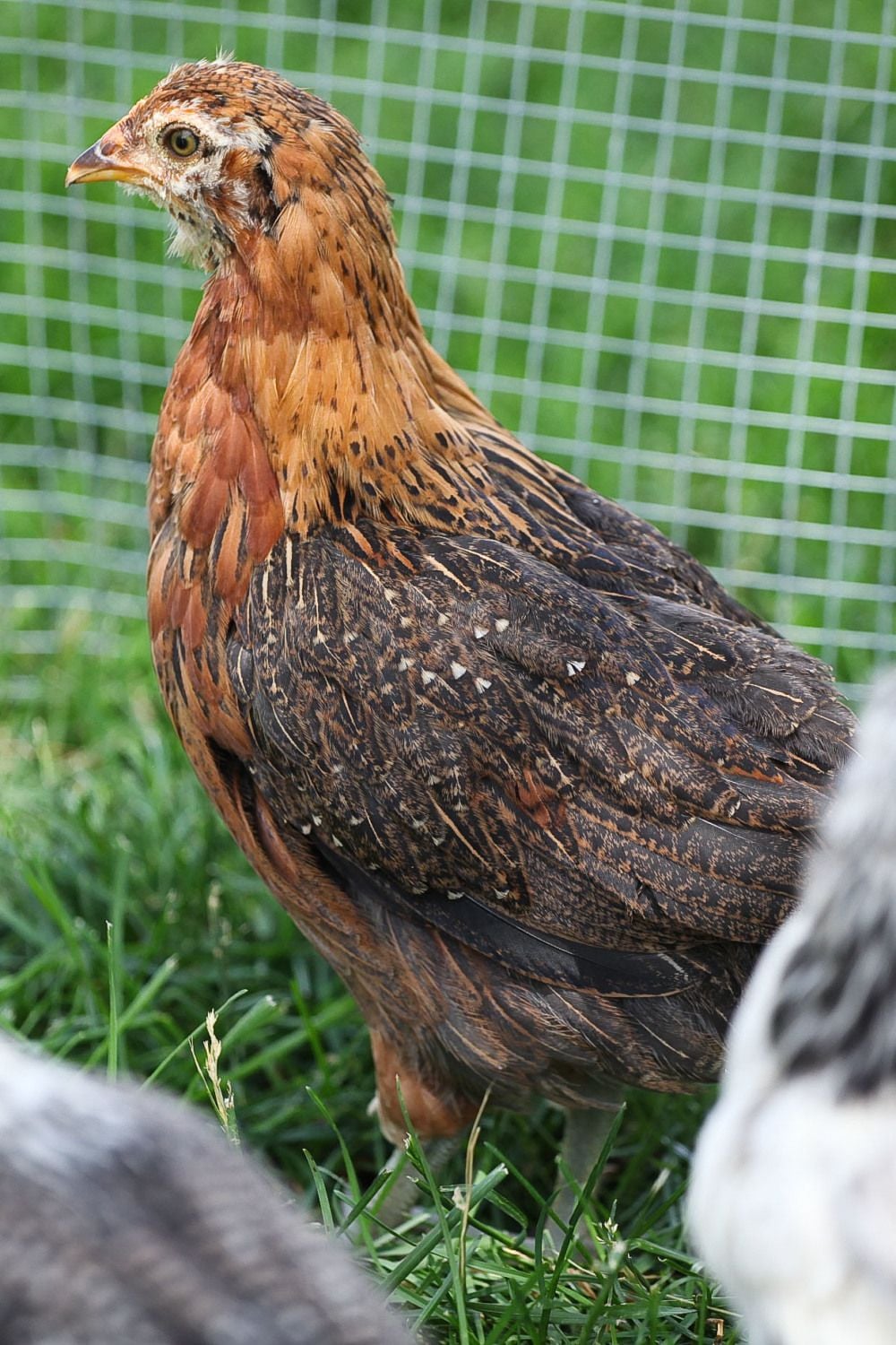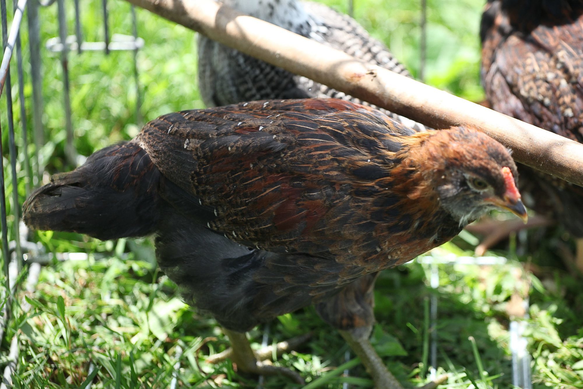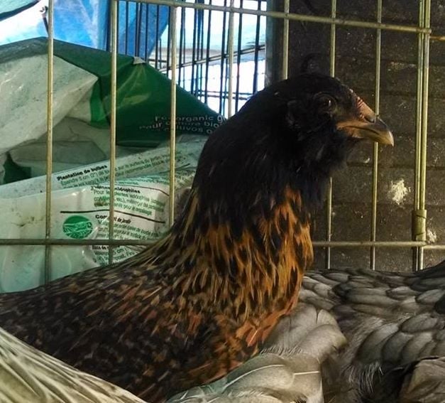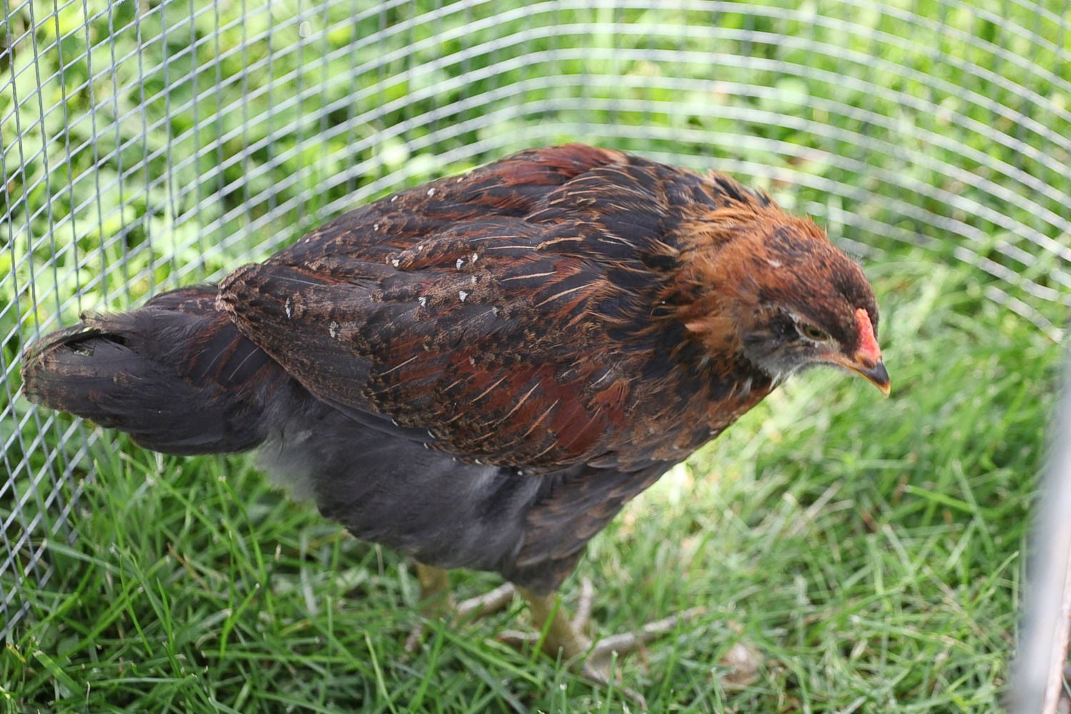 This one has been segregated due to being rather aggressive...solitary confinement! The others still try to look over the "wall" that I have set up..maybe another week and I'll put him/her back. Had been told this was a pullet...can't get a great pict but has the beige feathers on the chest.