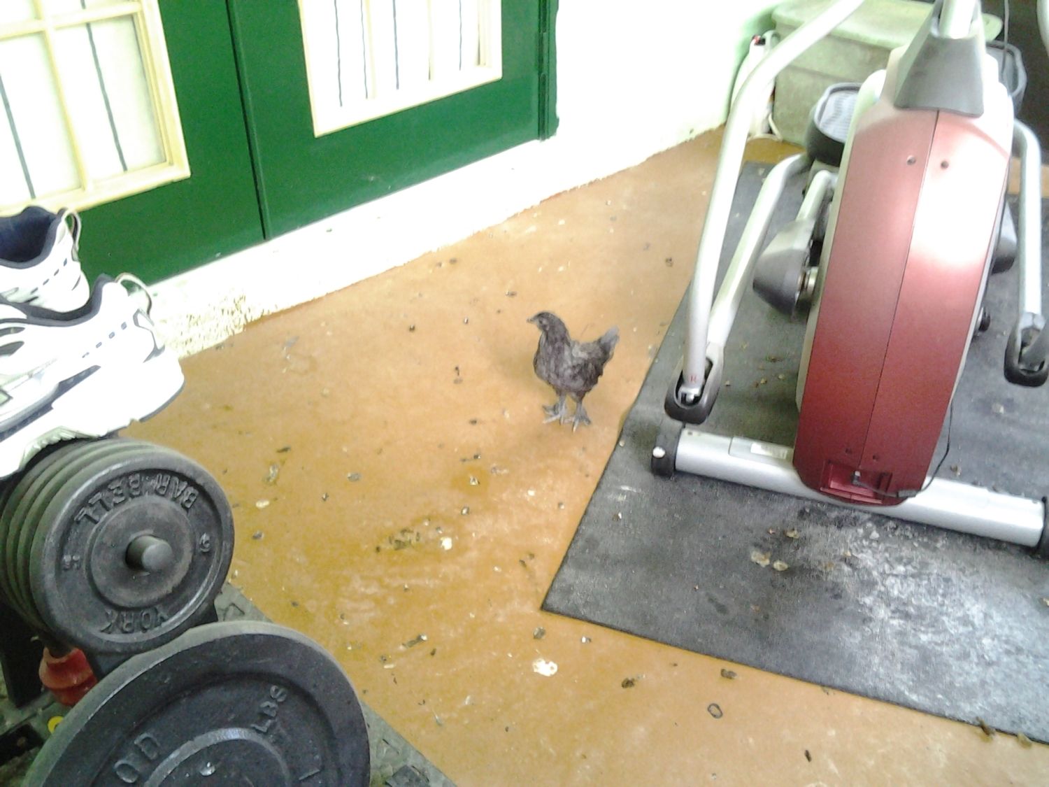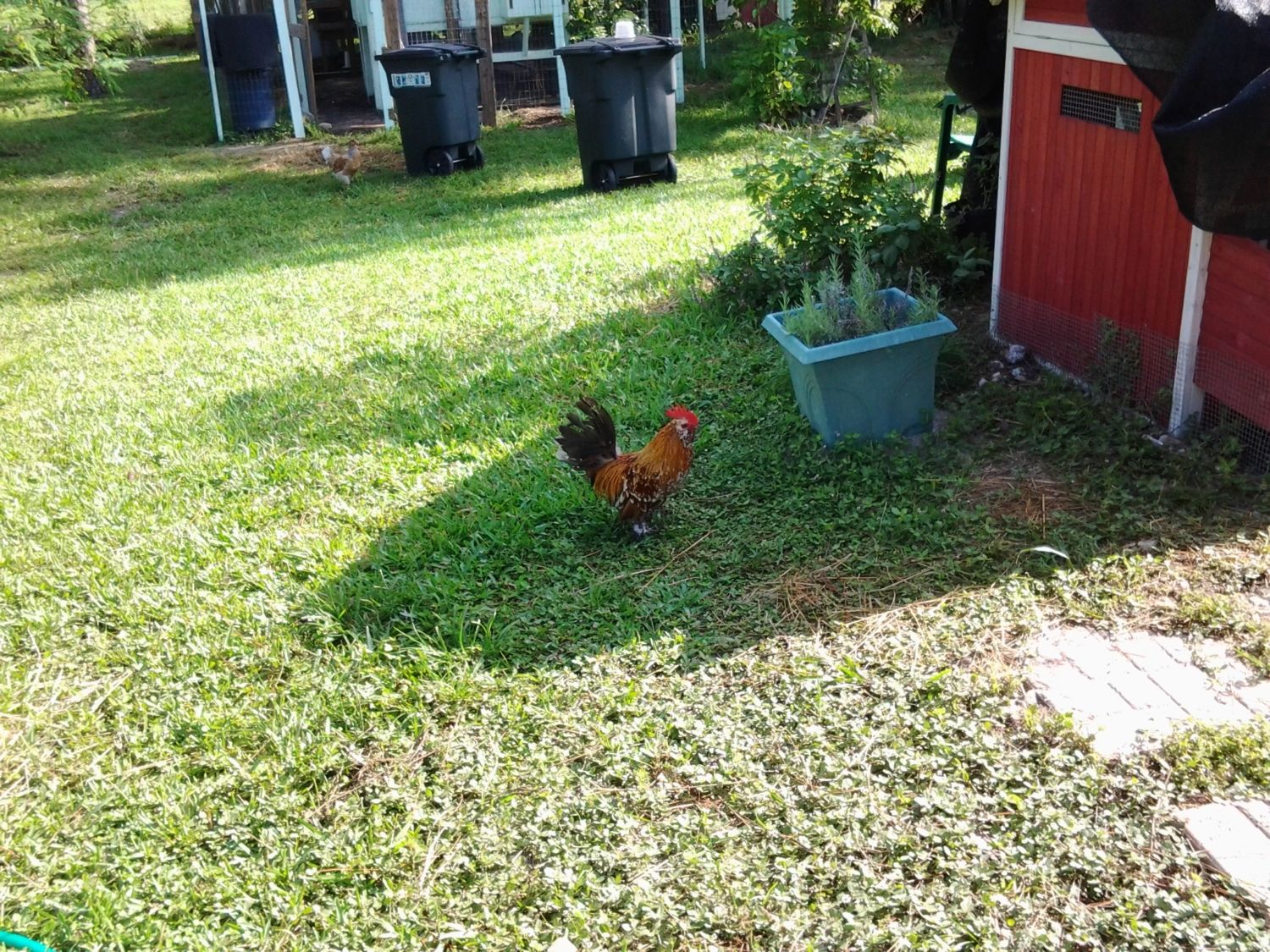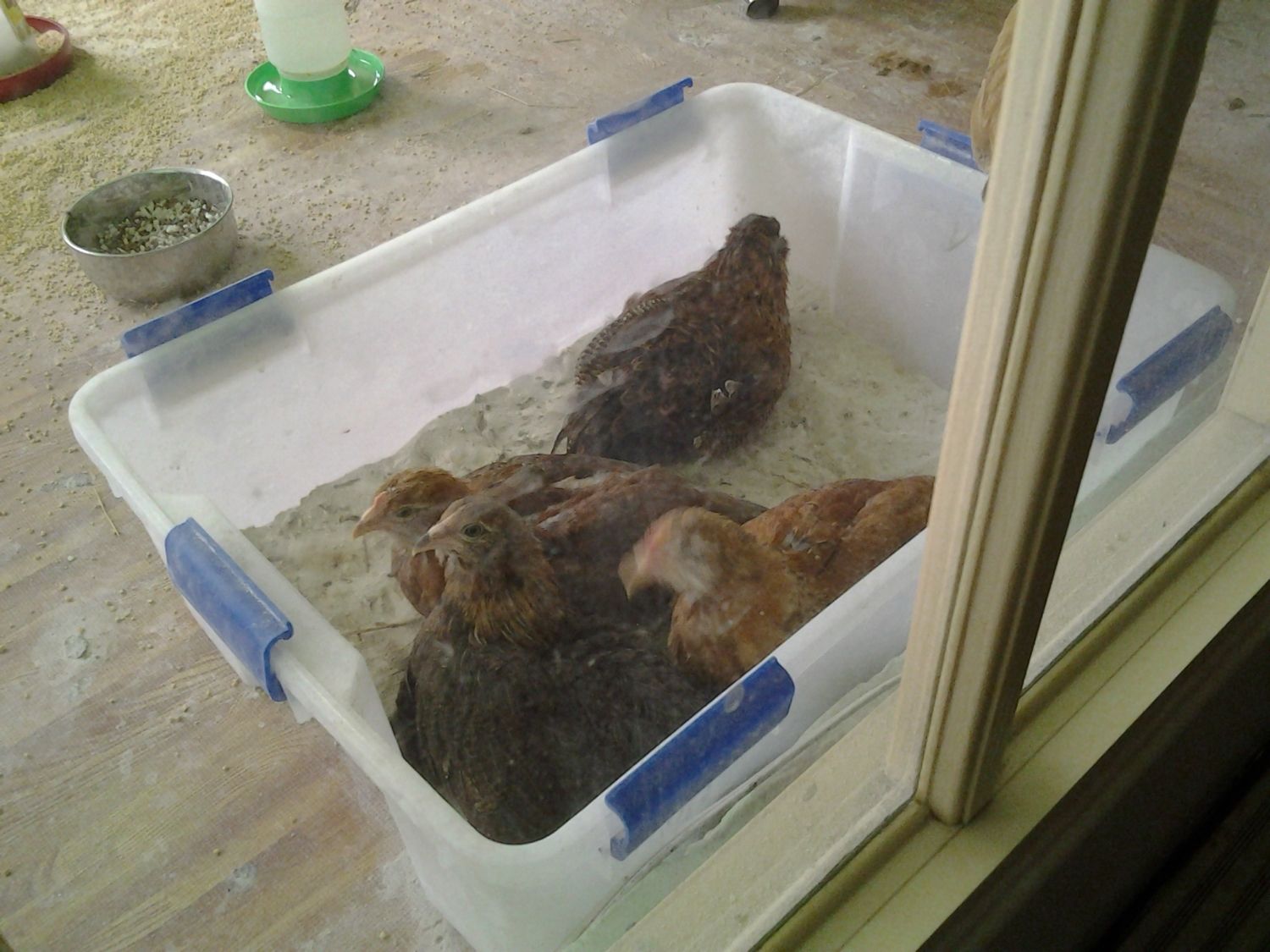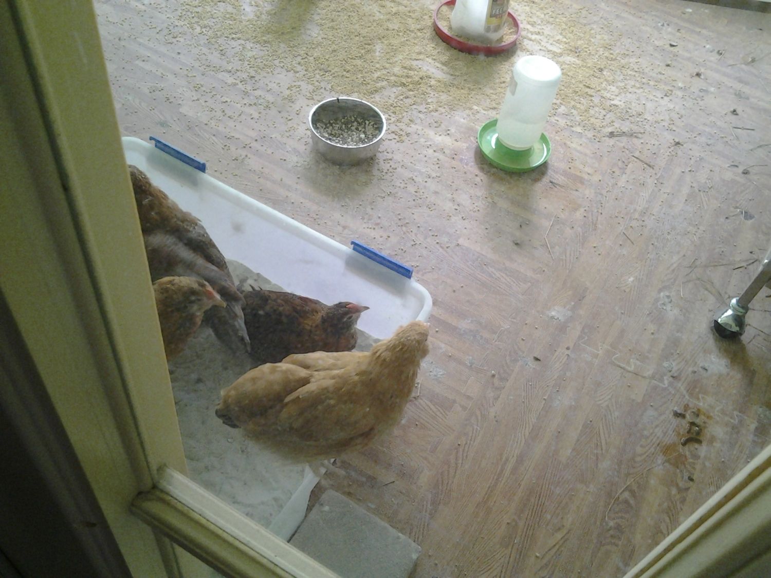 These chickies are on the patio since the hawk took one right out from underneath my nose. I can't believe it was so brazen. I also have a dutch bantam hen, Shirley, living on the patio in a parrot cage since she was attached by a hawk six months ago. I was fortunate to save her but can't let her live in the big coop with the big girls. She is the lowest hen in the pecking order. Besides that my boys race to her and knock her out practically from chasing her and climbing all over her trying to mate. She weighs less than a pound. The chicks on the patio with her are 9 weeks old and already larger than her. I've gone a little chicken crazy.