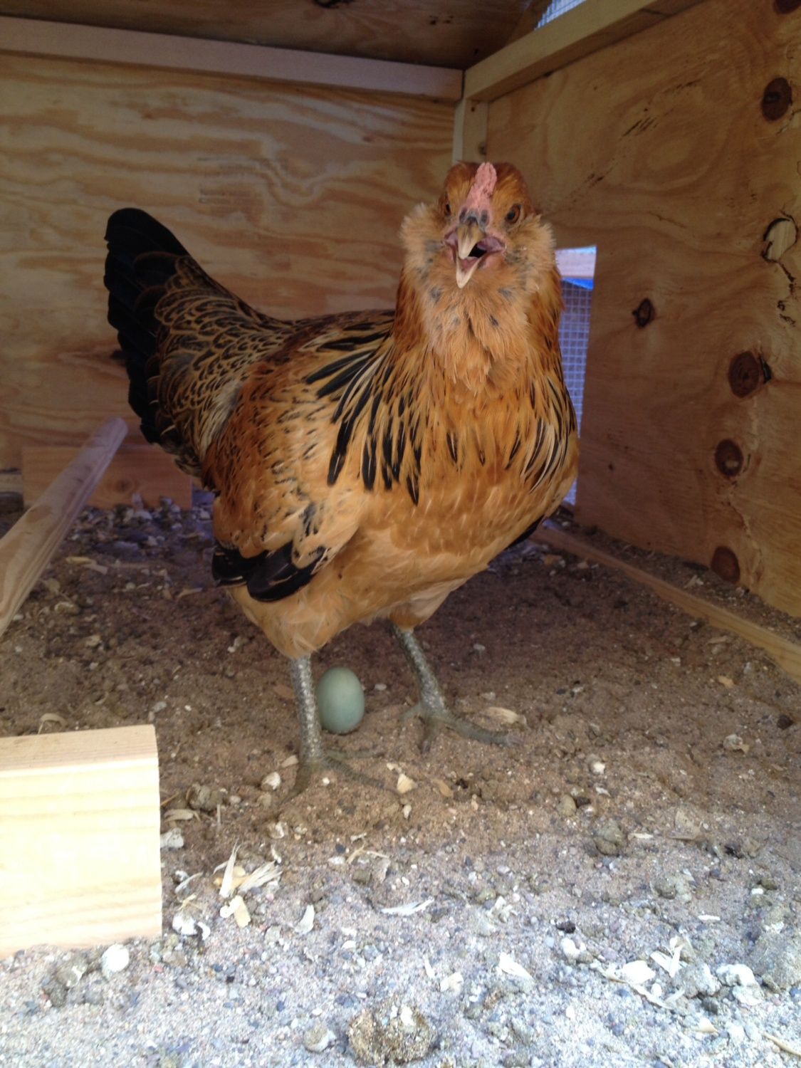 Well I haven't built the egg boxes onto my coop yet. I didn't think my chickens were going to start laying until he end of August. I thought I had plenty of time! Yesterday we found our first egg on our back patio from one of the other chickens. After that happen I put a crate inside the coop with some pine shavings for bedding along with a golf ball for encouragement to lay there. My EE did go into the box, but chose to not lay there.
