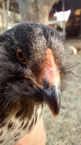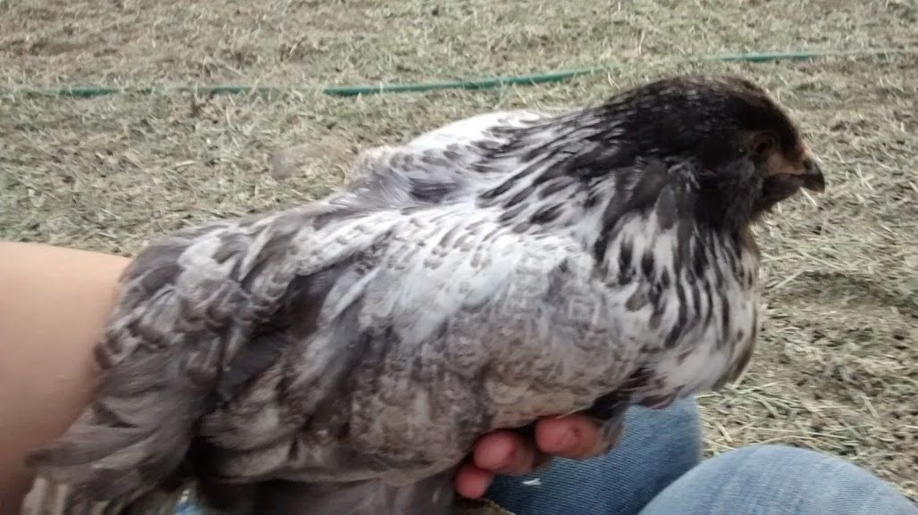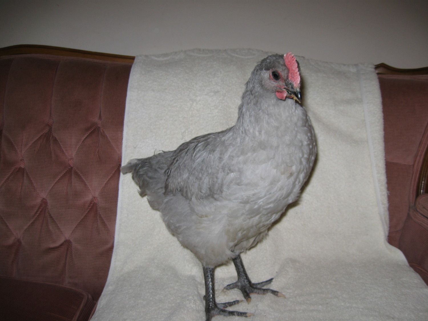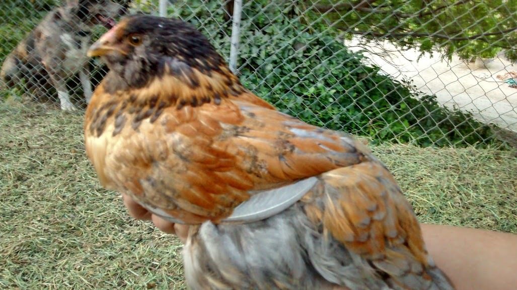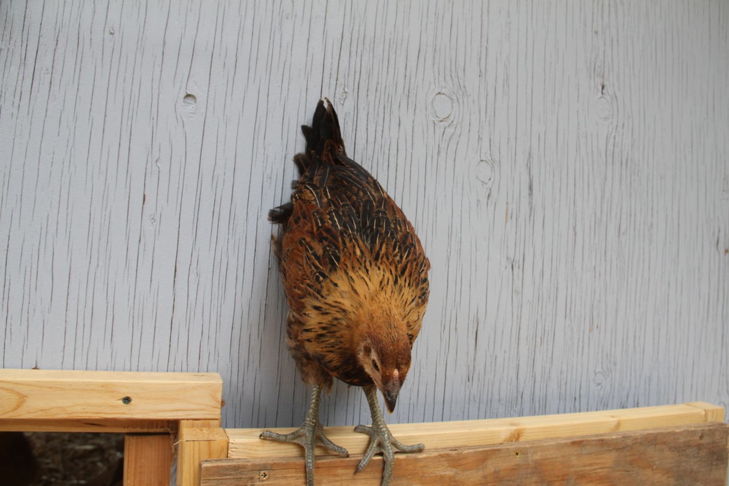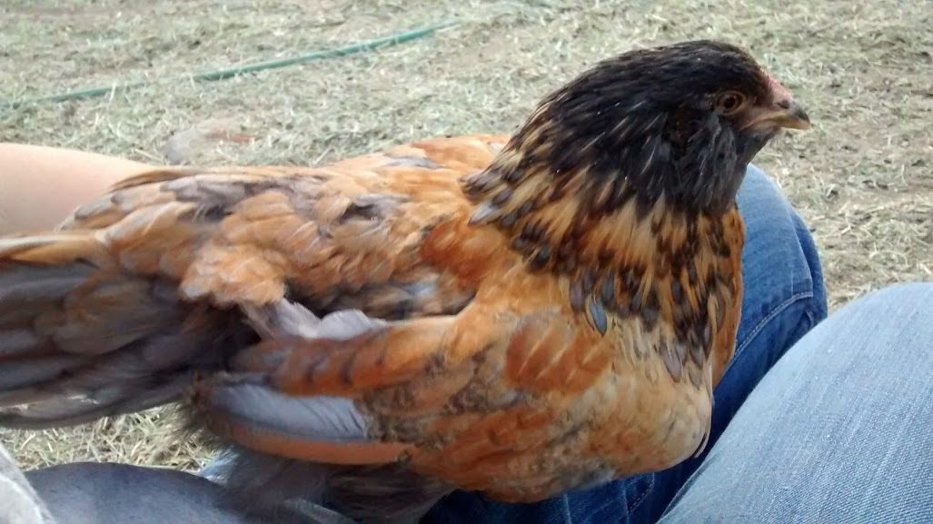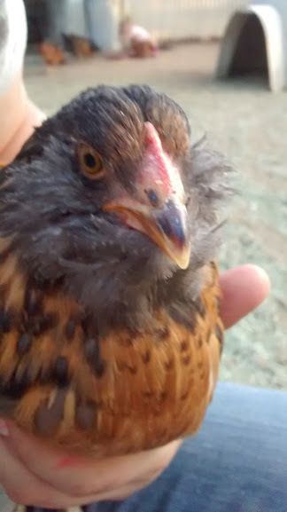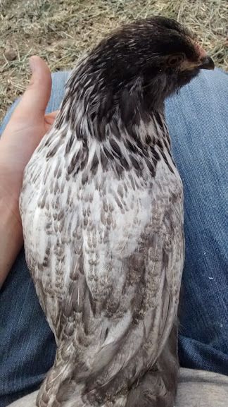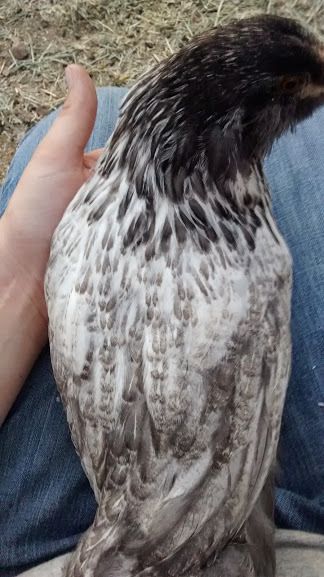 Chicken-Hawk is a bit bigger than everyone else, but I don't really think you can use that as an honest to goodness roo indicator. I have a BSL that started off the runt and at 4 weeks exploded into monster chicken and has been much larger than her girlfriends ever since. Anyways, she doesn't have any dark red and is mostly that burnt orange looking color throughout, with some bluish underneath. I think she has a single comb? Not sure as I'm still green to all this chicken stuff. It's still really pale.