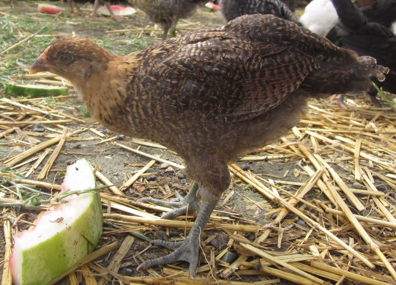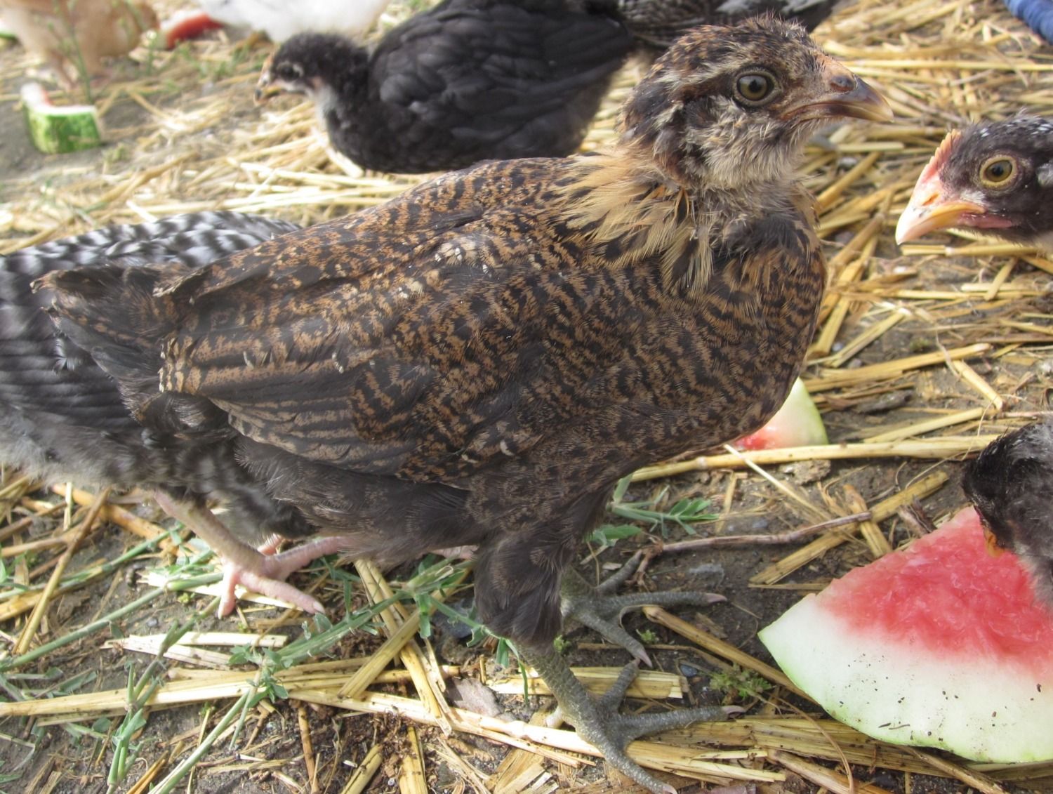 Here are my 5 EEs, they are 5 weeks old and I am still trying to guess if they are pullets or cockerels. I am pretty sure #2 the black and white one is a cockerel just by the patchy coloring and I am not sure about #5 because she has always been very independent and has a red chest but please give me your opinion's as I am just guessing. And yes they are eating cold watermelon because it is 100 degrees outside.
