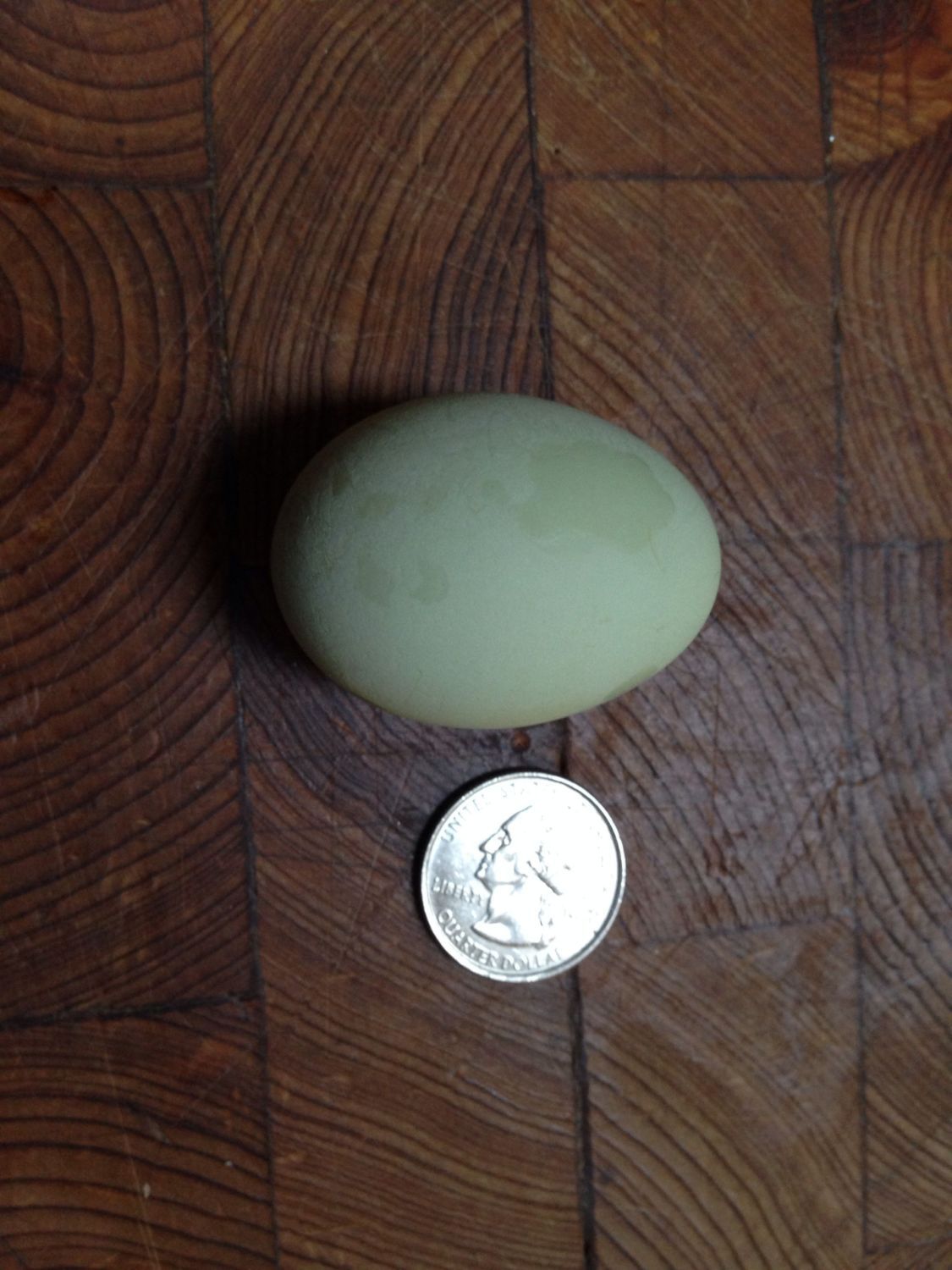 One of my sweet chicks laid their first eggs today!!! We have 2 EE, 2 Barred rocks, 2 bsl, 2 rsl, and a Wyandotte, and a d'uccle bantam. The egg is such a pretty green. Any guesses of which breed laid the first egg?