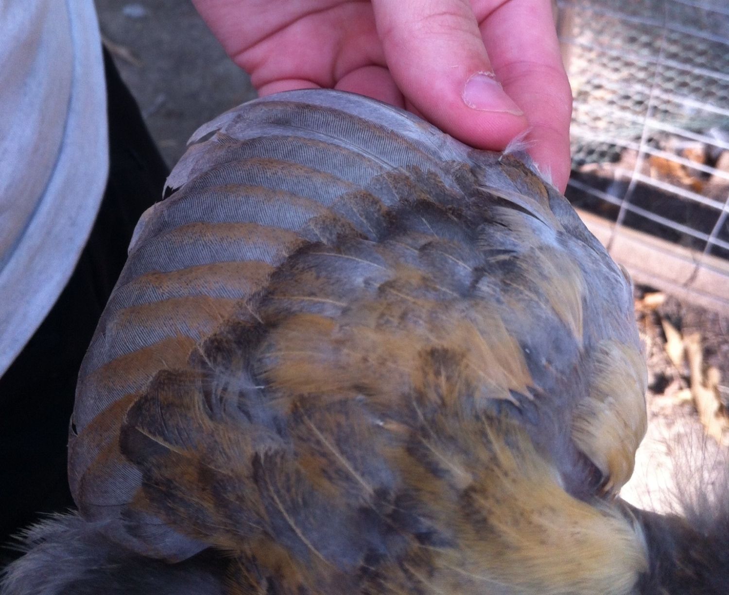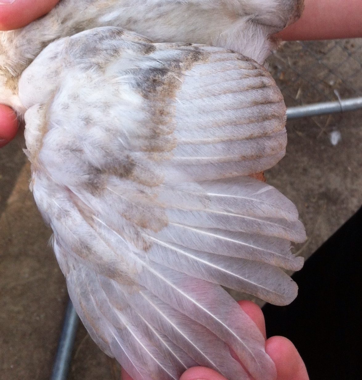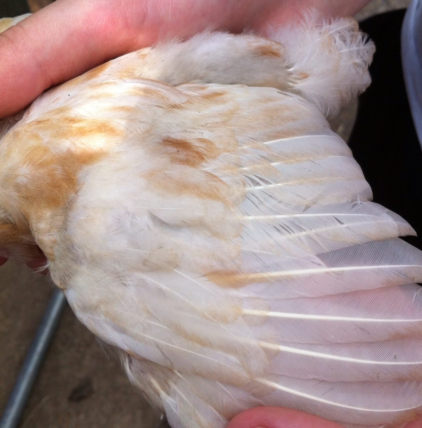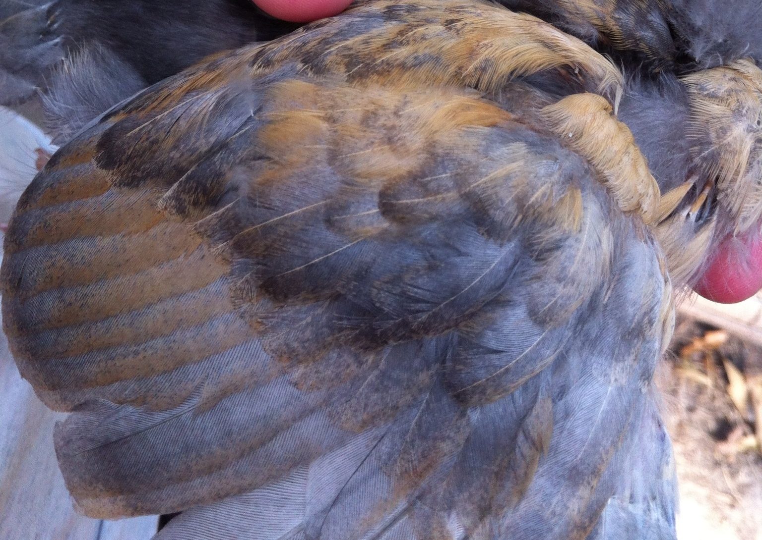 Wishing4Wings, you got me thinking... I went back out and took pics of the wing. I'm waiting for them to upload. It does look splotchy, but what do I know lol. Actually of the EE patterned chicks look to be the same pattern. I hope you all don't mind if I post the other wing shots. The other two have single combs, so nothing really to look at there, but I do have pics of all of them.