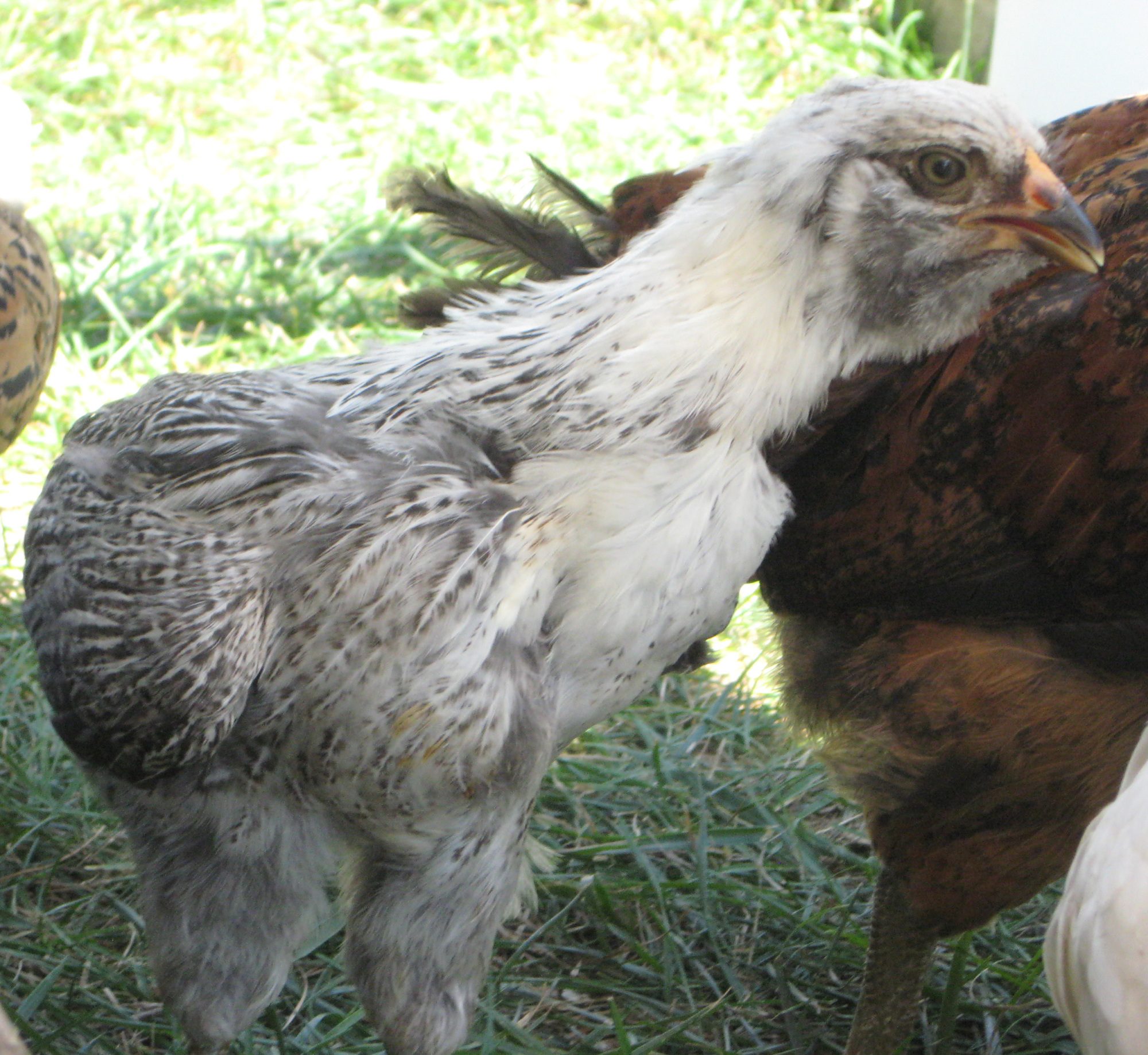 I bought these girls at a bird/plant/feed store. They had been caged for only two weeks for the first three I bought and four weeks for the other three I bought. The lady had got them from someone else. I tried, but couldn't get a hatch date, vaccination status, or any others information other than they were supposed to be about 5 1/2 months old on Oct 2, 2014. I have no idea about their environment before then.If these pullets are from a hatchery and have been mostly caged, you probably don't need to worry about worms yet, unless you see some symptoms. I wouldn't treat for mites unless I saw some on them or signs that they have them. Do you have a place for them to dust bathe? Mostly they will take care of themselves by bathing, but it's always a good idea to check regularly for mites. The prickly things on Joonie's neck were probably some pin feathers coming in. They look like porcupine quills.