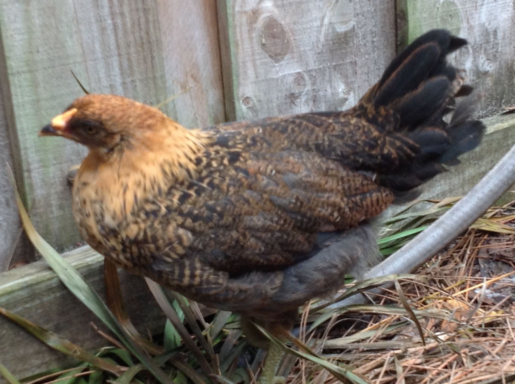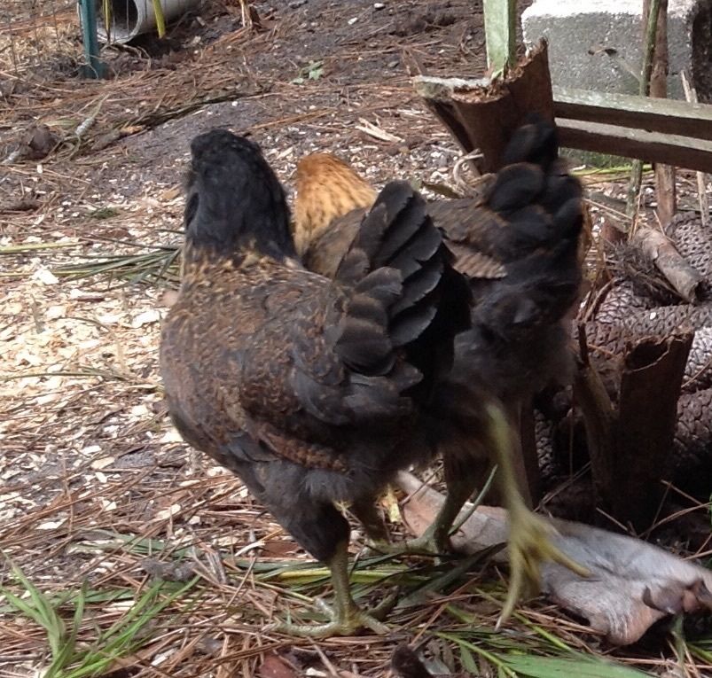My tale has a sad ending, though. A brutal hawk attack killed the golden one last month. The 2 remaining kept searching for their missing friend. Each night they'd call out & wait outside the coop for their friend 'til almost dark. I found it hard to believe that the hawk got the fastest of the 3 & left the slow white one alone. Now (at age 22 weeks) the 2 remaining Amigos stay closer to the flock under the protection of the roo. They're not in the middle of it all, but more around the edges of the flock.
