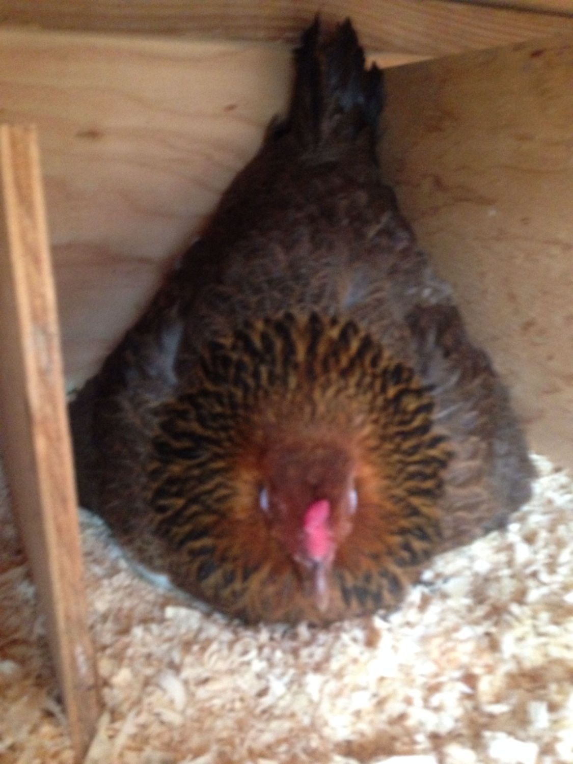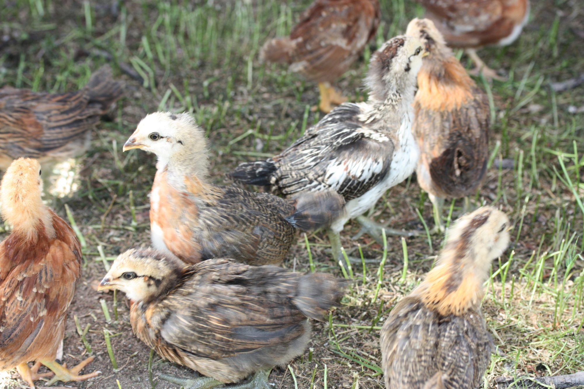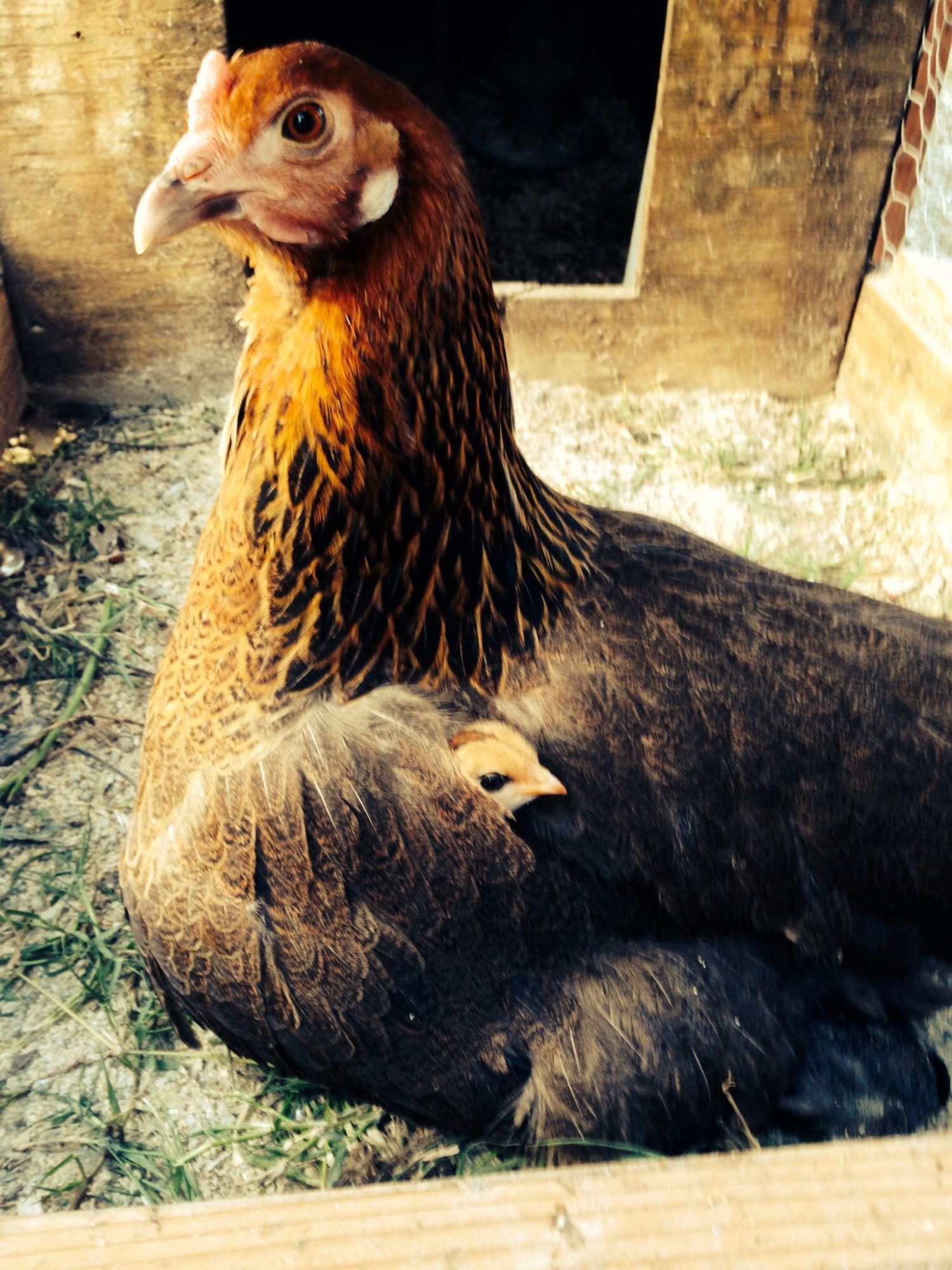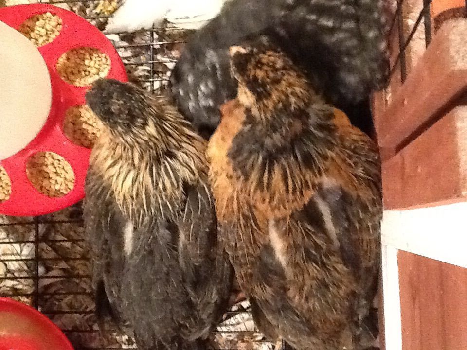 What breed is your hen ? Mine just hatched 9/10 and she looks like your ladyI would need to see a better picture of the brown ones wings, but here are my closest looking kids at that age, and again as adults, hope this helps. The reddish chest at this point freaked me out, but now she is my first broody mama with baby chicks, lays blue-green eggs. Couldn't believe her blond went to black!![]()