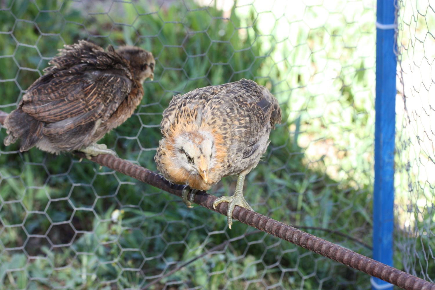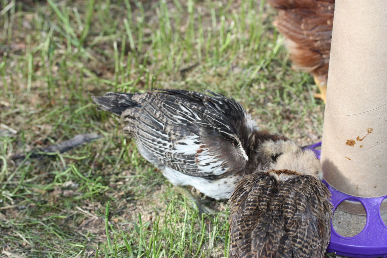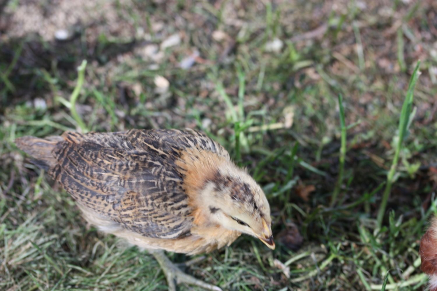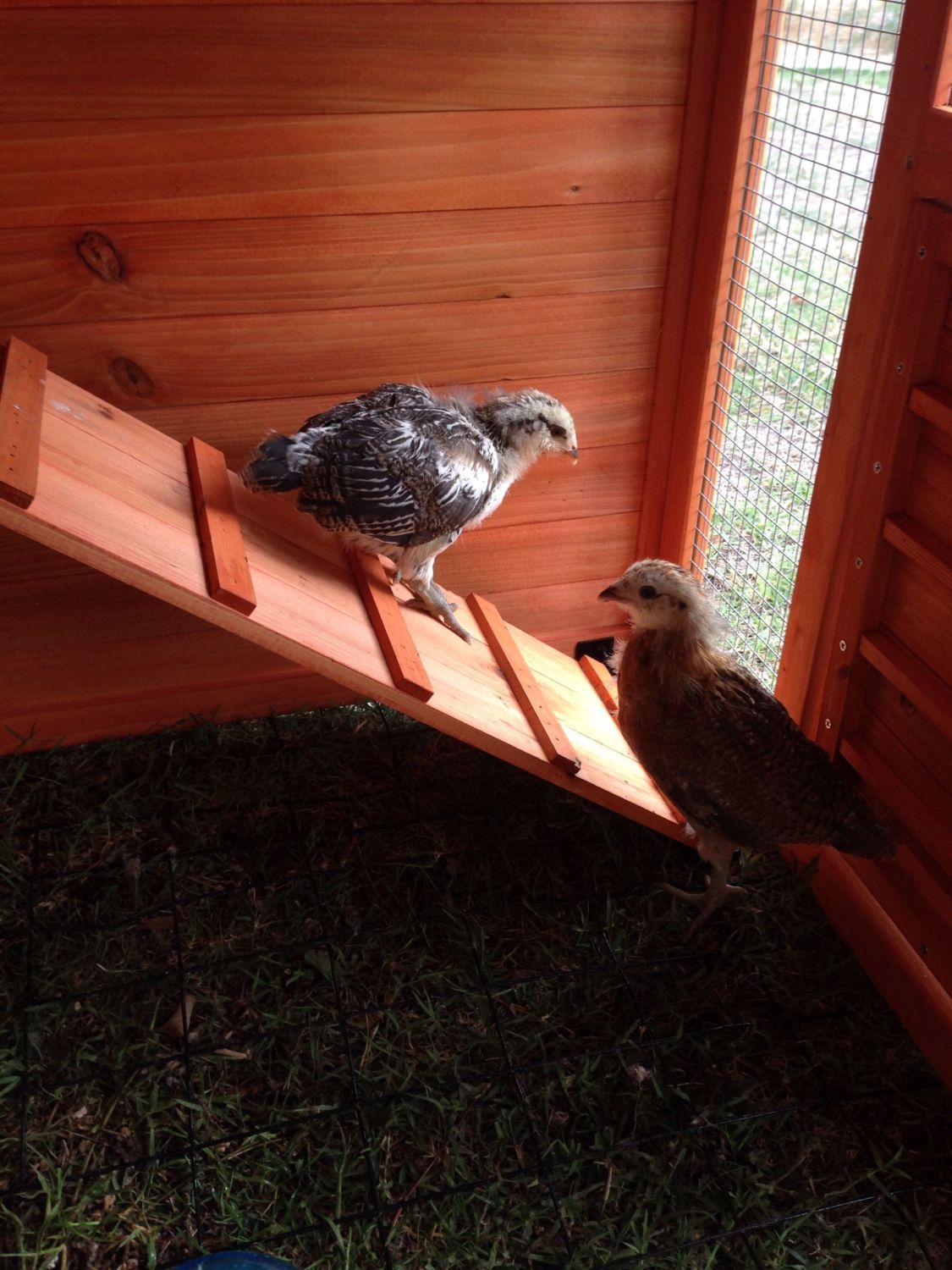 What breed is your hen ? Mine just hatched 9/10 and she looks like your ladyI would need to see a better picture of the brown ones wings, but here are my closest looking kids at that age, and again as adults, hope this helps. The reddish chest at this point freaked me out, but now she is my first broody mama with baby chicks, lays blue-green eggs. Couldn't believe her blond went to black!![]()