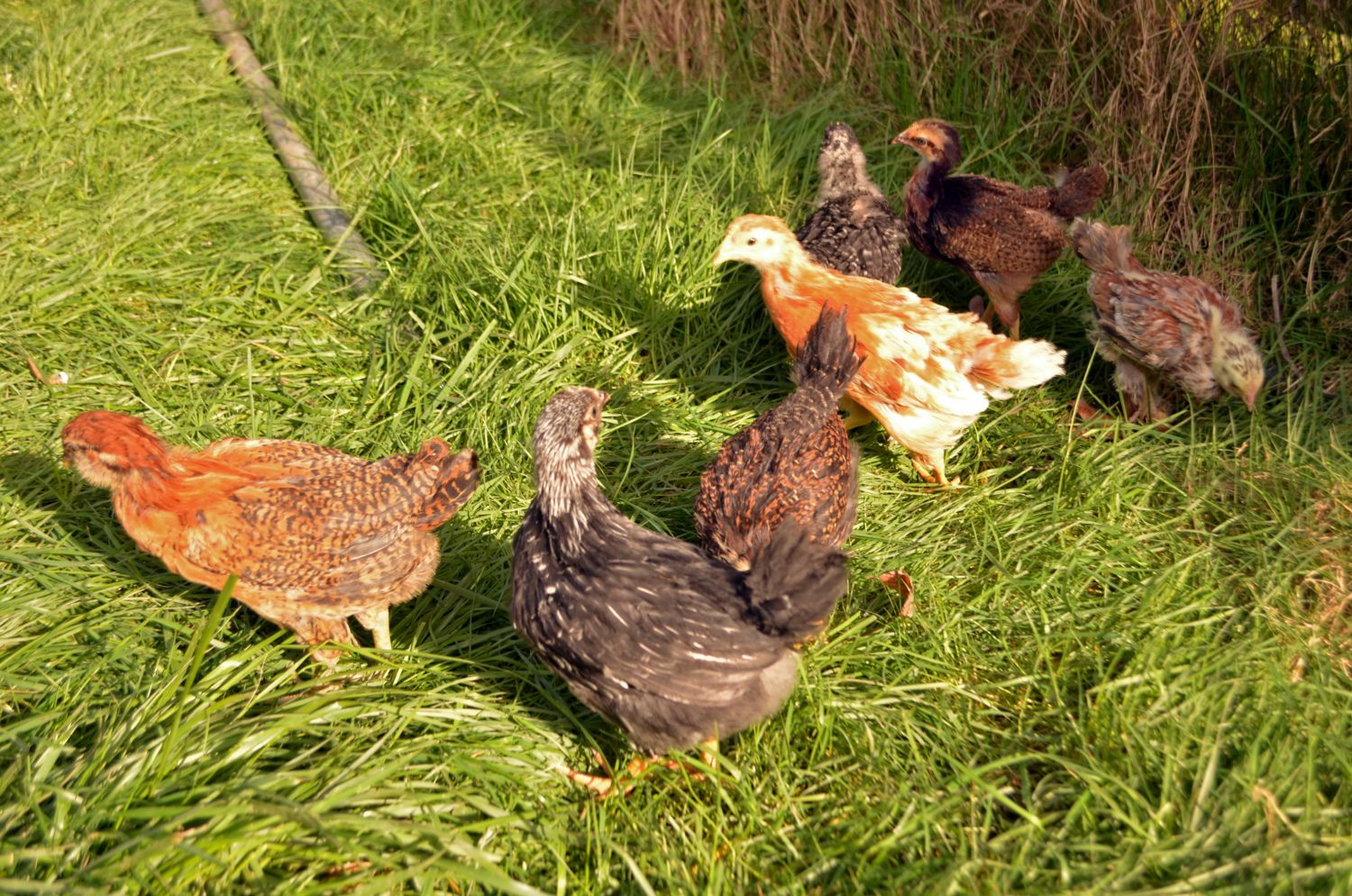 Ok, my 3 EE chicks are officially adopted. Here are pictures. They are supposed to be all pullets, but if anyone thinks I have a boy let me know. Although at 1 week old it is a little early to tell yet I think. I'm still deciding on names, so right now they are light, medium, and dark.