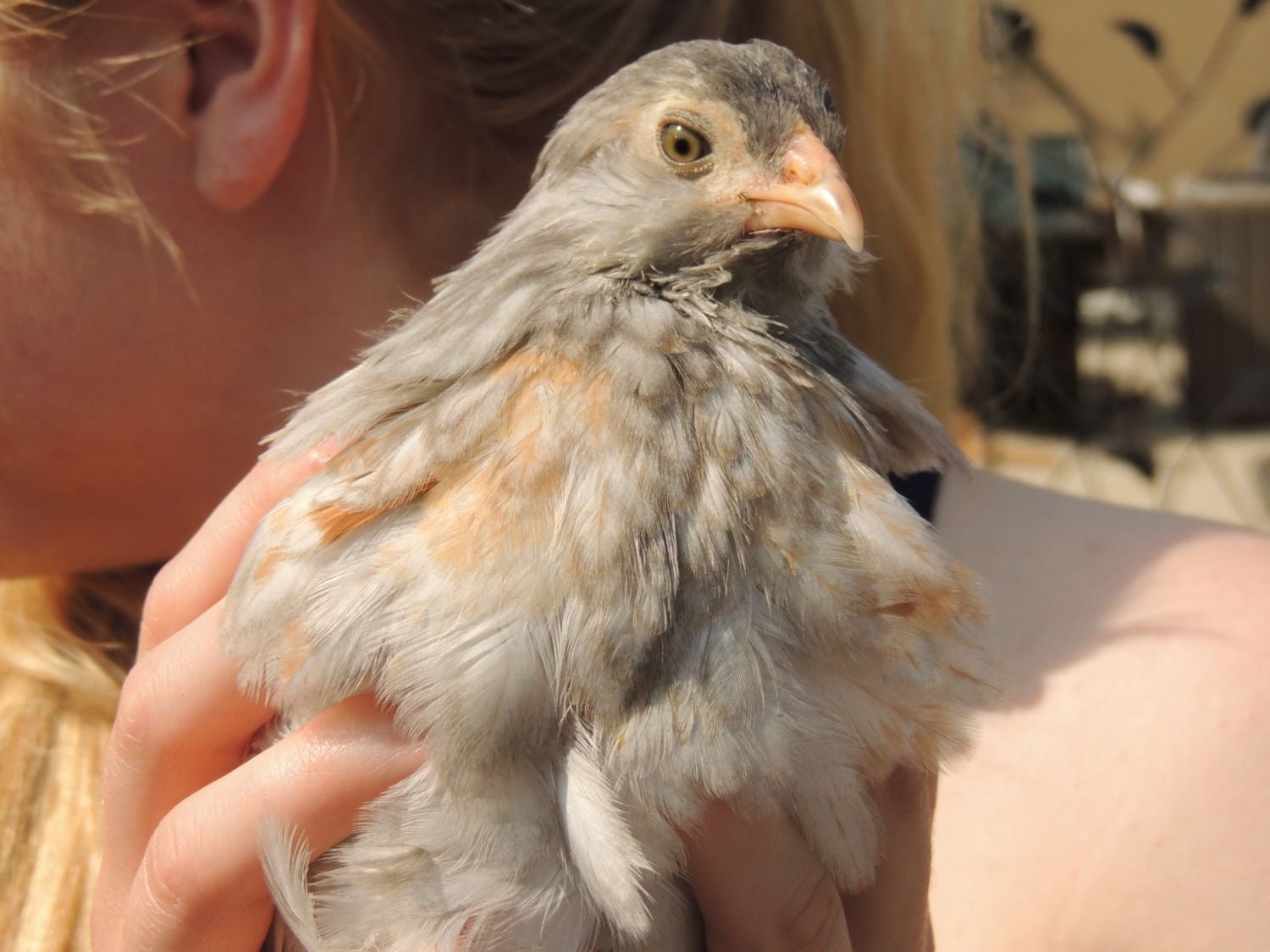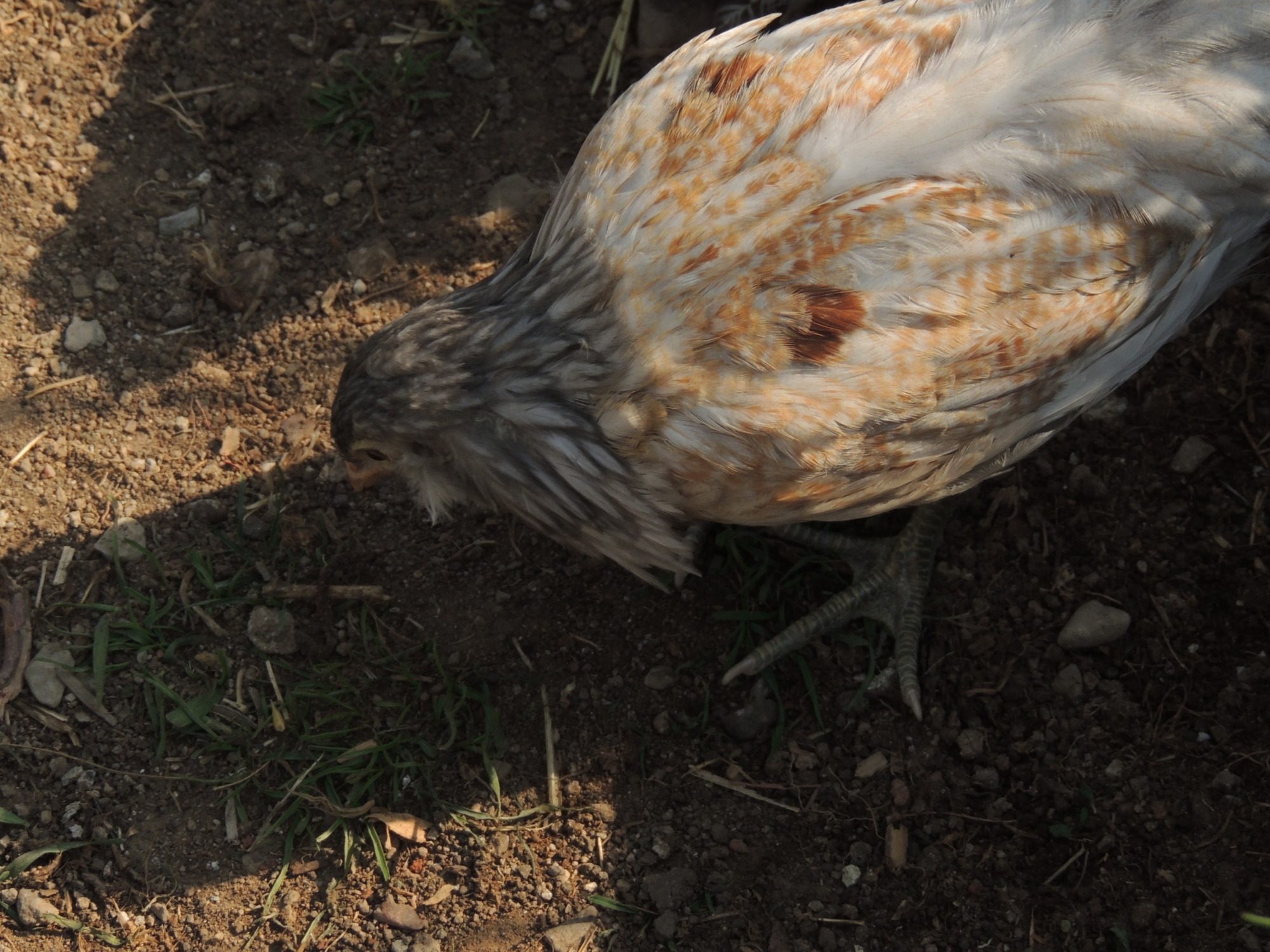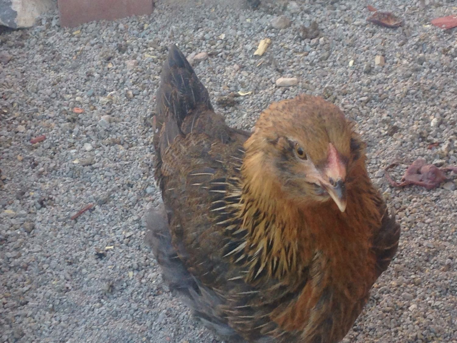 He's always puffing up his feathers and standing between me and the hen. He makes her sit down in the corner if I get too close. You can see a few wayward head feathers poking out in crazy directions while he's puffing up at me. I'll pet him and smooth them down and back out they come if I don't back away from the tub. He is so mad at us. He just stands there grumbling at us and giving us the stink eye if we're within a few feet of the tub. He's conflicted, he sees us coming and he gets excited, because food. Then he remembers he's mad at us, because of the dog, so the closer we get the more he can't decide if he should be excited about food or if he should peck us. He is healthy aside from the lost feathers and we were going to put him back in the yard, but he and the hen that is injured more seriously are getting along so well. He's not picking at her, and they stay side by side all day. So even though I know his injuries weren't serious and I probably could have put him back outside yesterday, I've left him in with her.