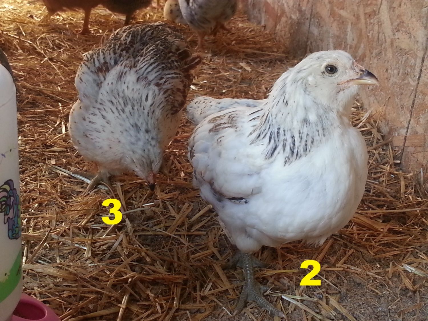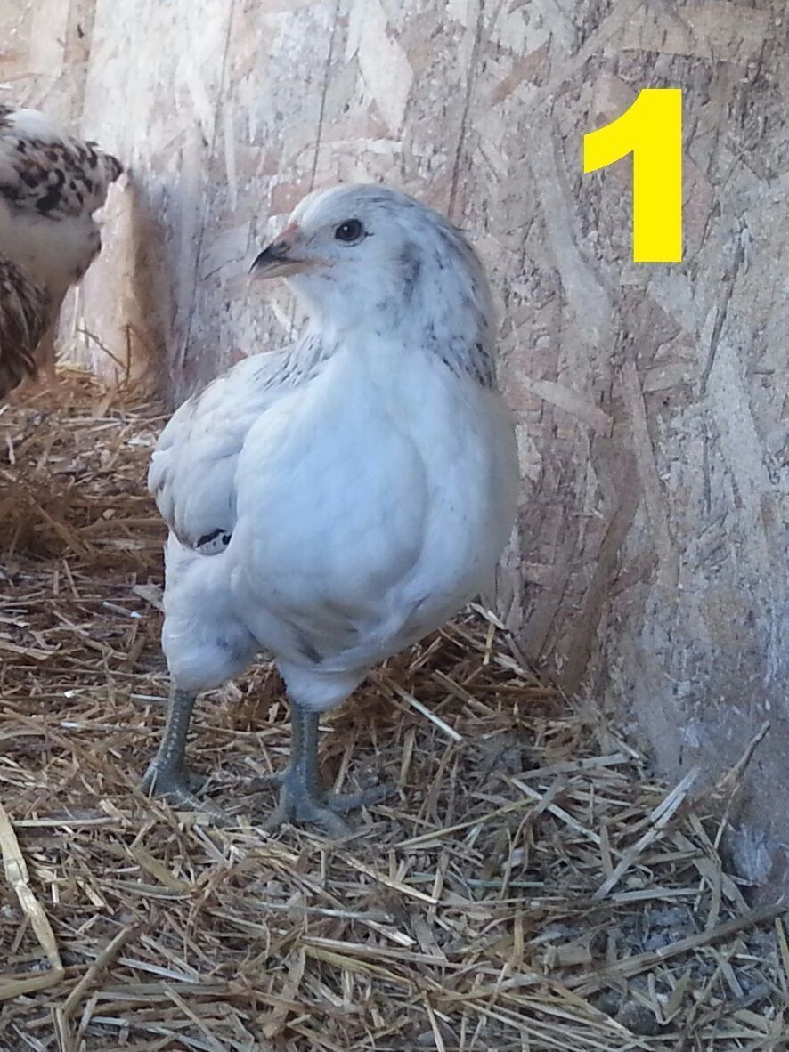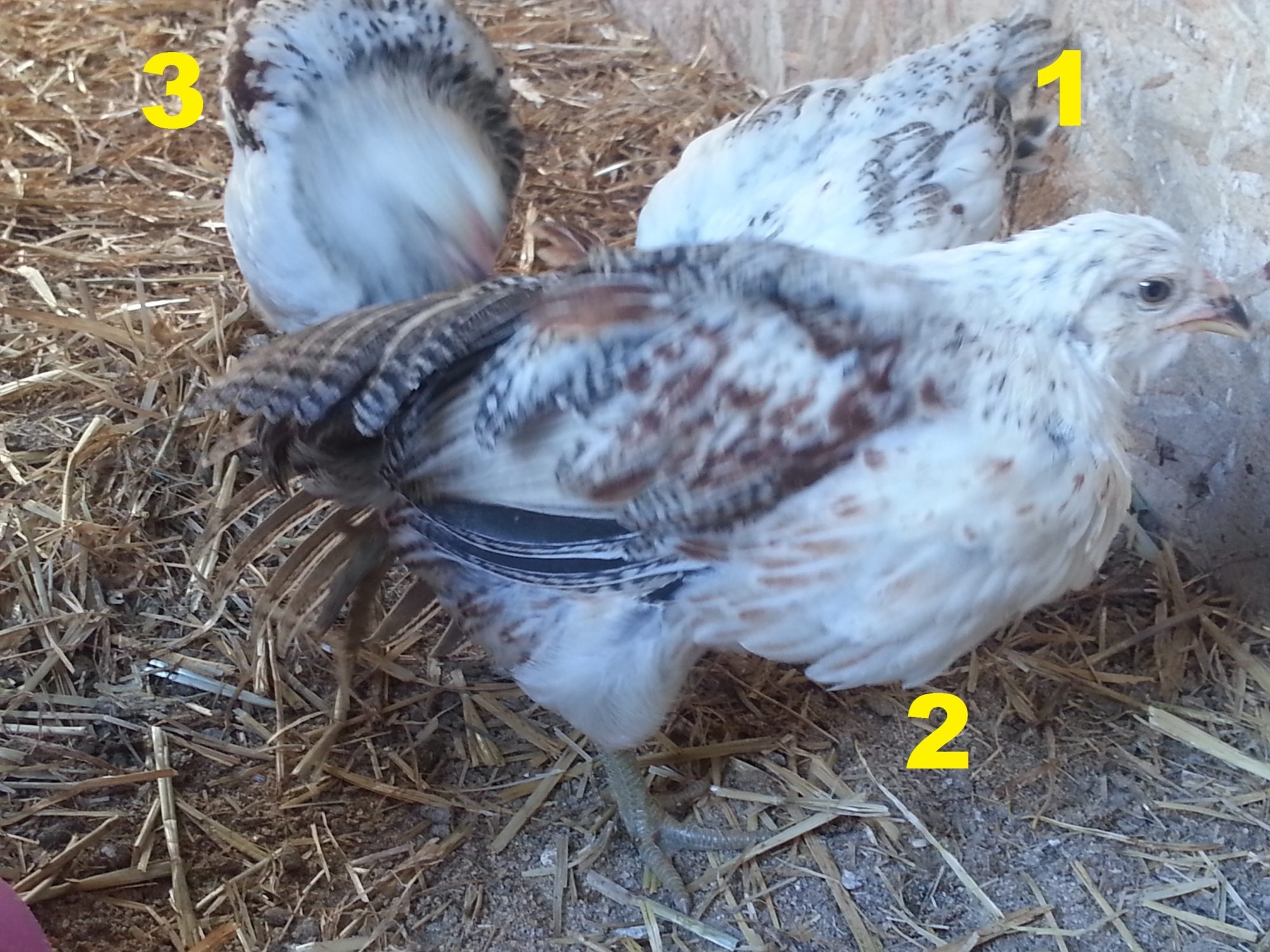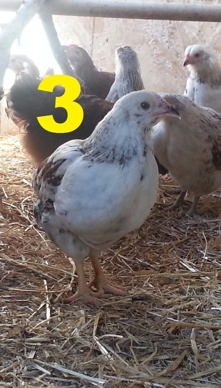 We hatched 8 new EE mixes 7 weeks ago, and I have a few of them figured out "for sure" as males due to their bright red combs, but there are a couple of them that have me stumped. One is a PR/EE mix, the others are "pure" EE (dad was silver, mom partridge). I've numbered them 1-4 below, I'd really appreciate any thoughts about what we've got!