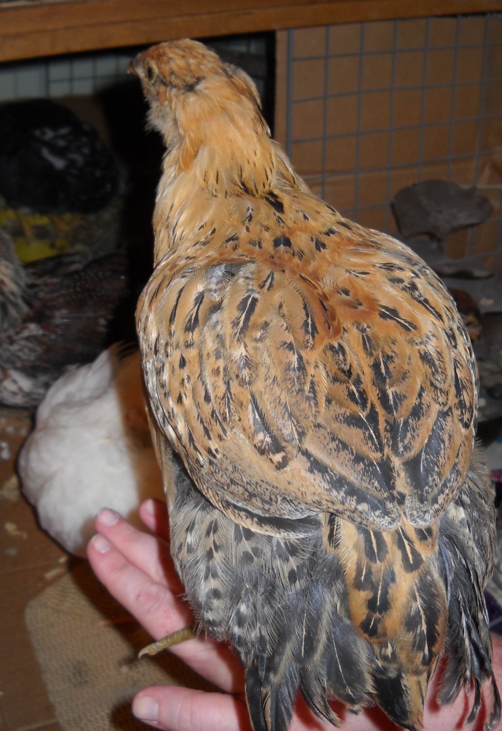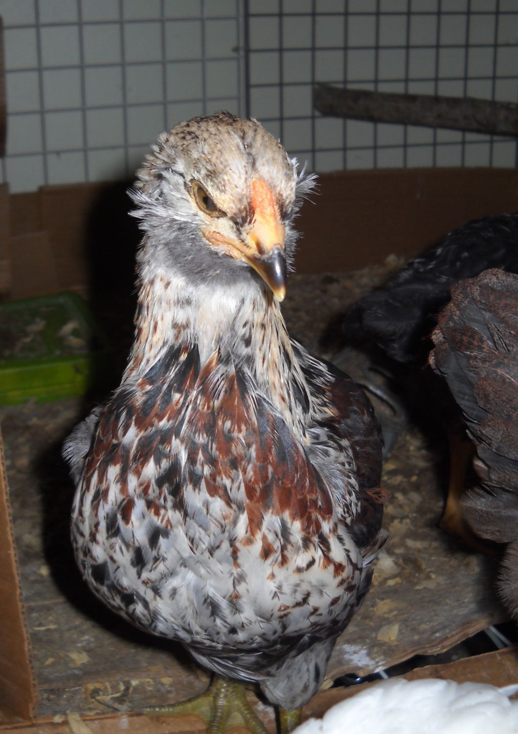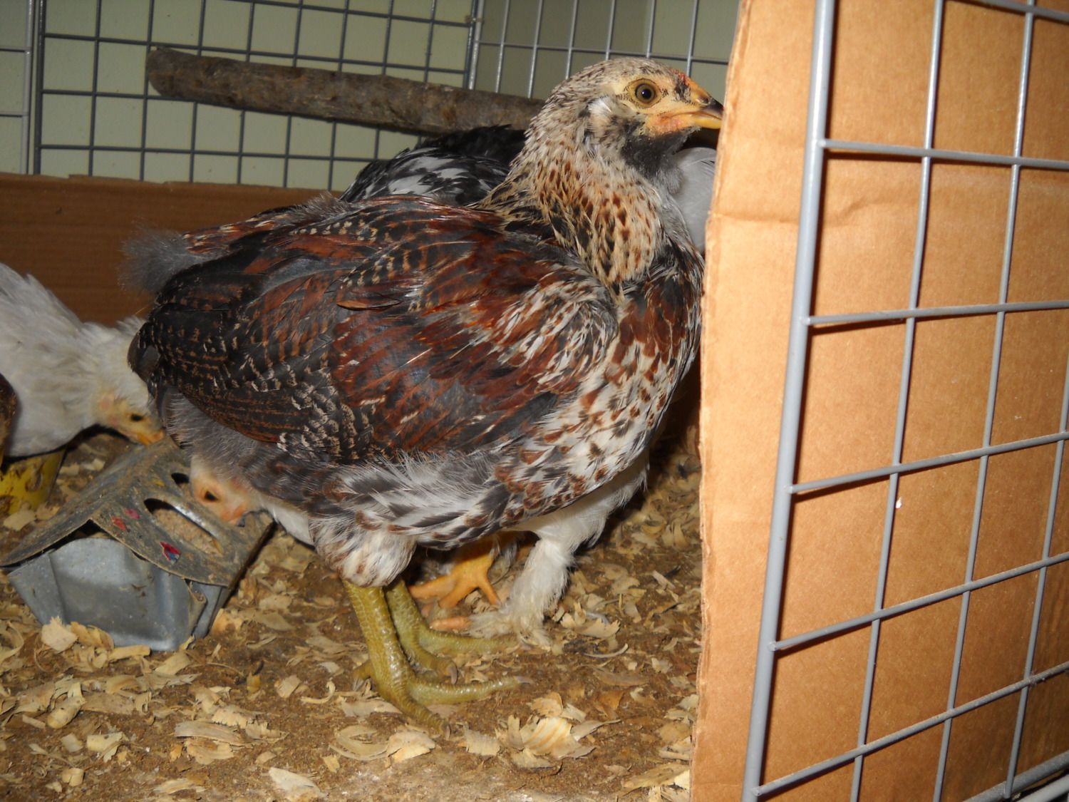 I have two 7-week-old Easter Eggers, Iona and Fiolett. I've been very suspicious of whether or not Fiolett is actually a 'chick' for a while now. Fiolett's legs are much thicker than Iona's (and all of the other chicks') and his/her feathers came in much later. Fiolett also has a much larger and pinker comb than Iona.
