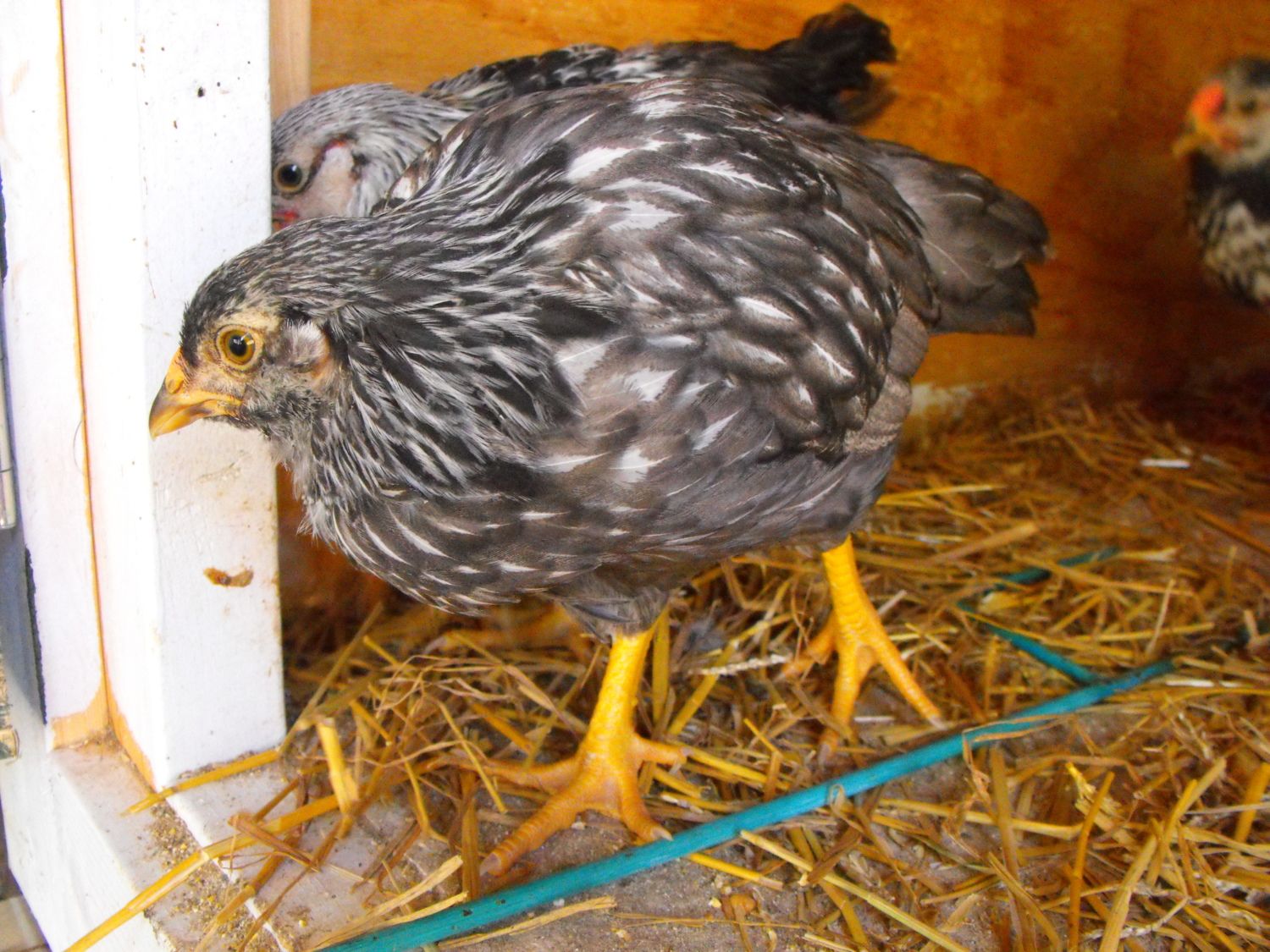 Well I need to take some updated pictures but here are the first two that hatched under my SLW hen. They are about 3 weeks old now. We have 5 of the SLW X EE and they are all a variation of the chipmunk down color right now.
