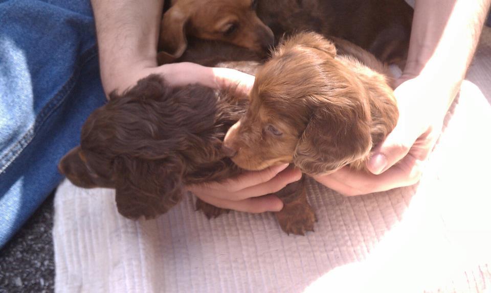 Yesh! Those are 7 week old dachshunds! They are for sale, my "aunt" and her son's dachshunds got busy and weren't supposed to and now they're looking for good homes. The mother is registered, the father is suppose to be but they can't find the papers. They're sooo cute, and so calm for puppies! It actually made me want one...