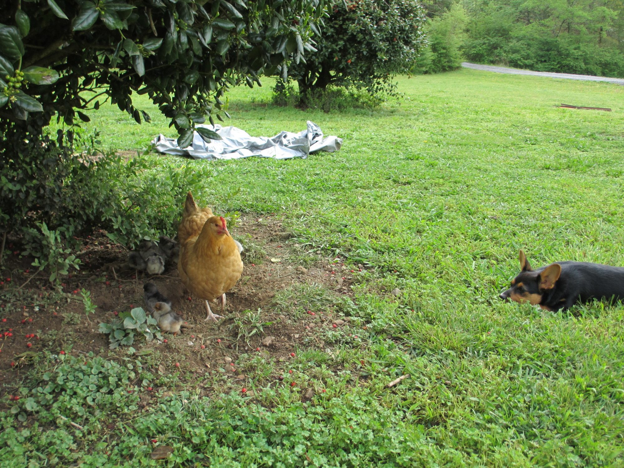 Buffy the BO with 12 chicks and Livia the corgi just wants to play.