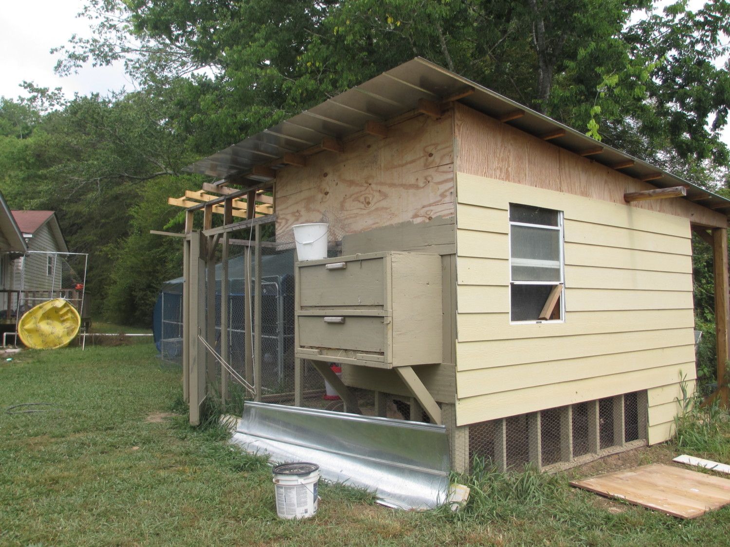 Almost finished with the main coop. Roof panels put on and some more concrete siding.