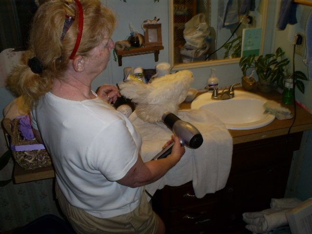 @Chigger...chickens are a breeze compared to getting a horse ready to show. There are a few things you can do (which horse showers do) in preparing your chicken for the show. Like Purple Power shampoo for horses that makes their white really white...same with black and browns.